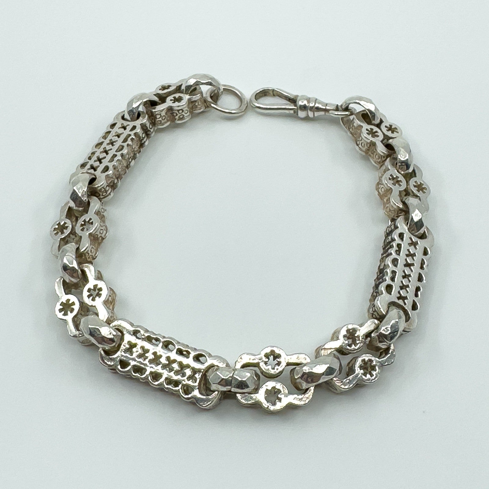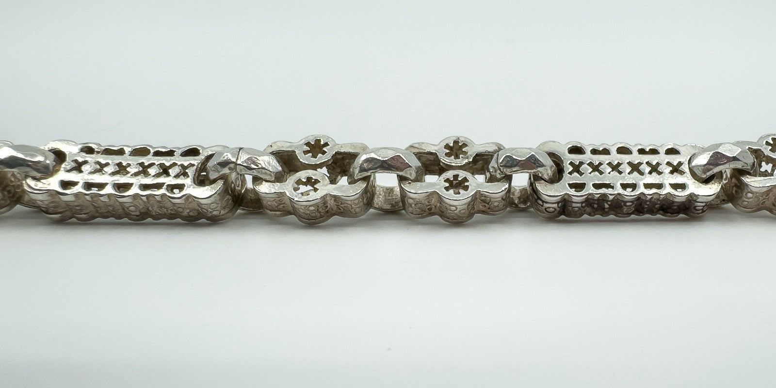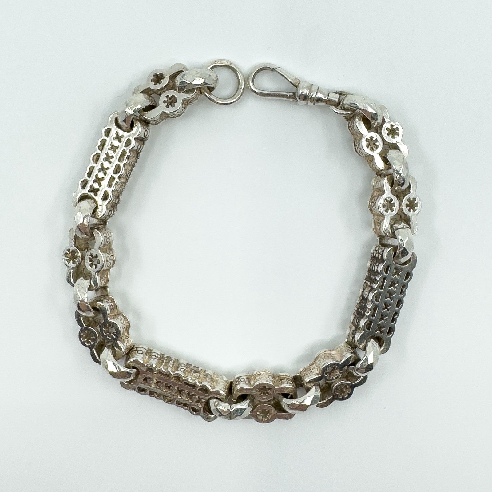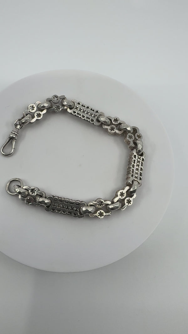 Vintage chunky sterling silver stars and bars bracelet with engraved faceted links between the stars and bars. Complete with a swivel dog clasp for easy attachment and stamped STG 925, CBL, 925 and anchor (Birmingham).