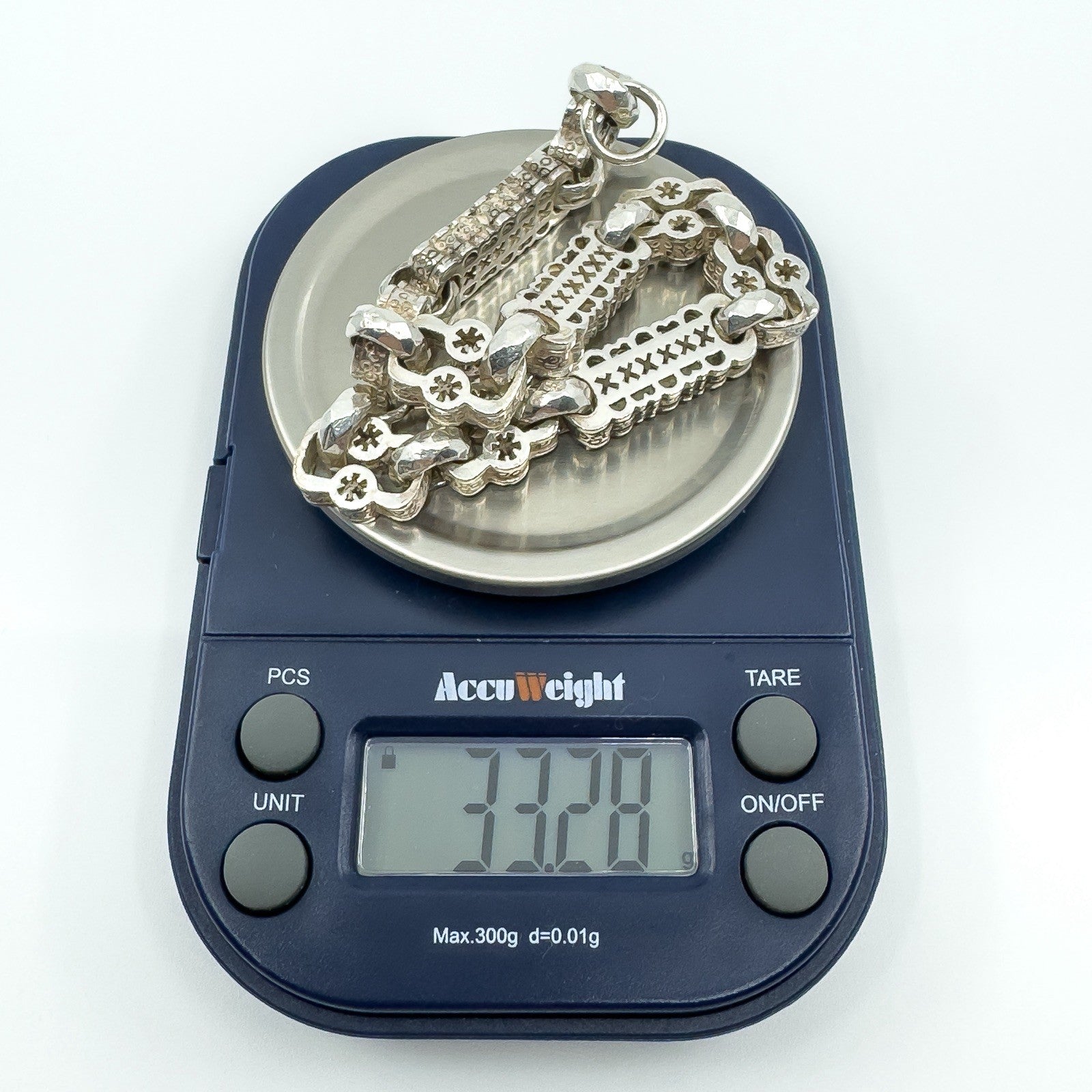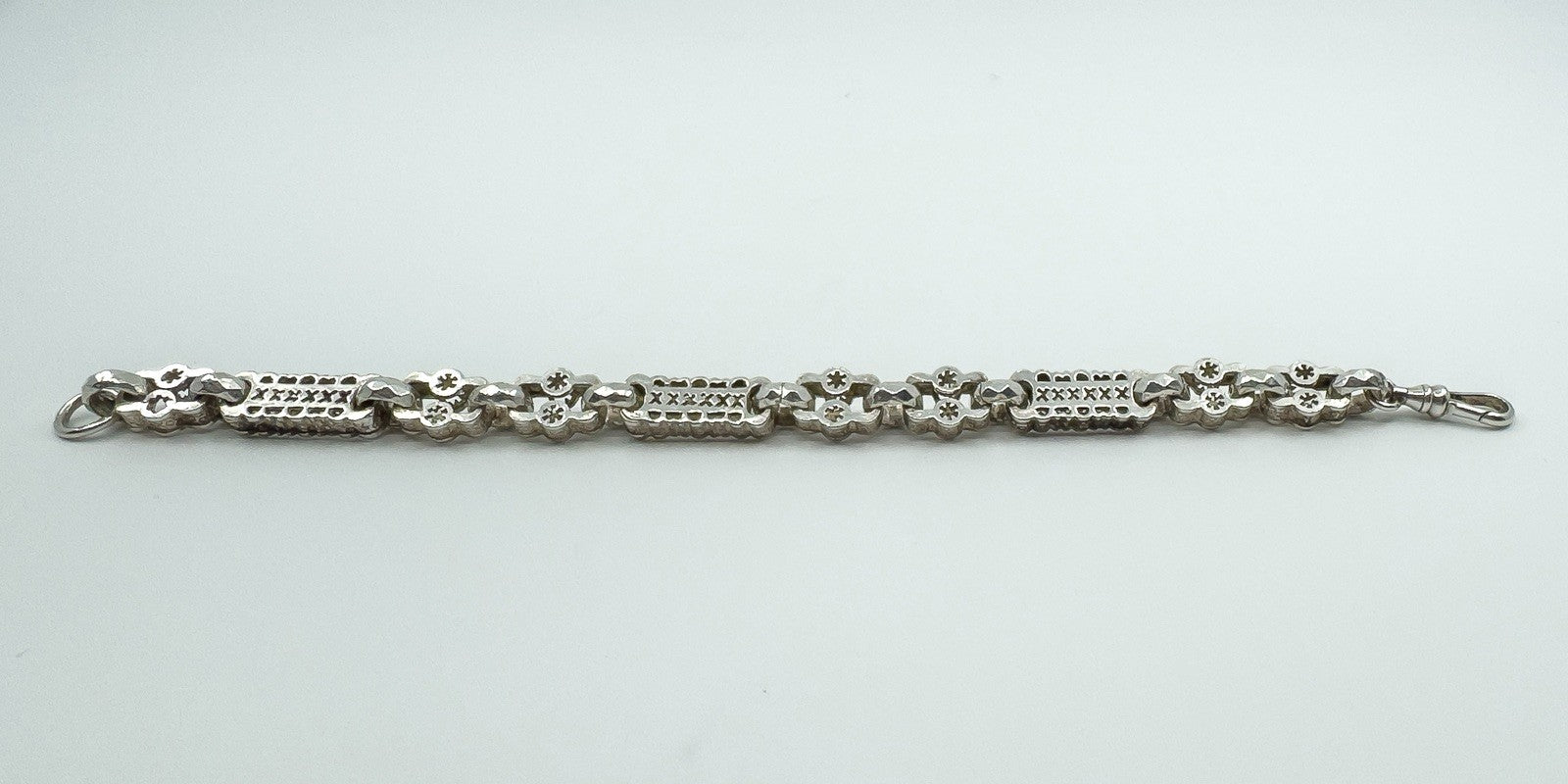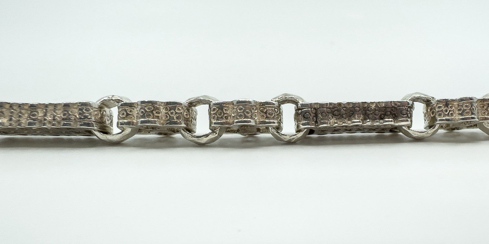 • Vintage chunky stars and bars bracelet • Metal: Sterling silver (925) • Clasp: Swivel dog clasp • Stamps and hallmarks: STG 925, CBL, 925, anchor (Birmingham) • Length: Approx. 8.5 inches • Fit: Will fit an 8” - 9” wrist • Link size: Approx. 8.9mm x 8.6mm • Weight: Approx. 33.8g