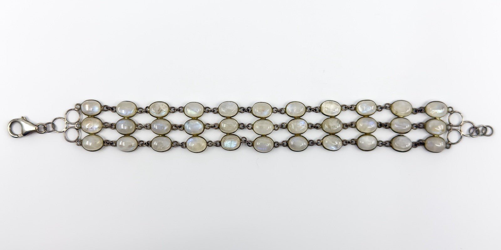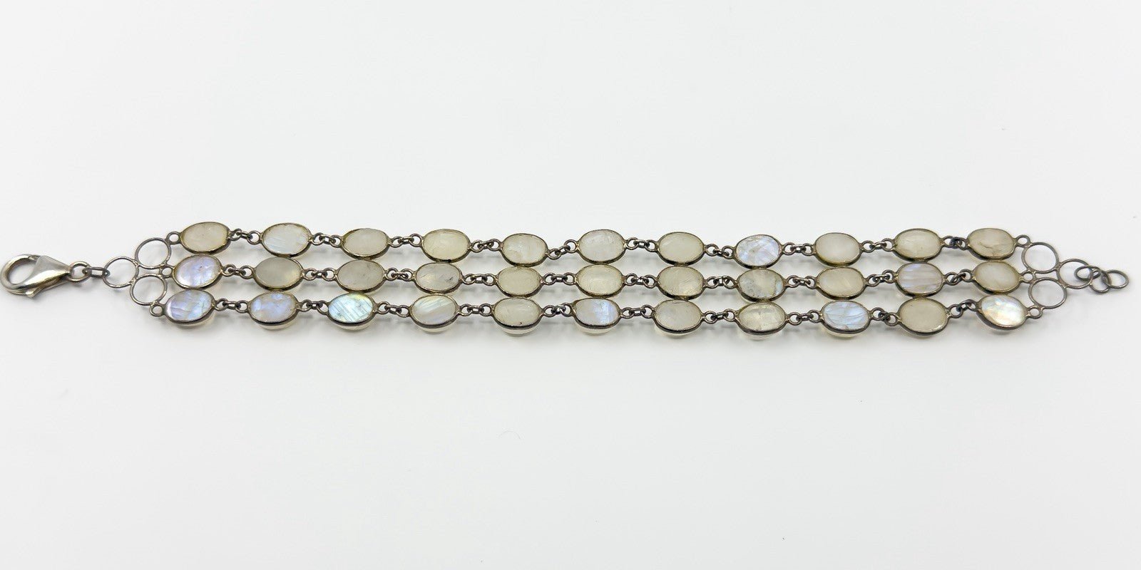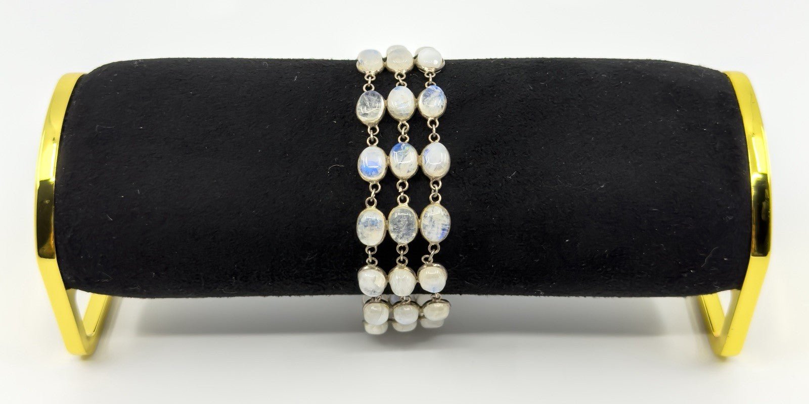 Vintage sterling silver three row moonstone bracelet set with oval cabochon cut moonstones in three rows. Stamped 925 and fitted with a large lobster clasp. There are four adjustment hoops for your preferred length.