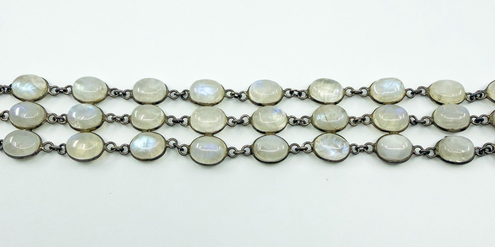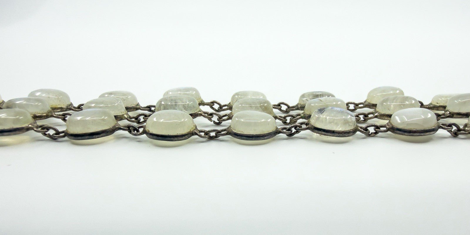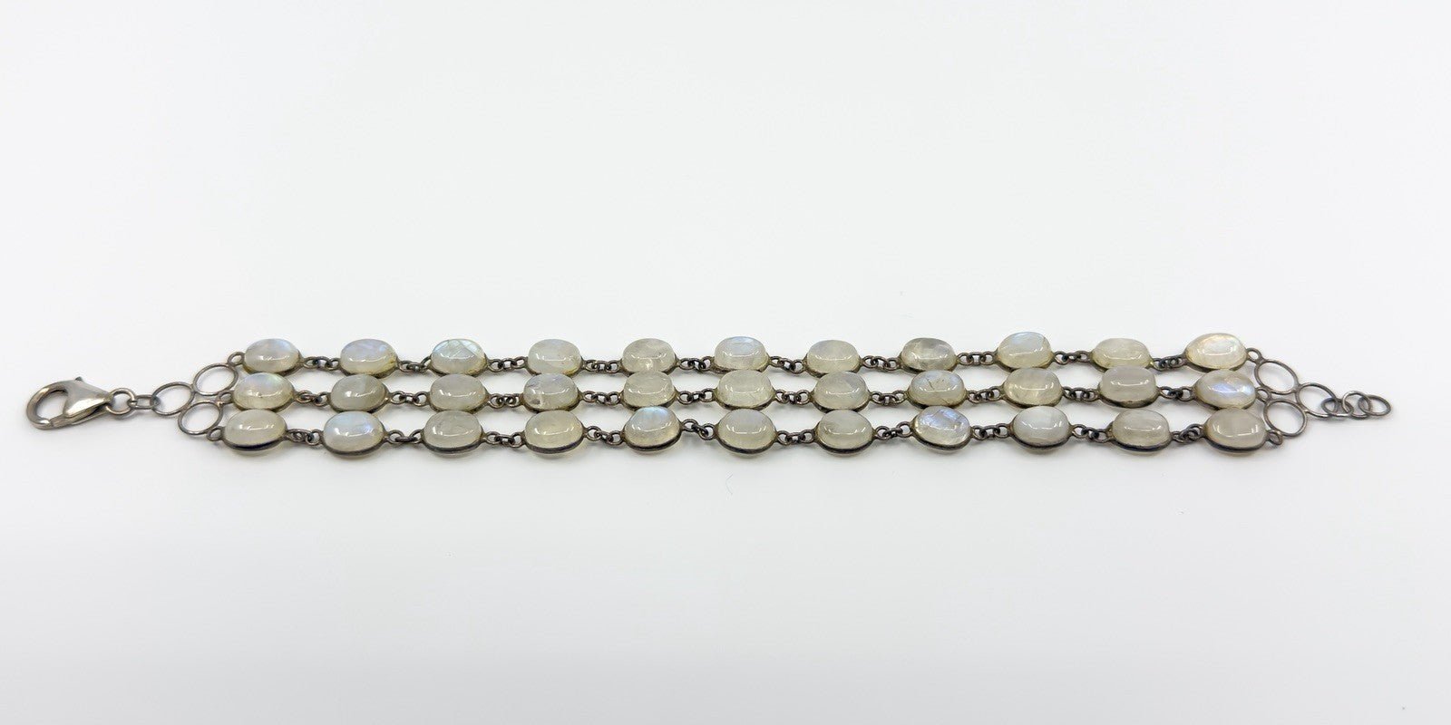 Vintage sterling silver three row moonstone bracelet set with oval cabochon cut moonstones in three rows. Stamped 925 and fitted with a large lobster clasp. There are four adjustment hoops for your preferred length.
