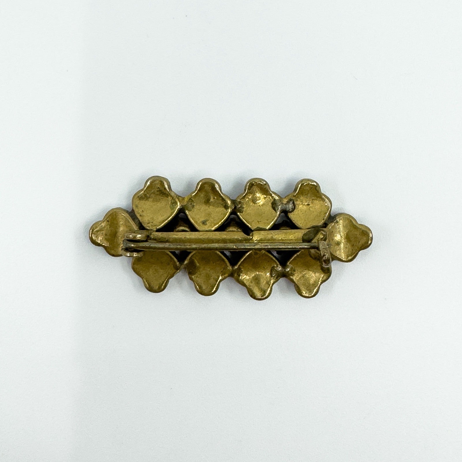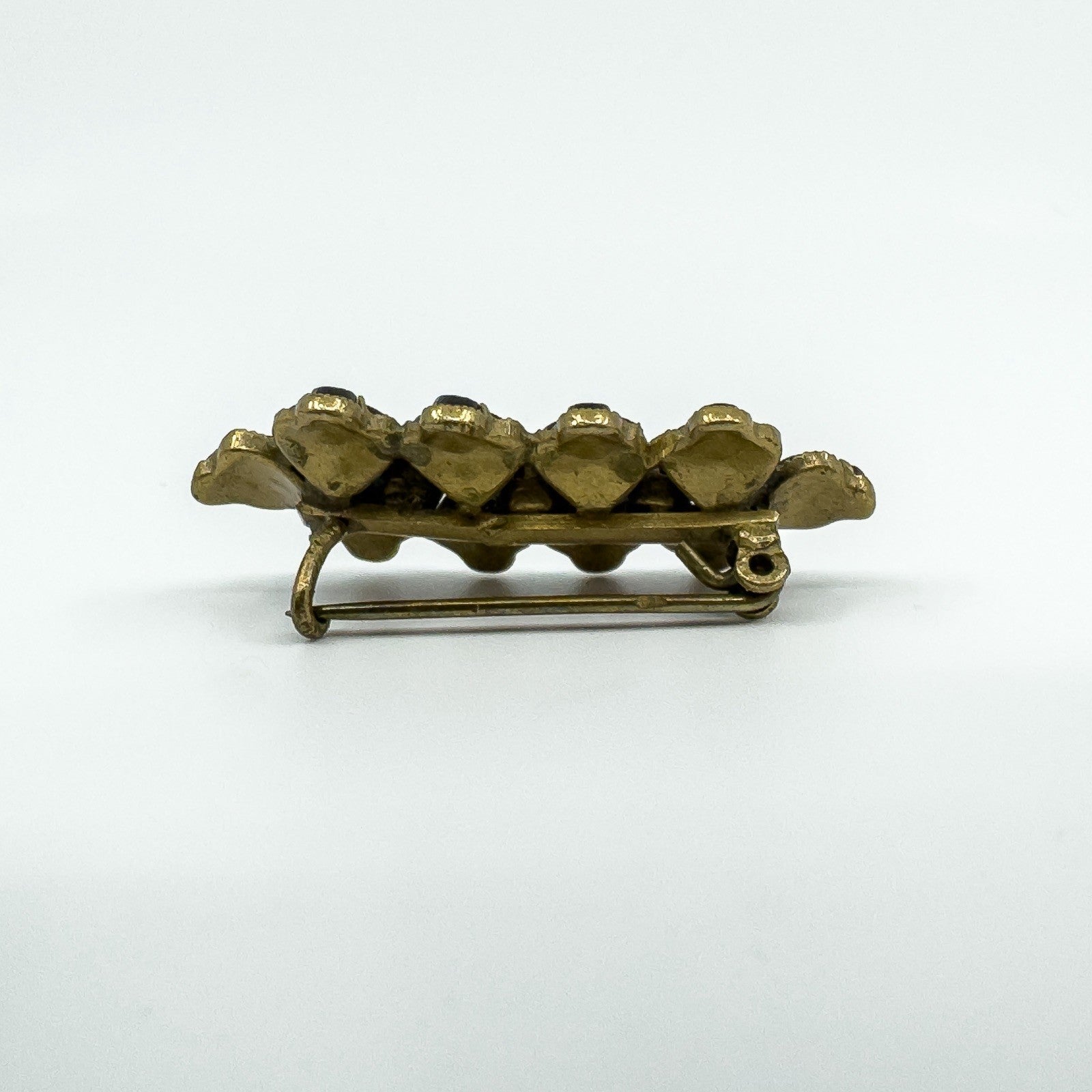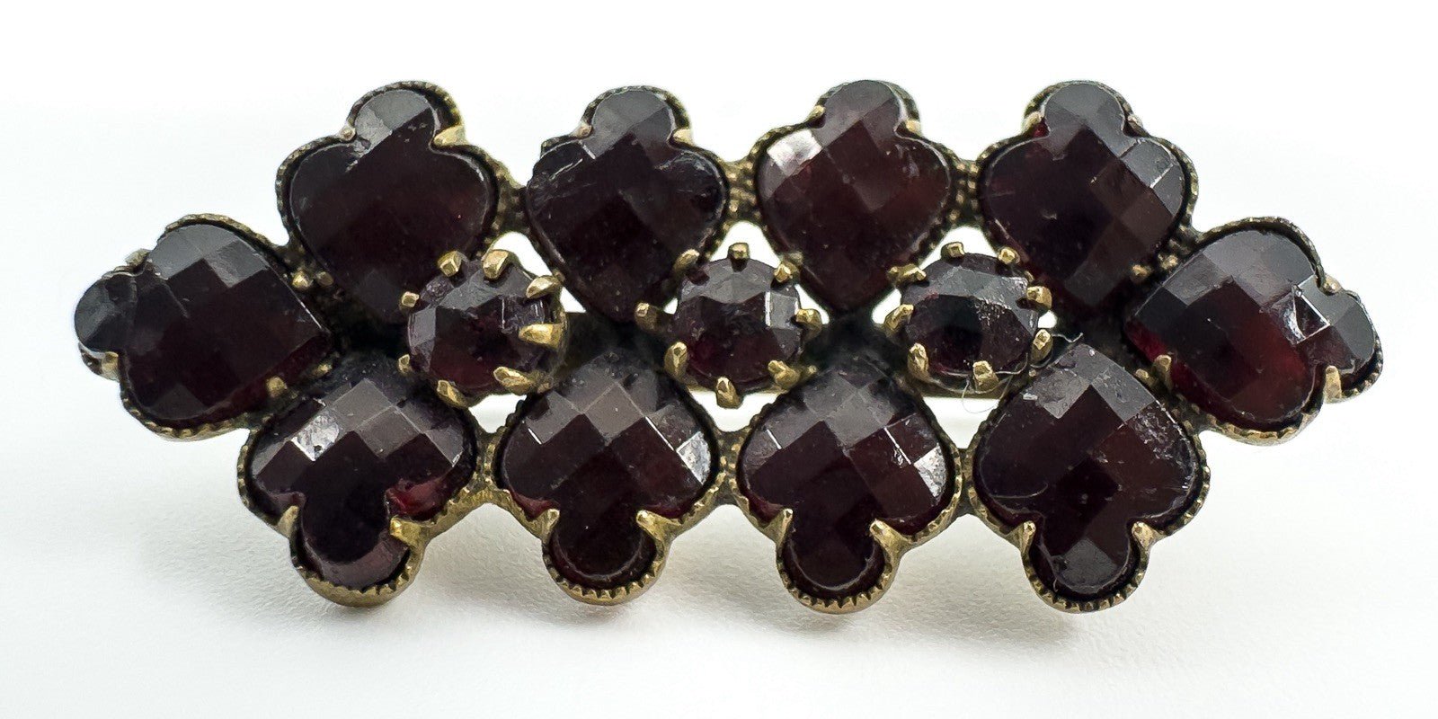 A pretty antique silver gilt bar brooch set with Bohemian garnets, including rose and faceted cuts. Not stamped and fitted with a C clasp pin. No missing gems noted, and the hook is a little stretched.