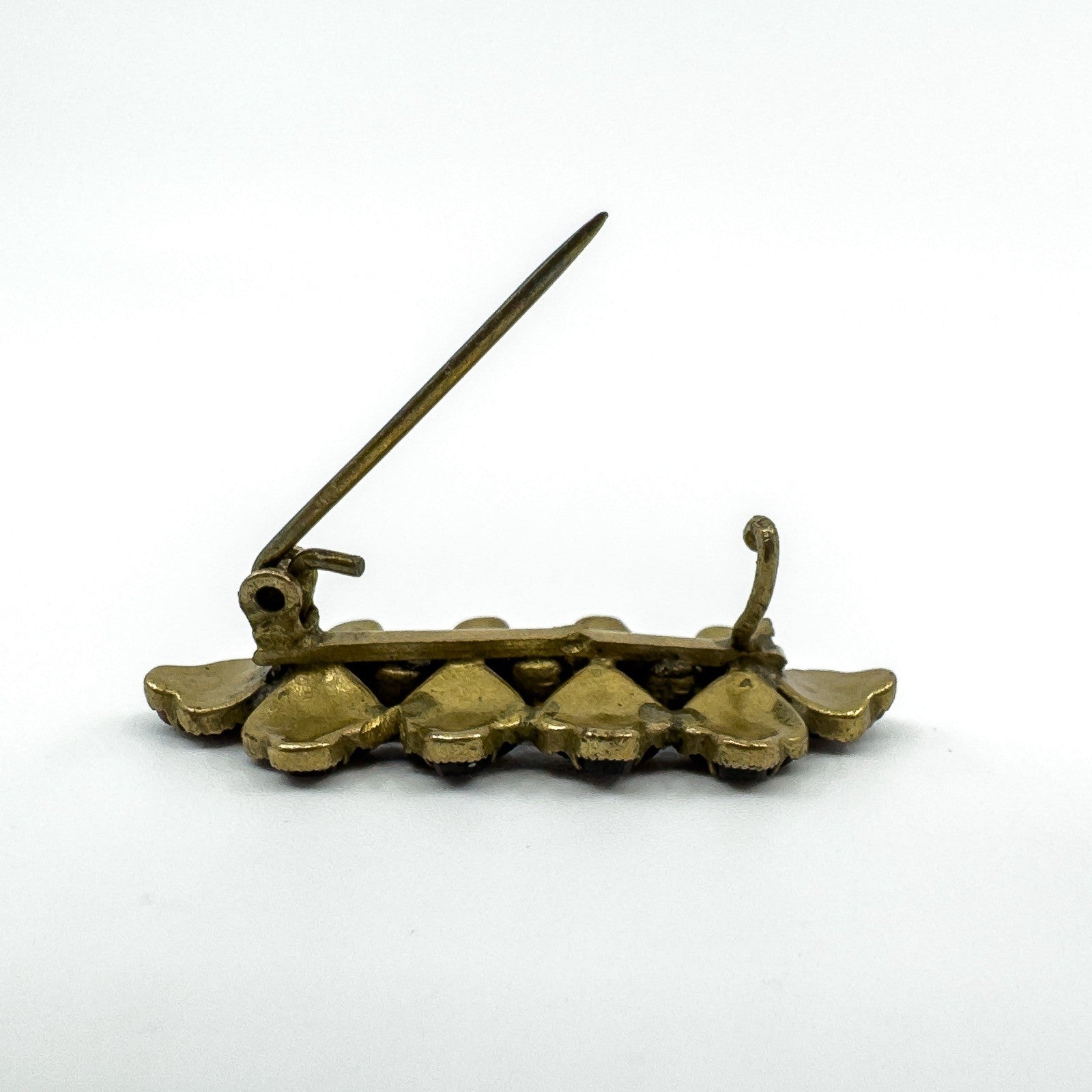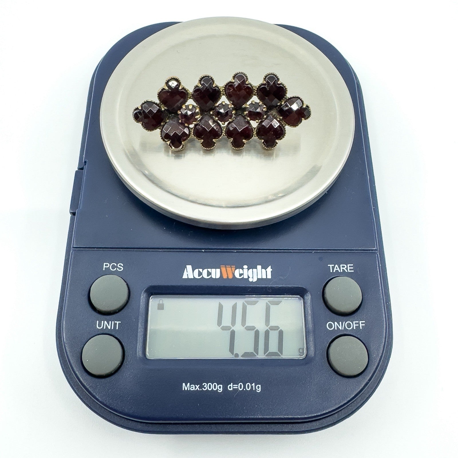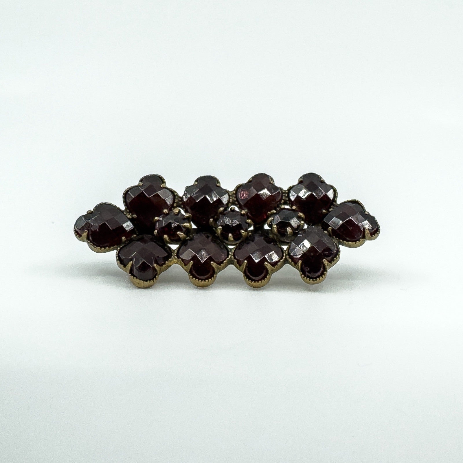 • Item: Silver gilt Bohemian garnet bar brooch • Metal: Silver gilt (not stamped) • Stones: Bohemian garnets (rose cut and faceted cut) • Fastening: C clasp pin • Measurements: Approx. 37.9mm x 16.3mm • Weight: Approx. 4.5g • Condition: No missing gems noted, hook a little stretched