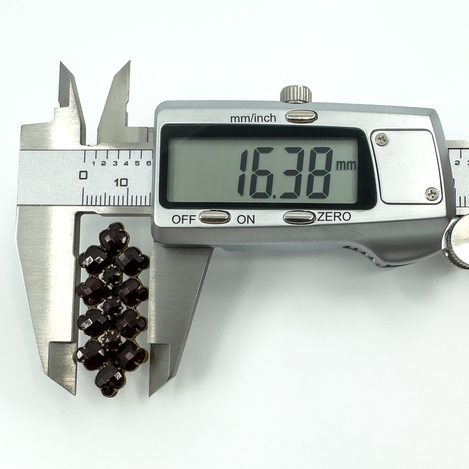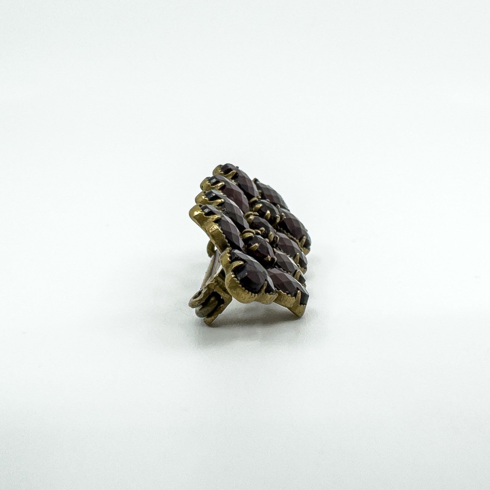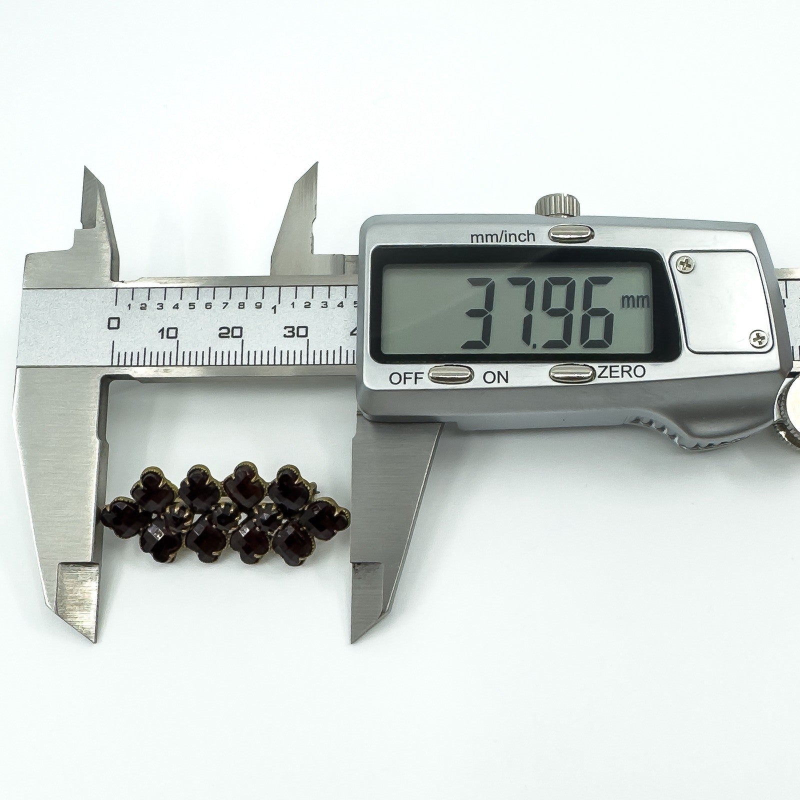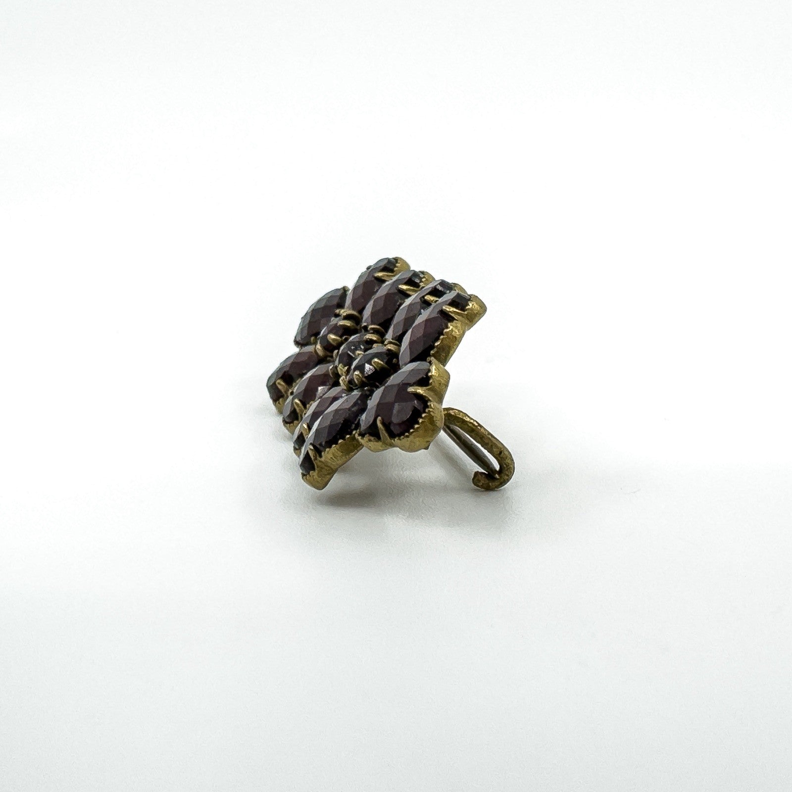 • Item: Silver gilt Bohemian garnet bar brooch • Metal: Silver gilt (not stamped) • Stones: Bohemian garnets (rose cut and faceted cut) • Fastening: C clasp pin • Measurements: Approx. 37.9mm x 16.3mm • Weight: Approx. 4.5g • Condition: No missing gems noted, hook a little stretched