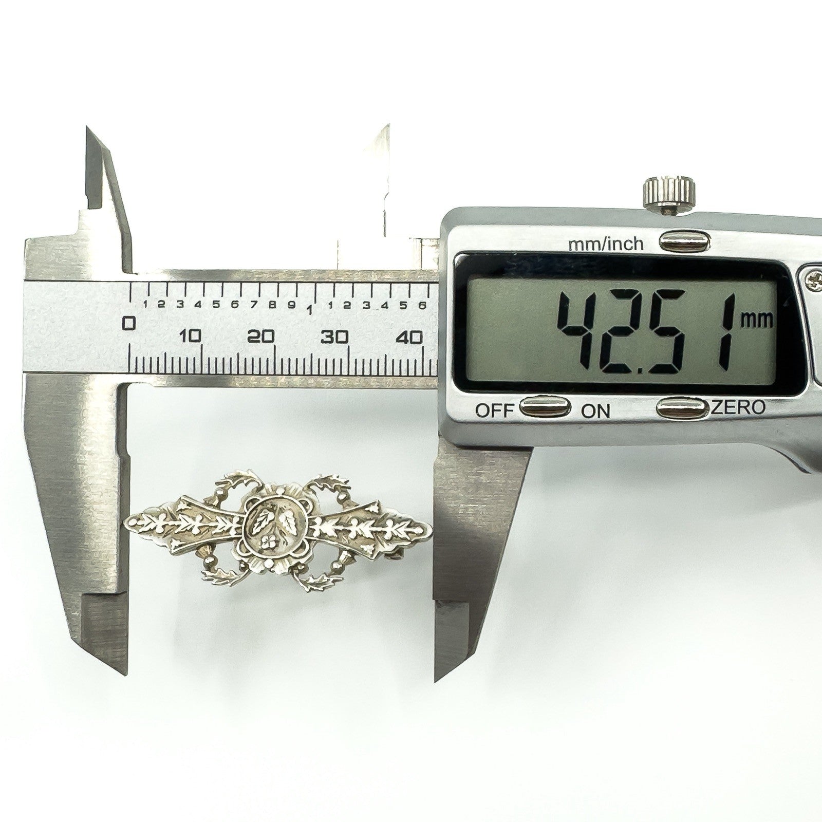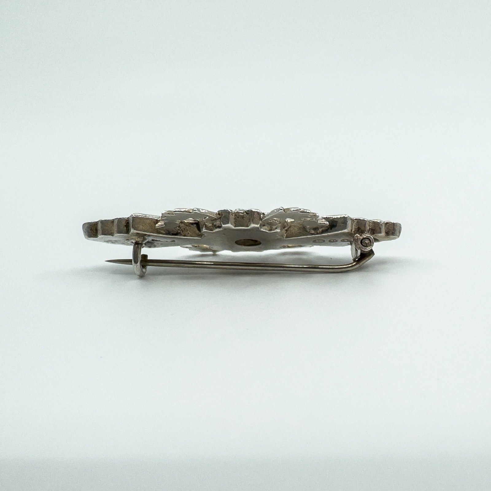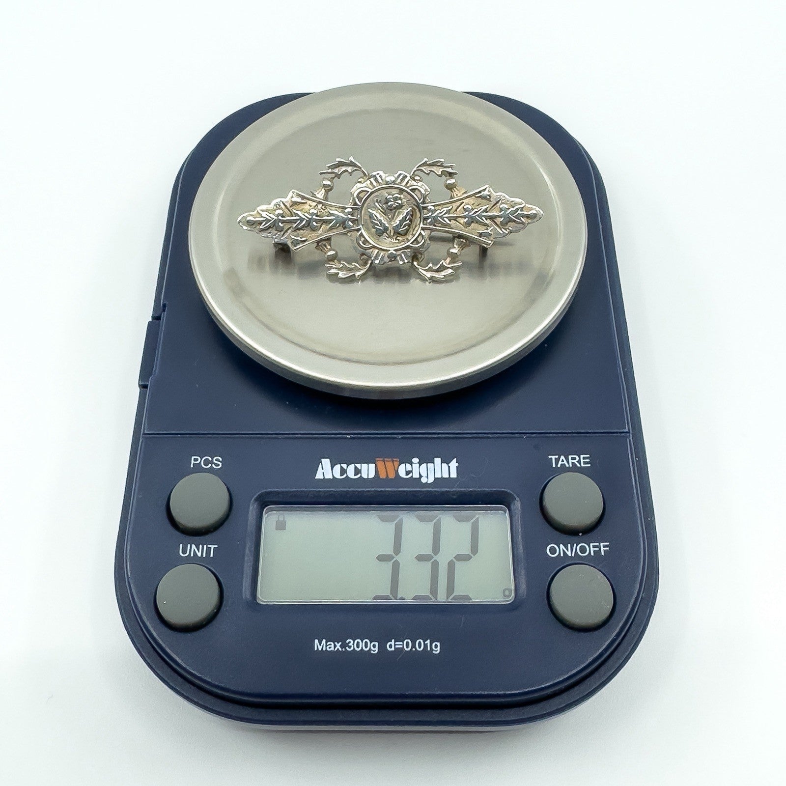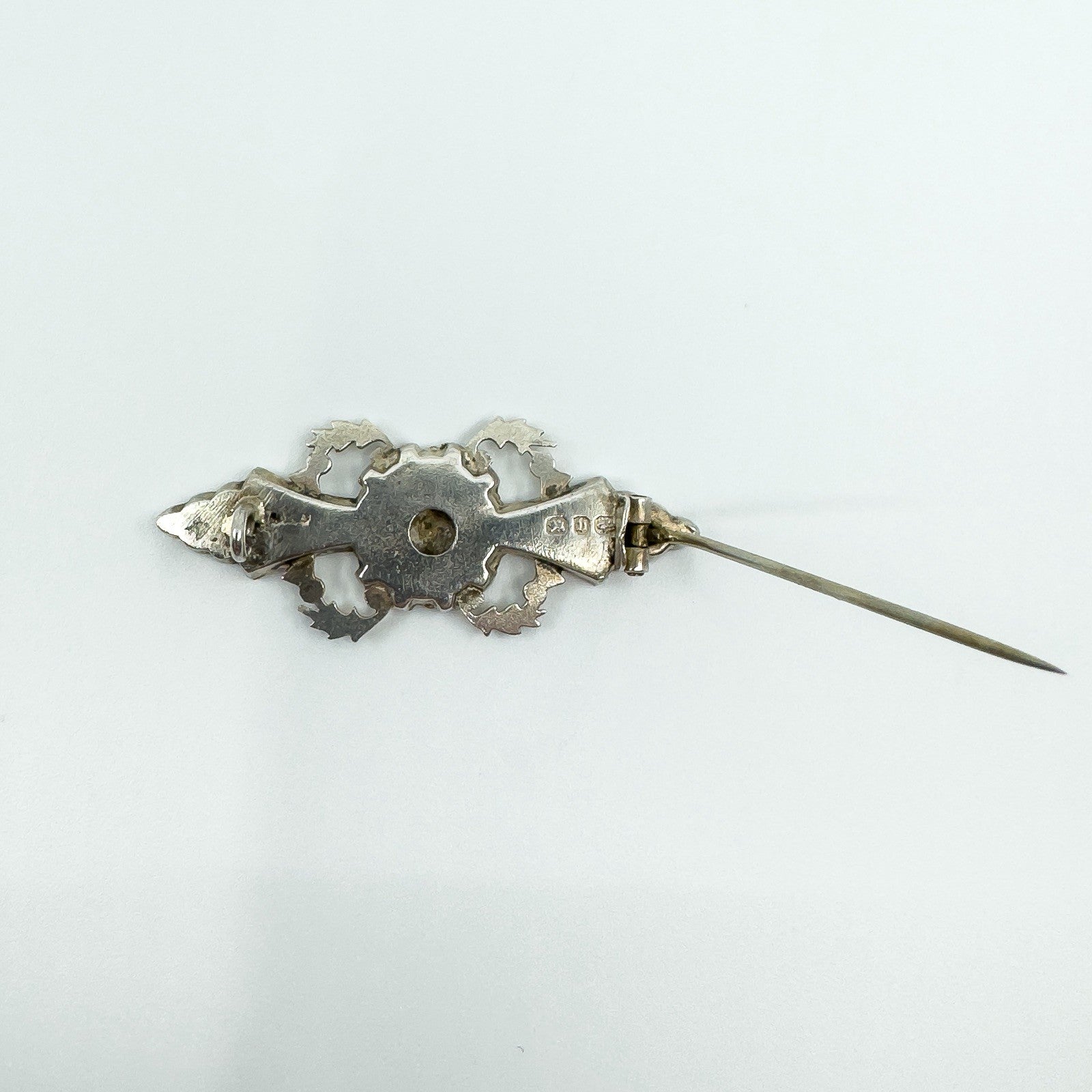 • Era: Antique Victorian • Item: Scottish thistle brooch • Metal: Sterling silver (925) • Hallmarks: Lion passant, anchor, date letter b (Birmingham 1876) • Fastening: C clasp pin • Measurements: Approx. 42.5mm x 17.1mm • Weight: Approx. 3.3g