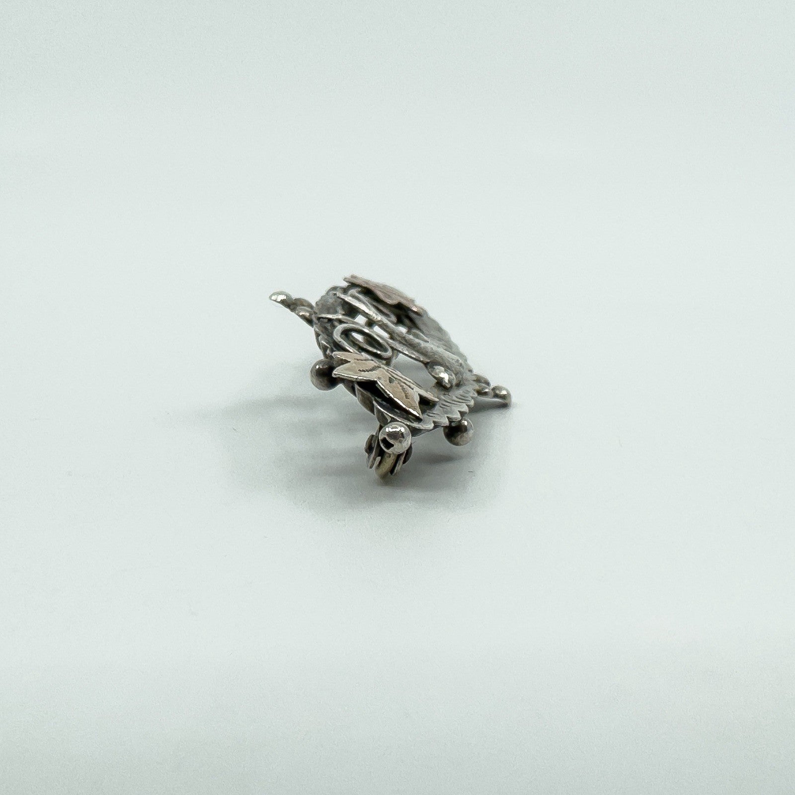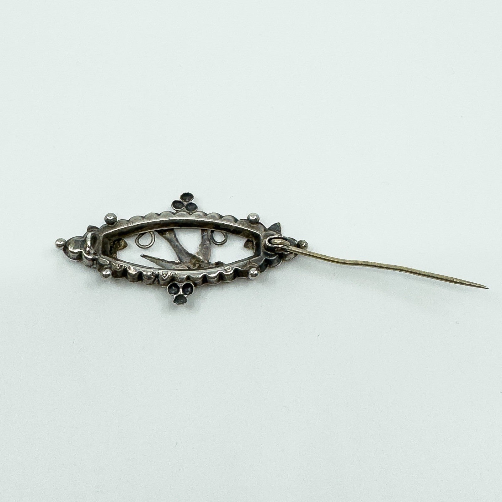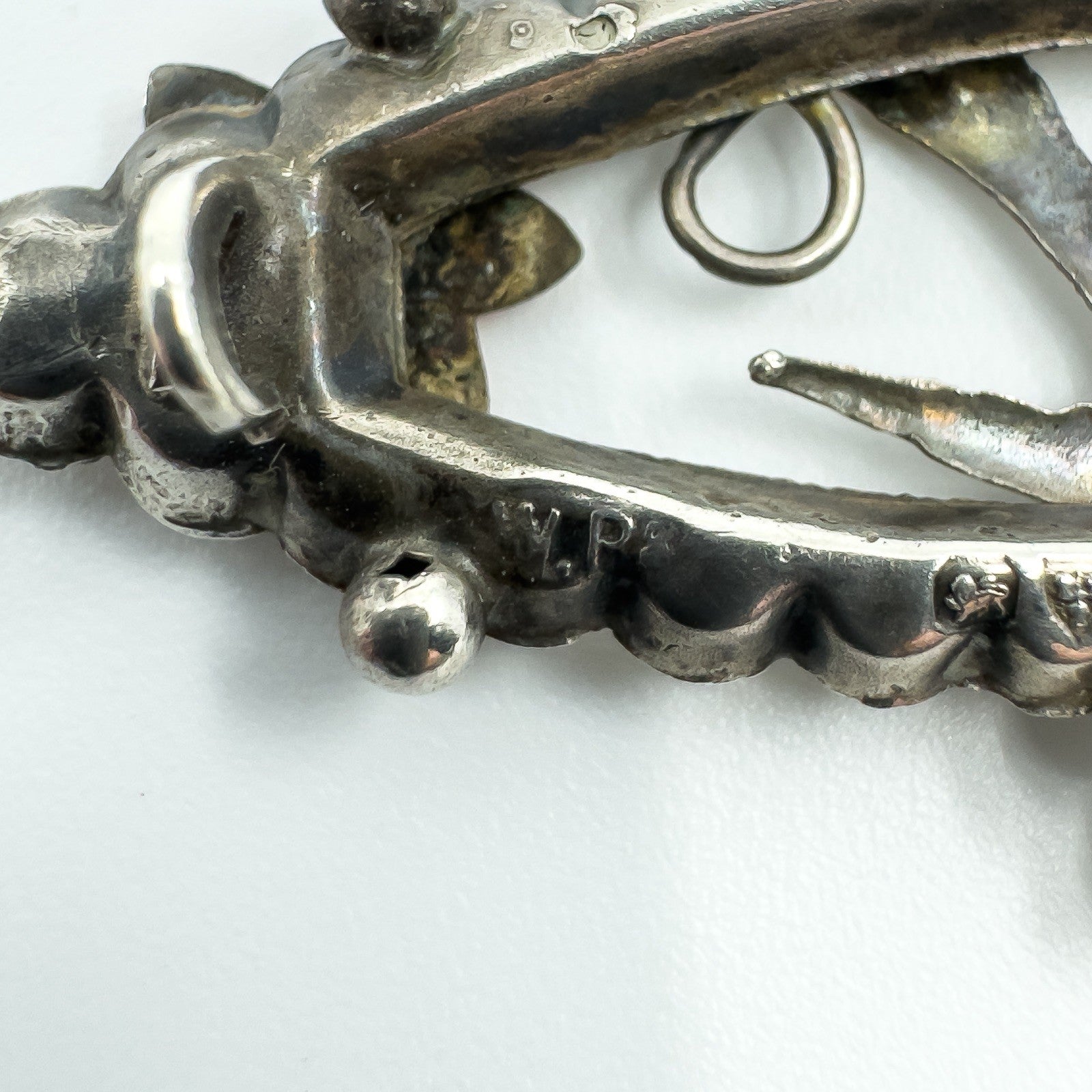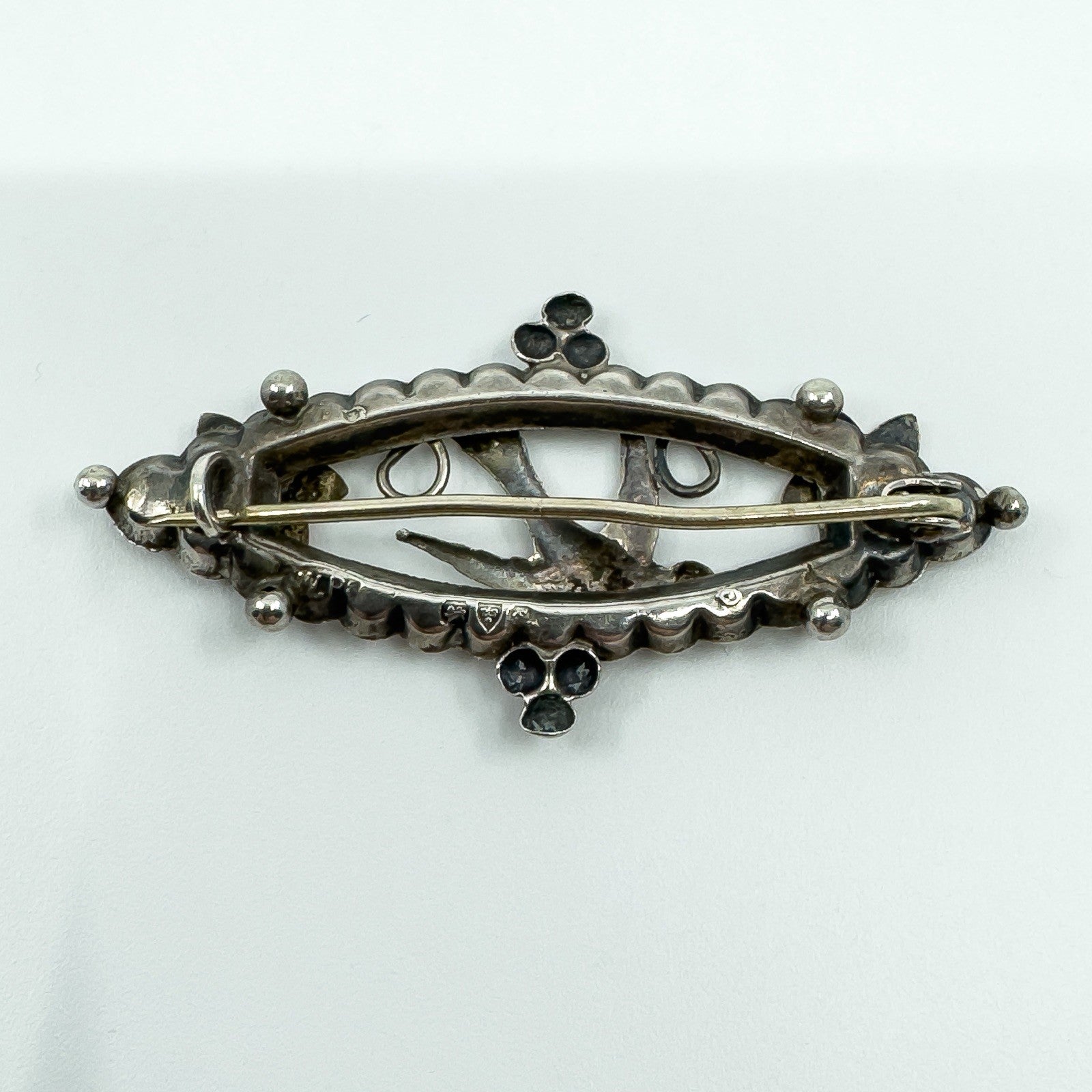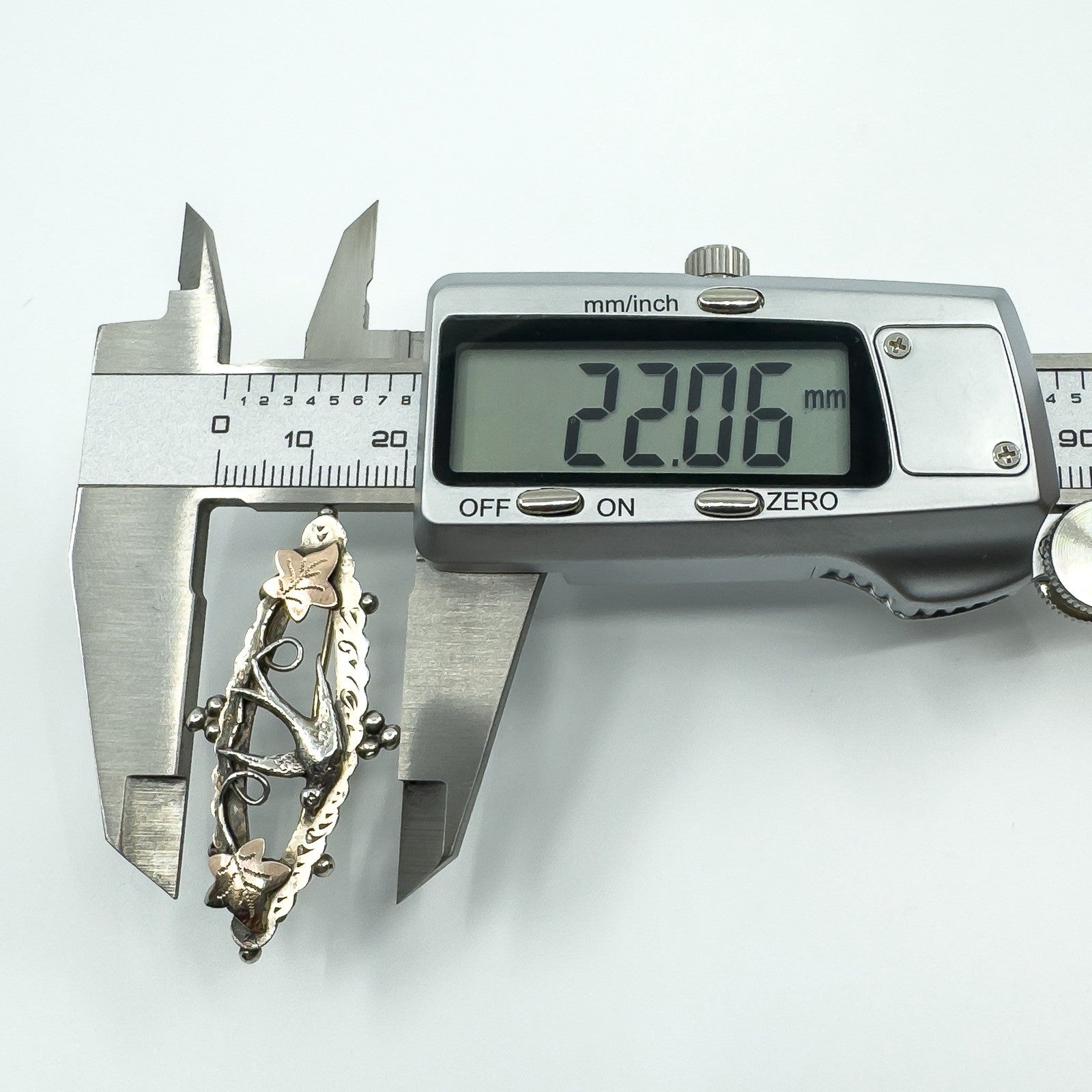 • Era: Antique Victorian • Metal: Sterling silver with rose gold detail • Hallmarks: Lion passant, Chester (date letter unclear) • Fastening: C clasp pin • Measurements: Approx. 45.5mm x 22mm • Weight: Approx. 2.8g • Motif: Swallow and ivy