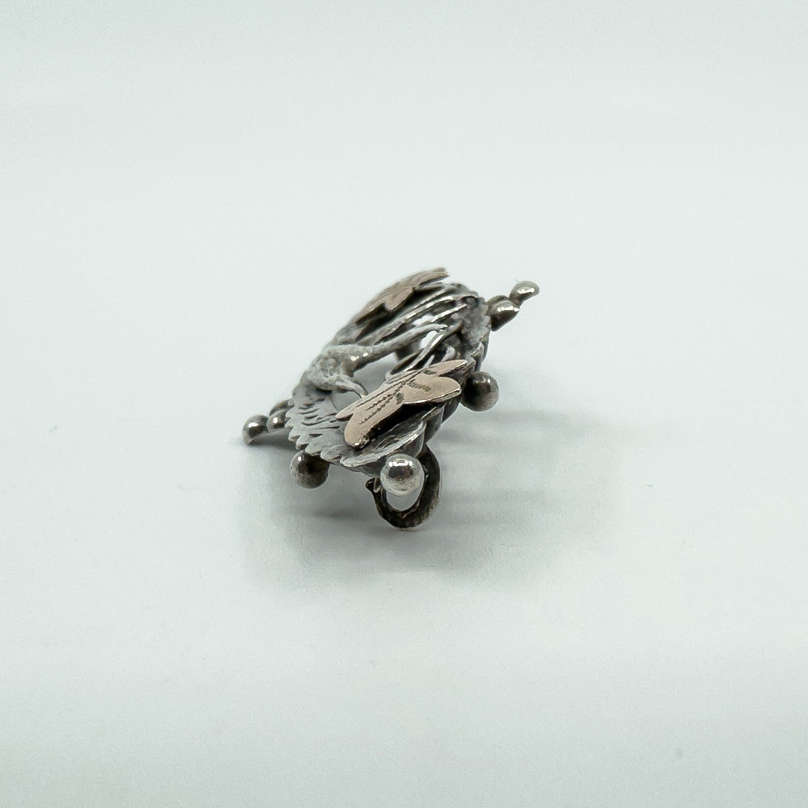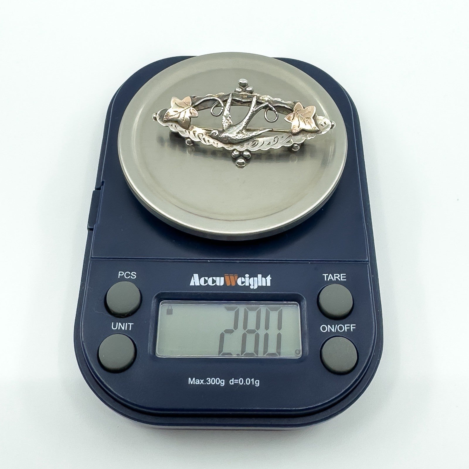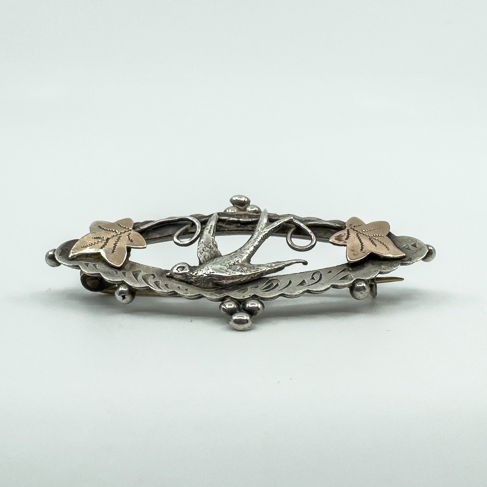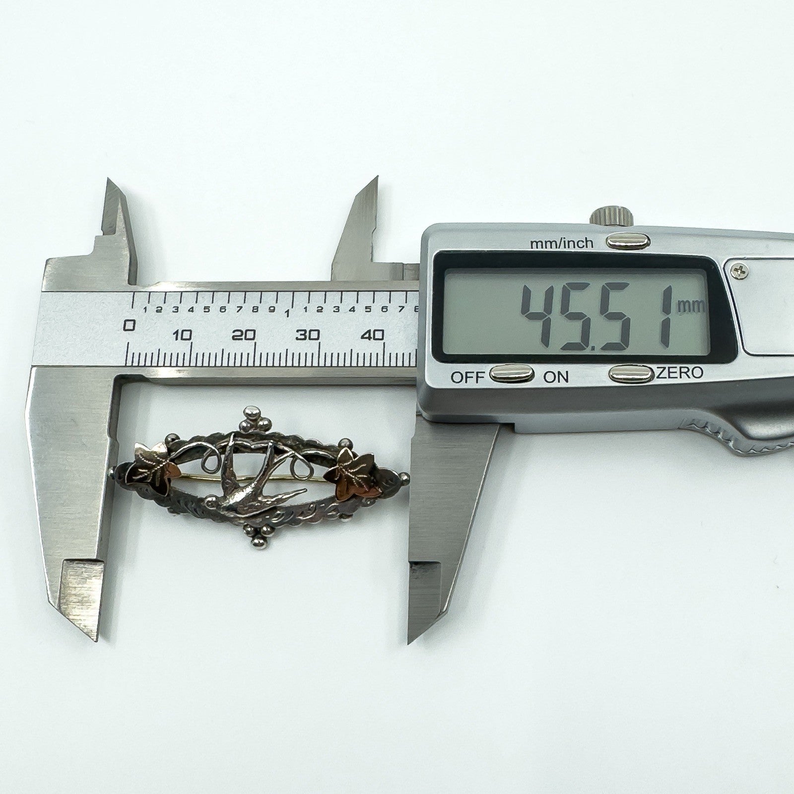 An antique Victorian swallow and ivy brooch in sterling silver with rose gold detail, hallmarked in Chester (date letter unclear). Fitted with a C clasp pin.