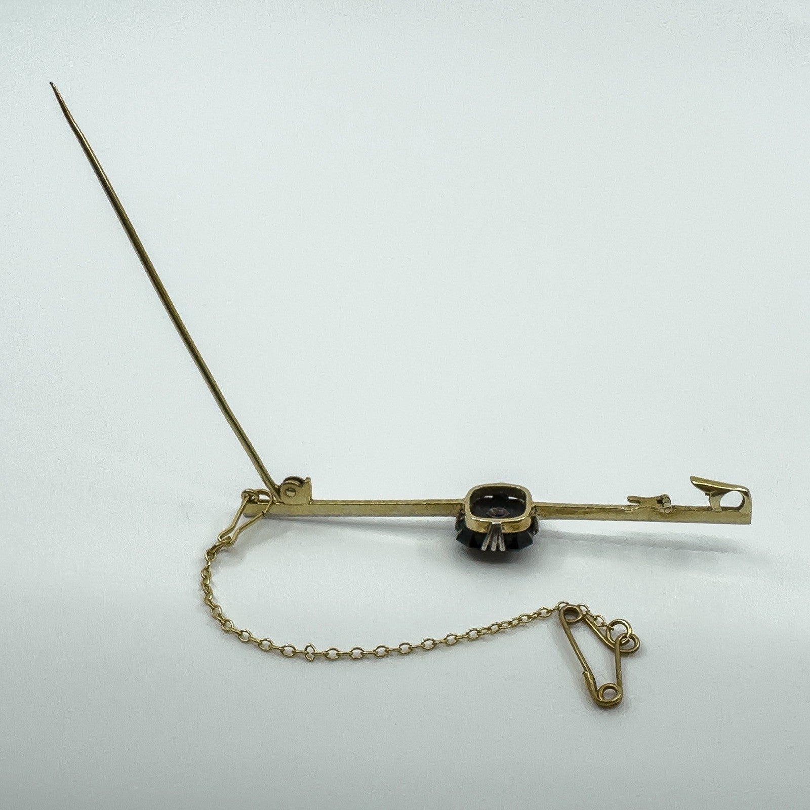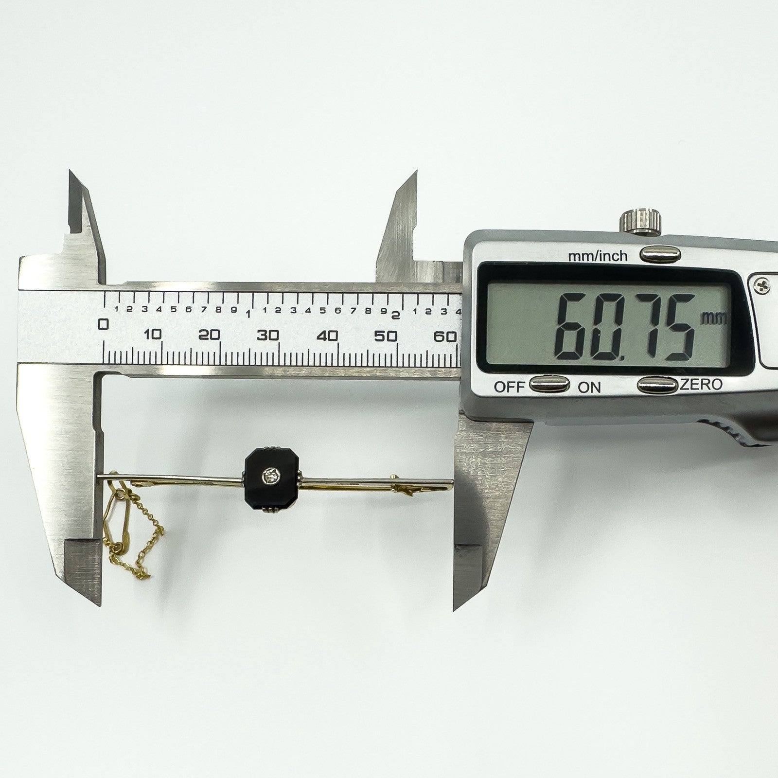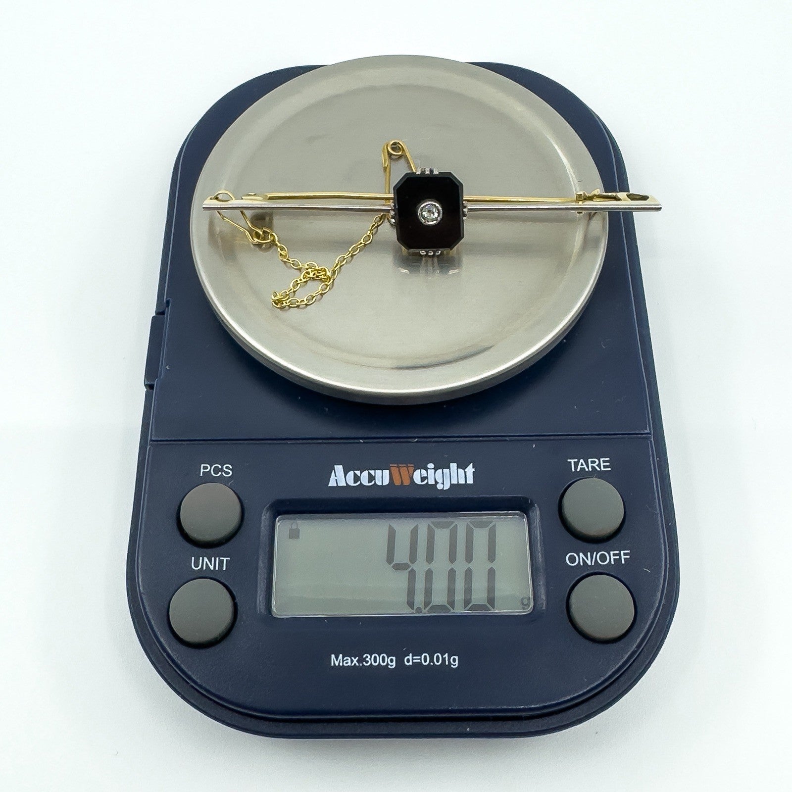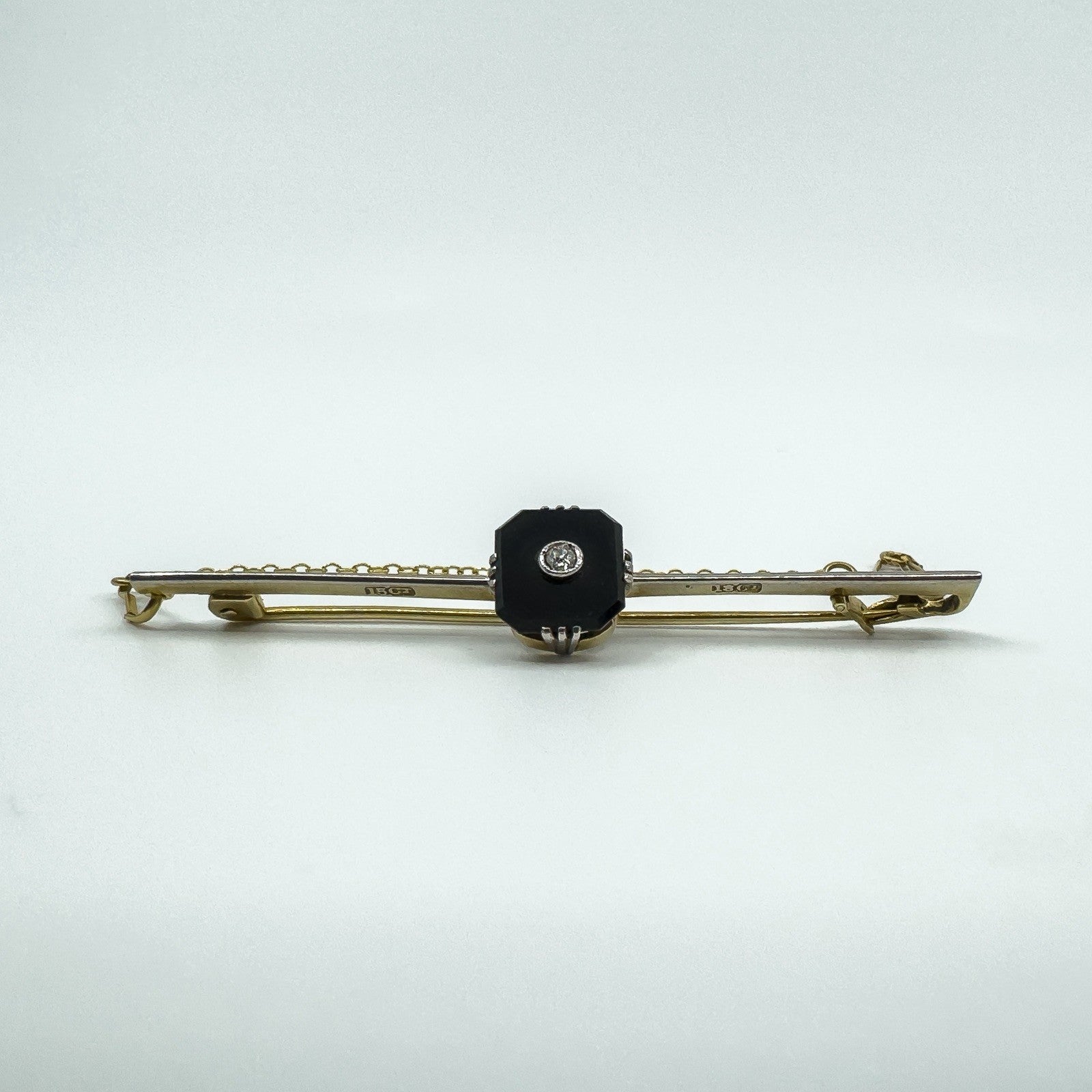 Art Deco gold bar brooch set with black onyx and a tested old cut diamond. Fitted with a pin and sliding clasp that moves along the bar, finished with a safety chain. Stamped 15ct and 18ct. A simple, wearable piece that sits neatly on a lapel, knit, scarf, or coat collar.