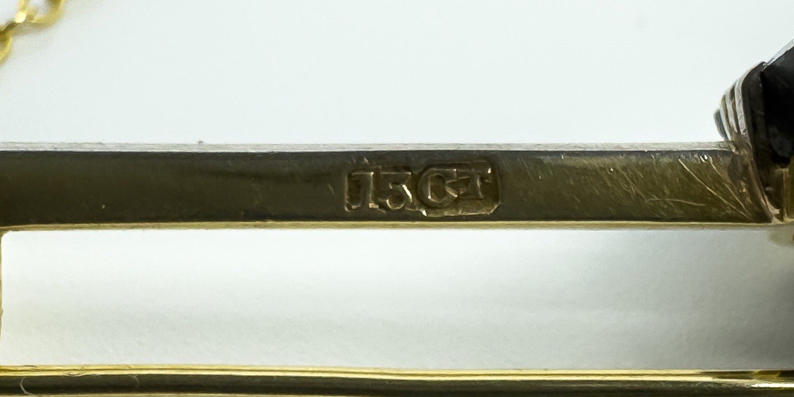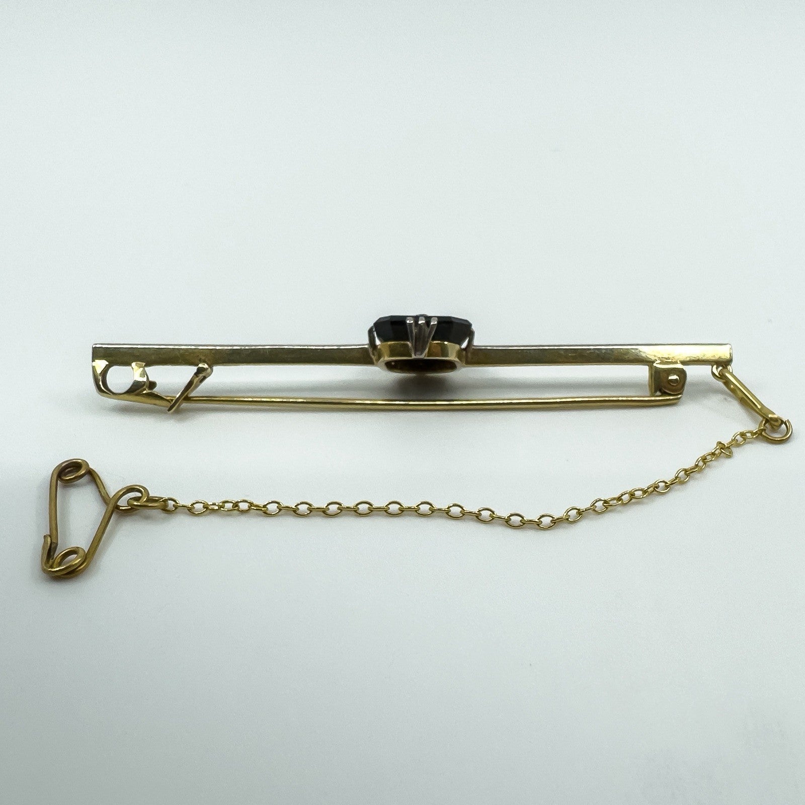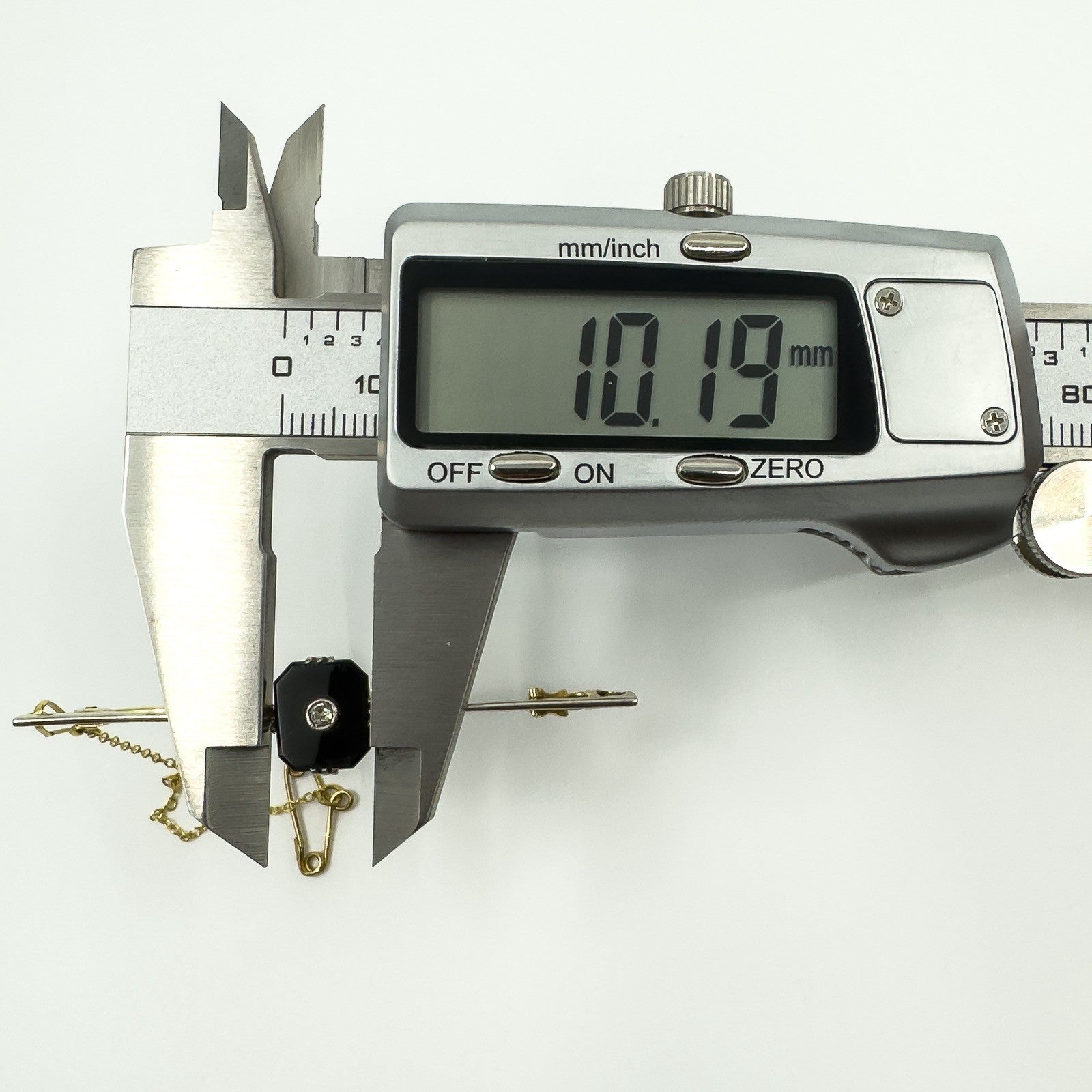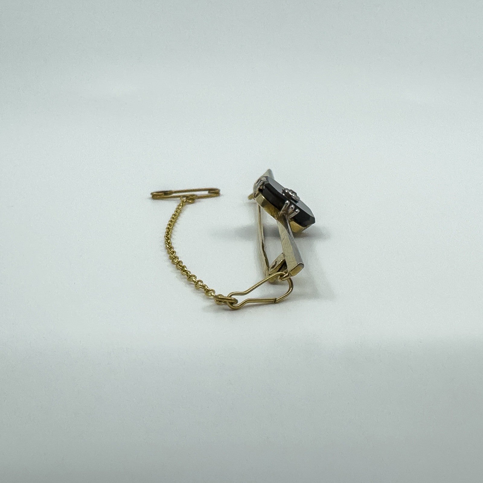 Art Deco gold bar brooch set with black onyx and a tested old cut diamond. Fitted with a pin and sliding clasp that moves along the bar, finished with a safety chain. Stamped 15ct and 18ct. A simple, wearable piece that sits neatly on a lapel, knit, scarf, or coat collar.