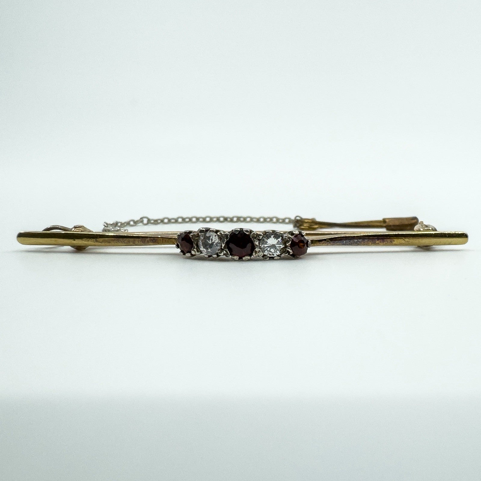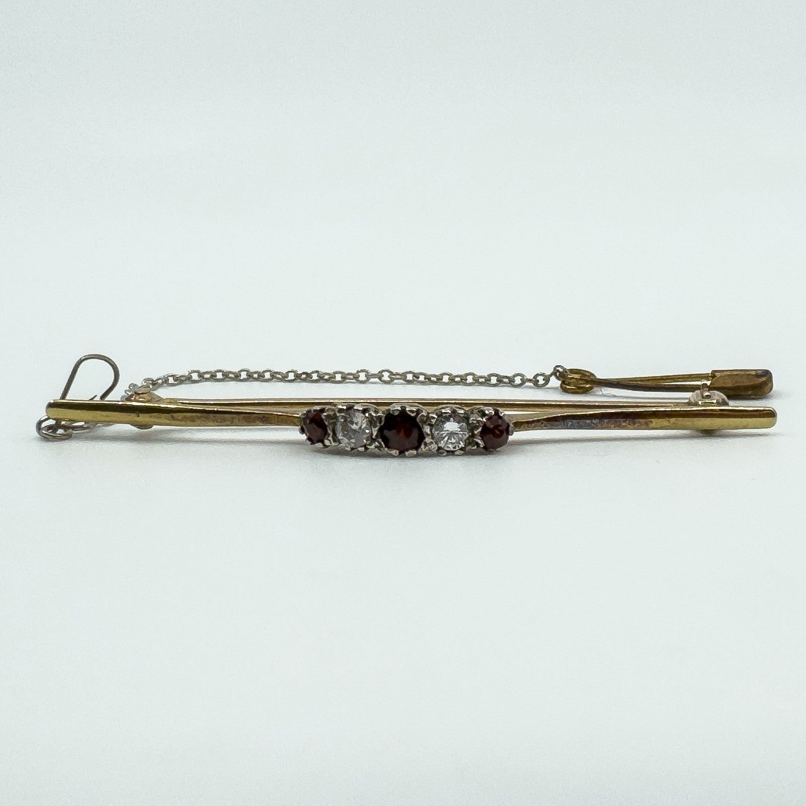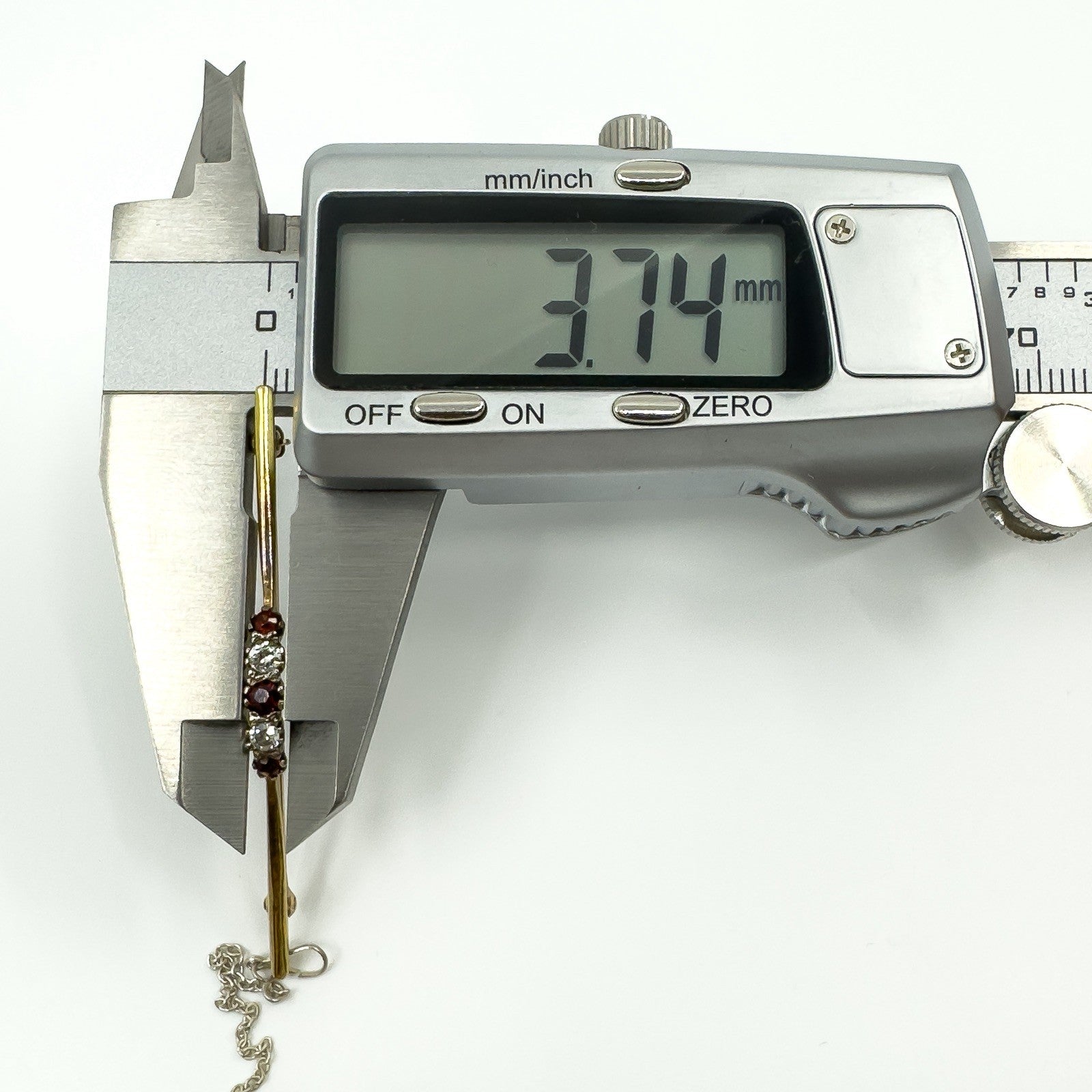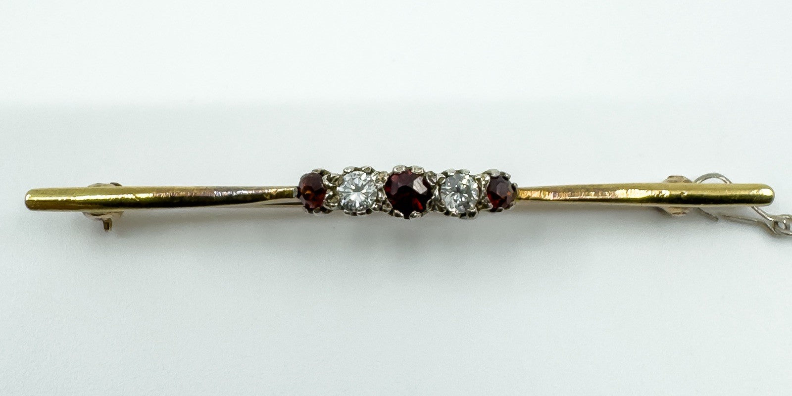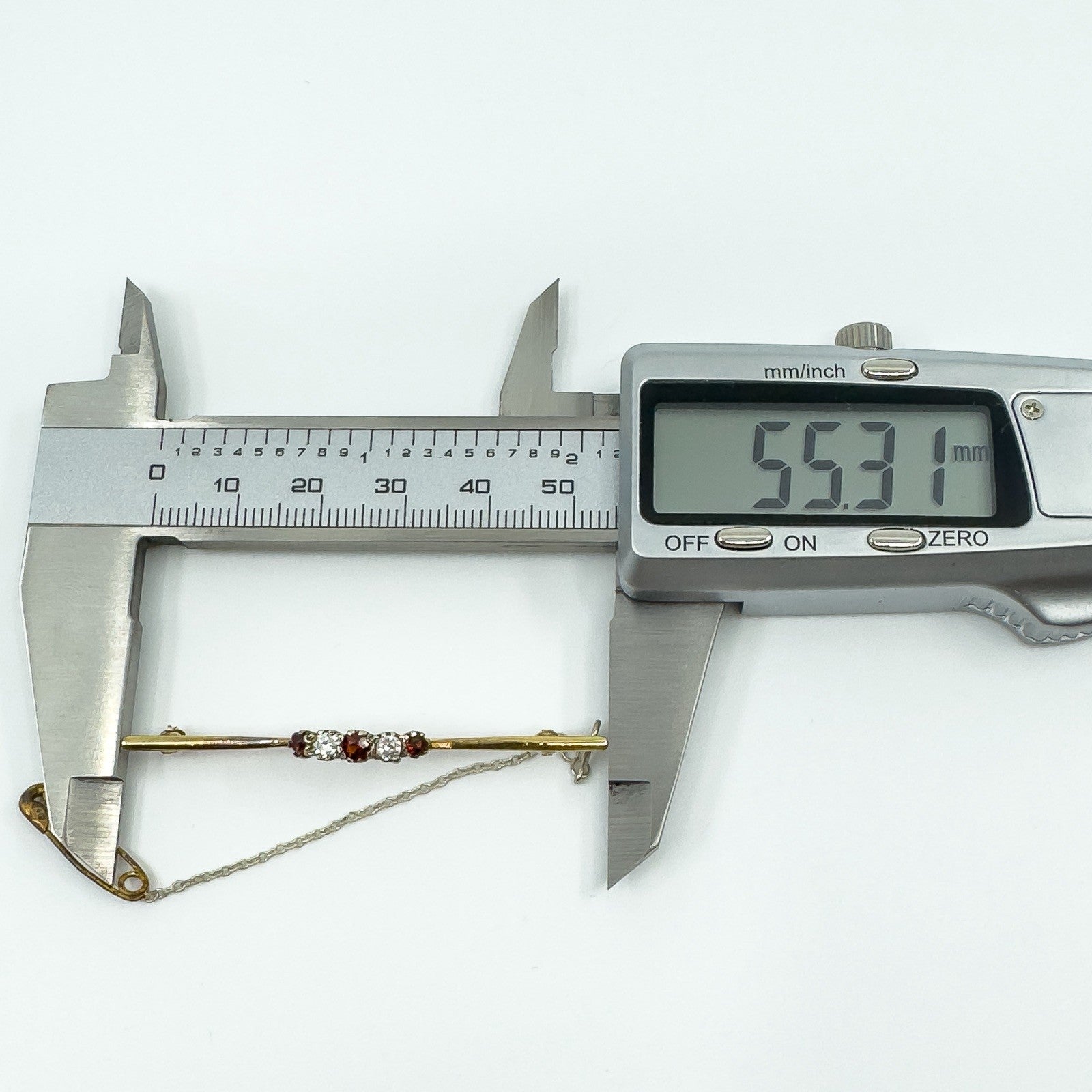 Vintage bar brooch set with 3 round cut garnets and 2 natural round cut diamonds (tested). This brooch may have started life as a ring and was later converted into a brooch, suggested by the arched head and the partial visibility of the stamps or hallmarks. The brooch section tests as 18ct gold, with the bar, pin and clasp testing as 14ct gold.
