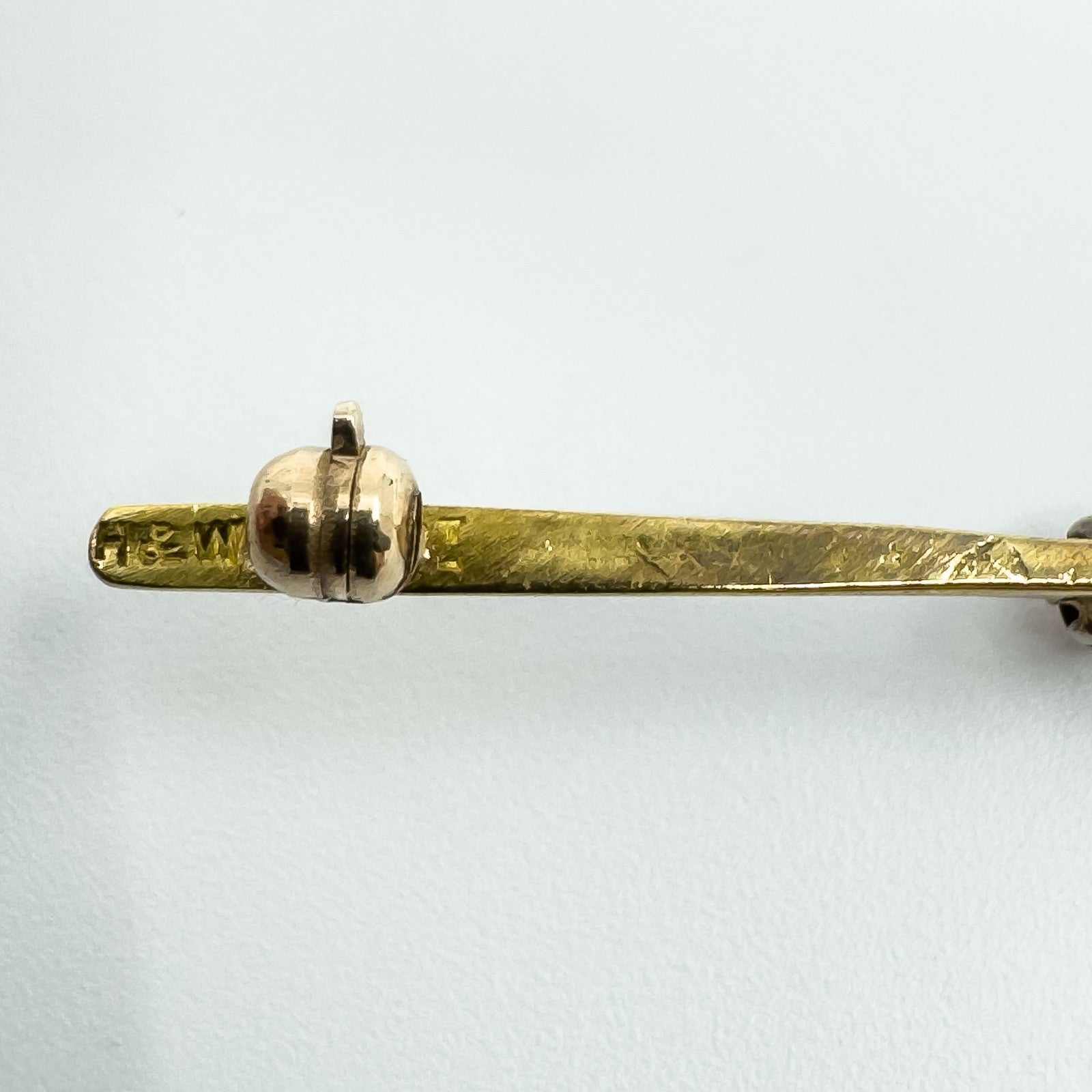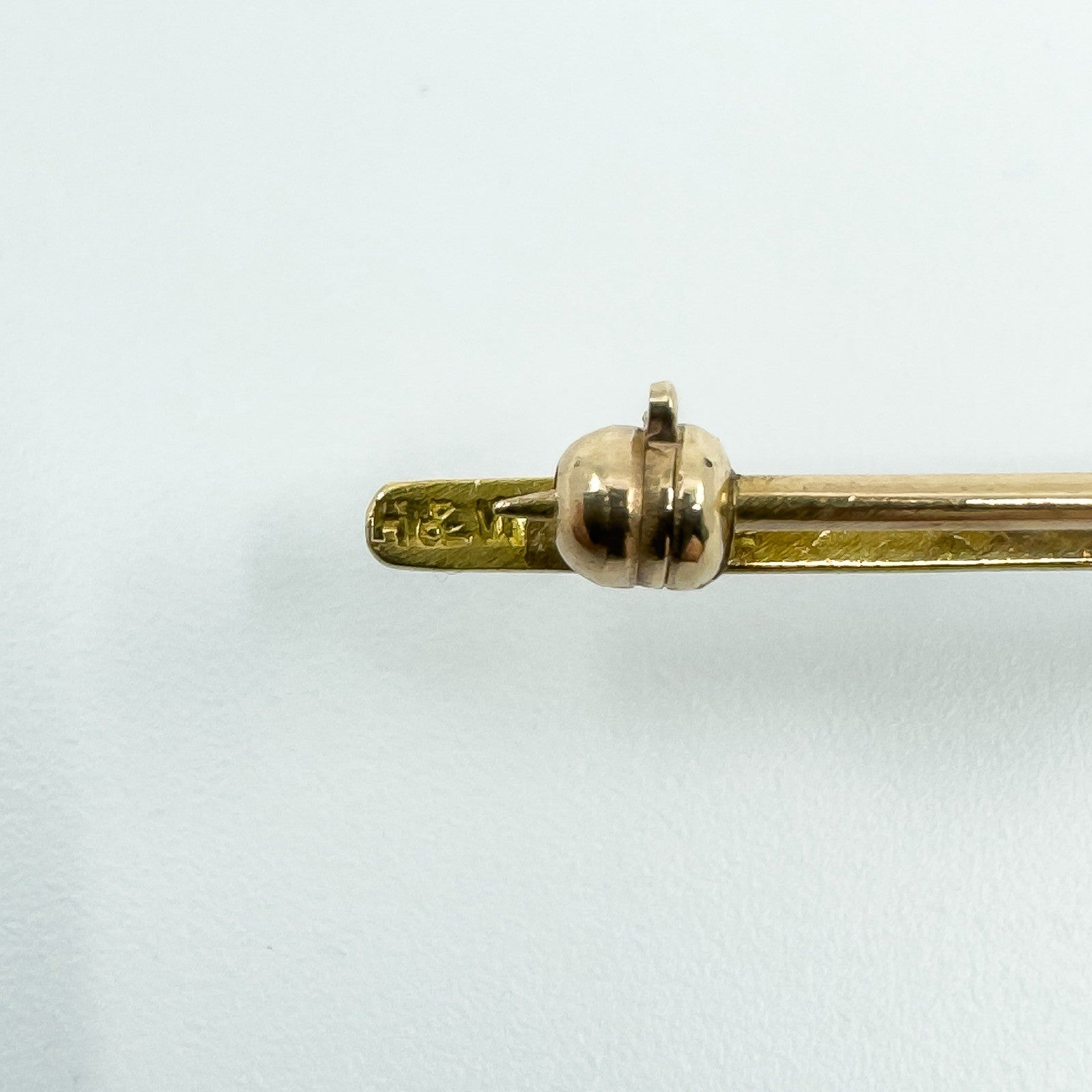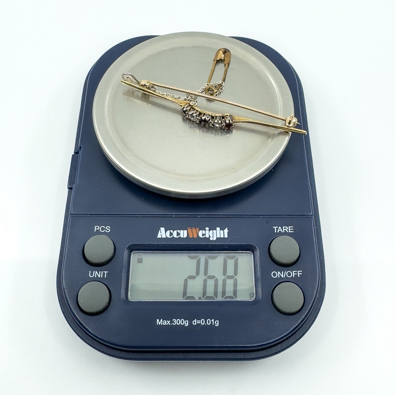 • Item: Diamond and garnet bar brooch • Metal: Gold (tested 18ct brooch section, tested 14ct bar, pin and clasp) • Gemstones: 3x round cut garnets • Diamonds: 2x natural round cut diamonds (tested) • Fittings: Rolling C clasp, pin and safety chain • Stamps: H&W, T, 5500 (partially visible under the clasp) • Measurements: Approx. 55.3mm x 3.7mm • Weight: Approx. 2.6g