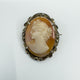 A vintage sterling silver carved shell cameo that can be worn as either a brooch or a pendant. The oval shell carving is framed in silver, showing fine detail and classic styling.