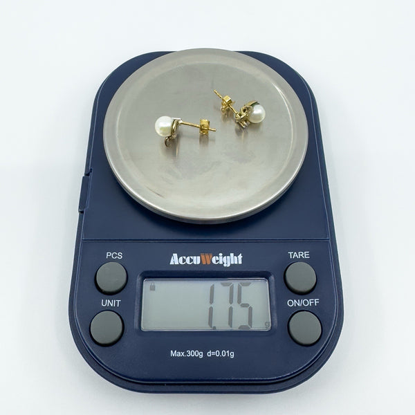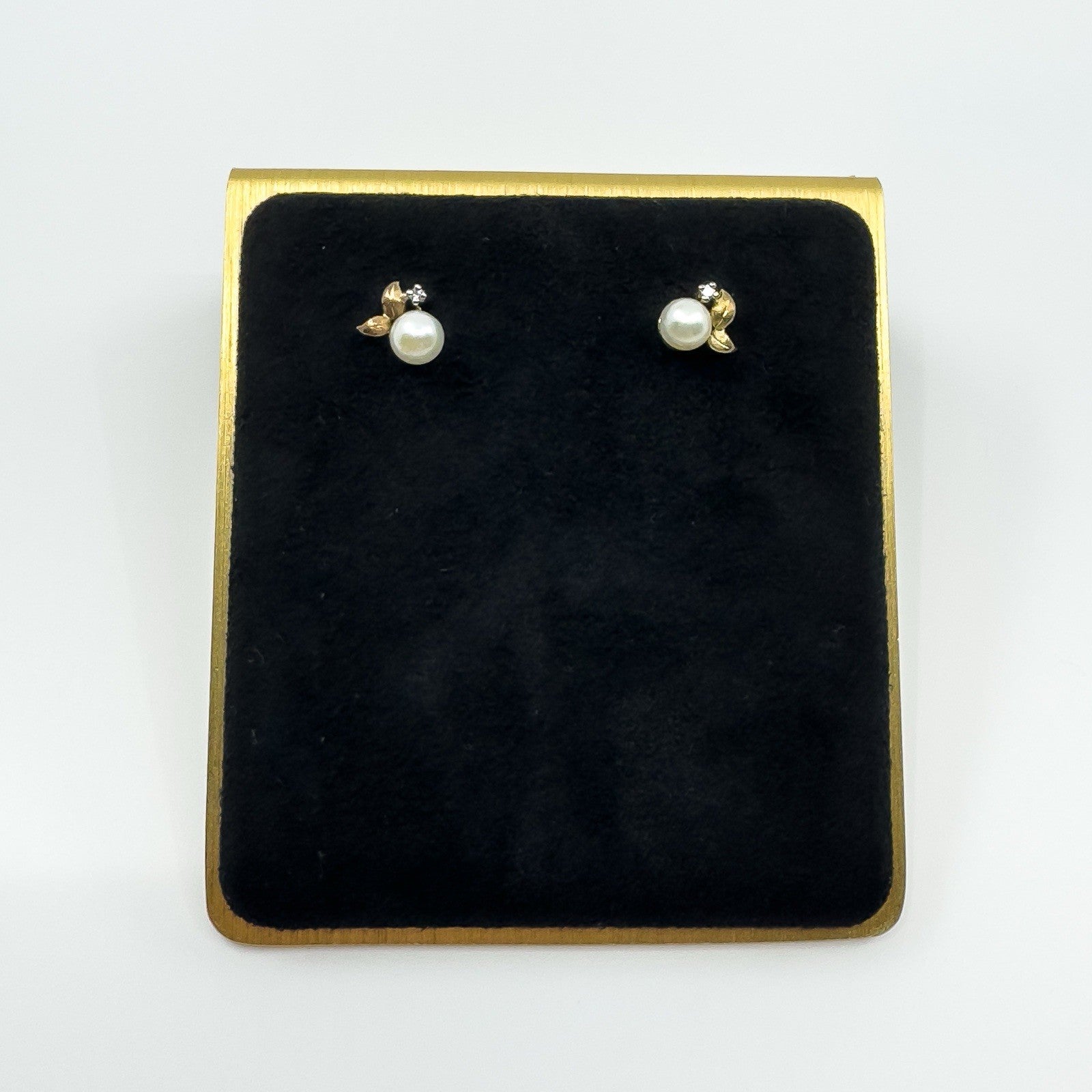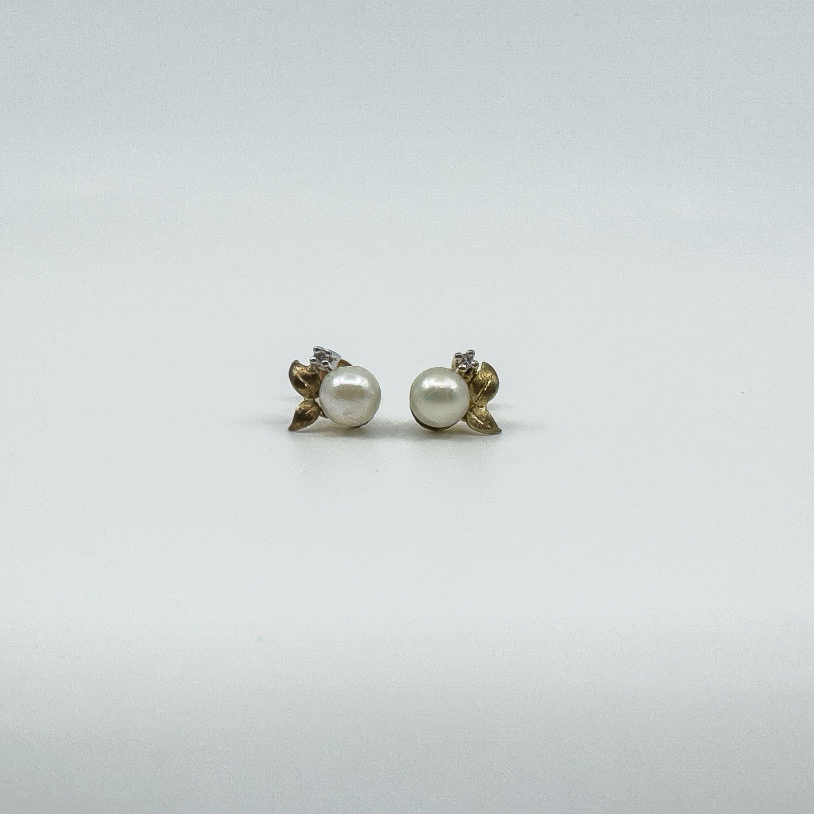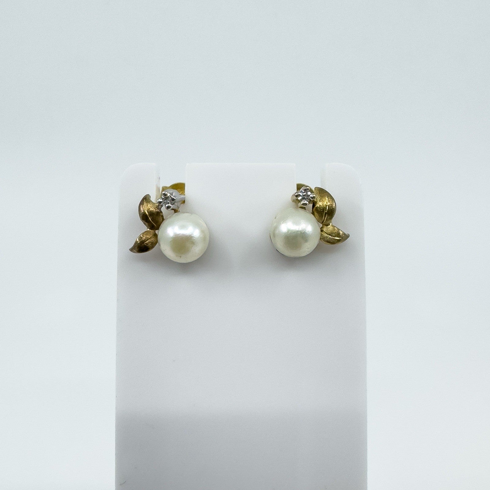 A vintage pair of 9ct gold cultured pearl and diamond stud earrings, set with a lustrous pearl and a natural round cut diamond. Elegant and timeless, they offer a soft glow and subtle sparkle that complement both everyday and formal looks.