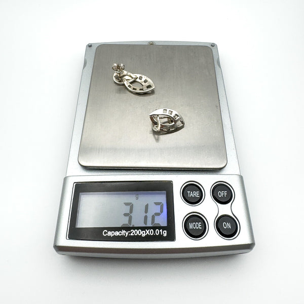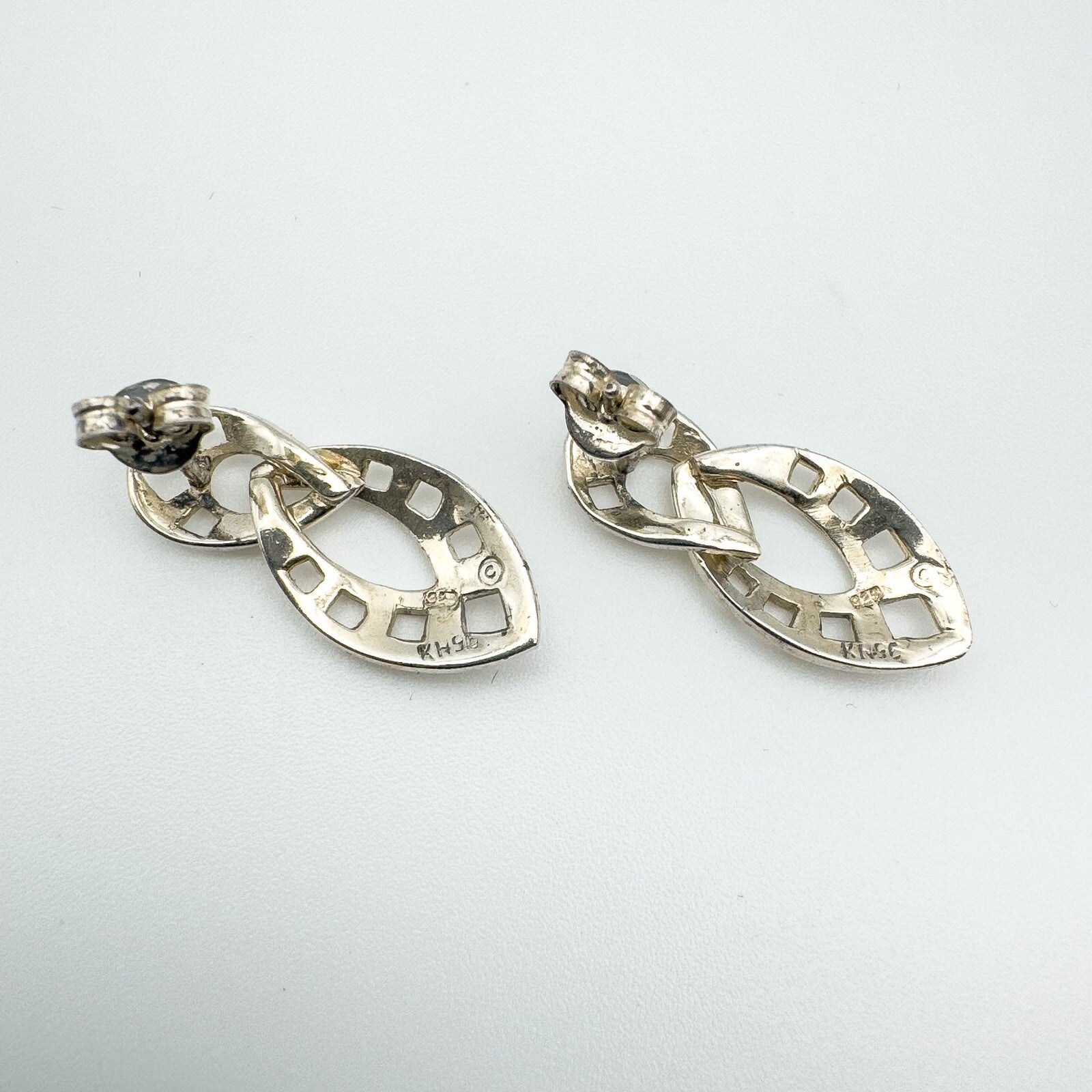 For pierced ears with butterfly backs and stamped 925, KH, 96 and C for Kit Heath. Together they weigh approximately 3.1 g and measure around 24.8 × 10.8 mm.