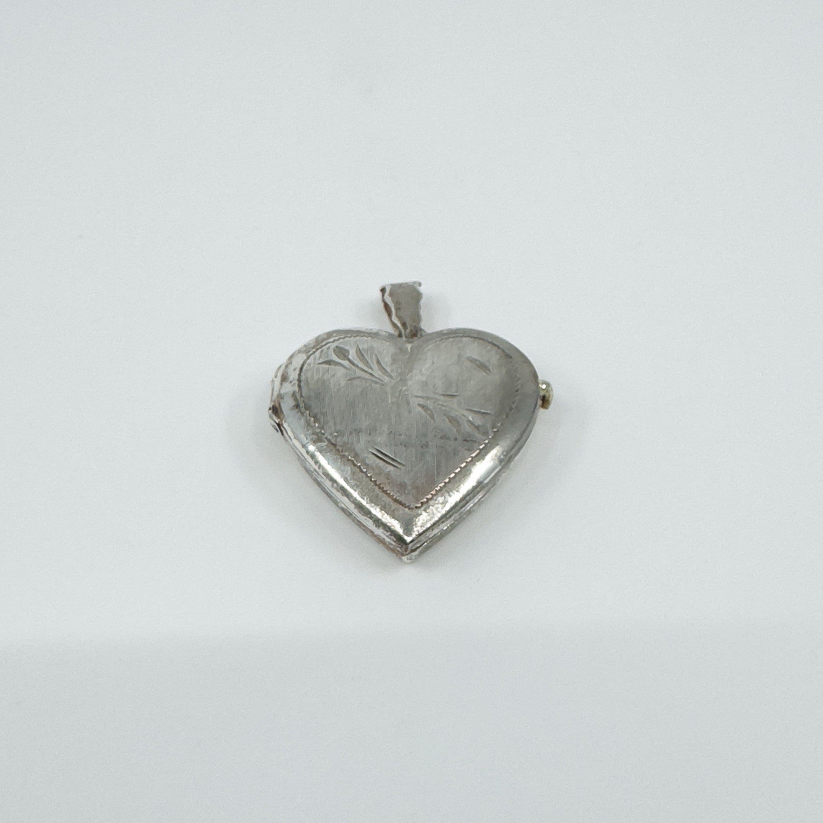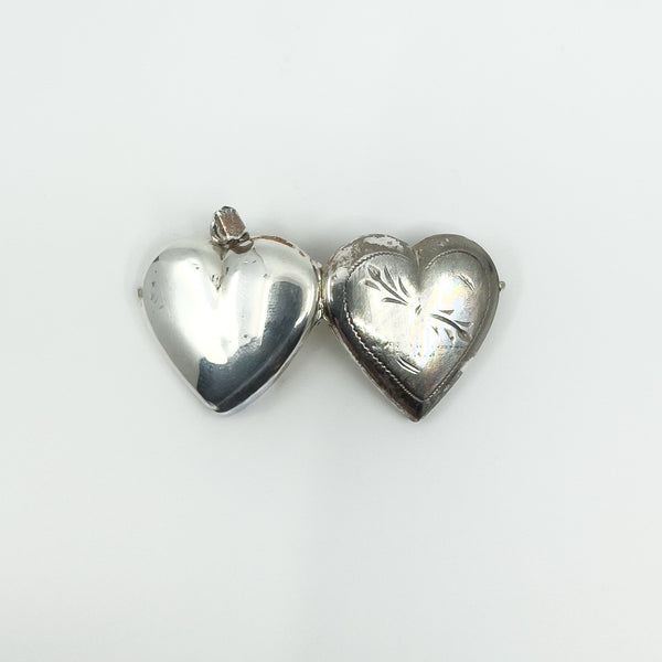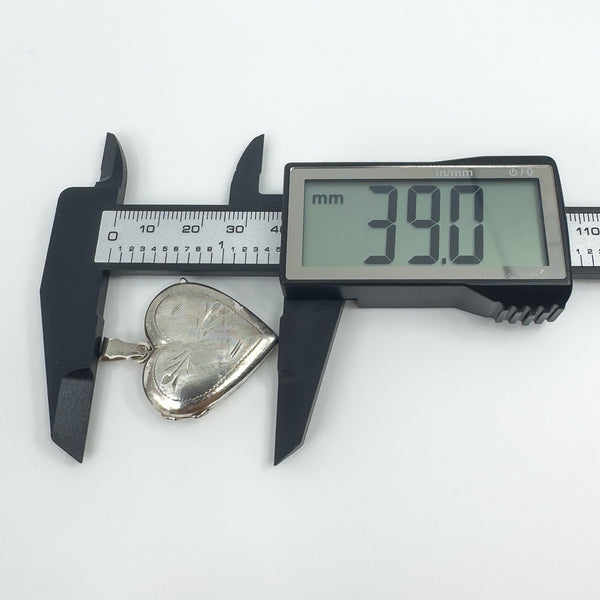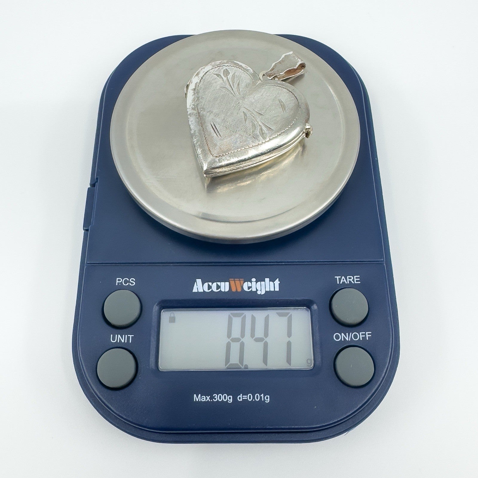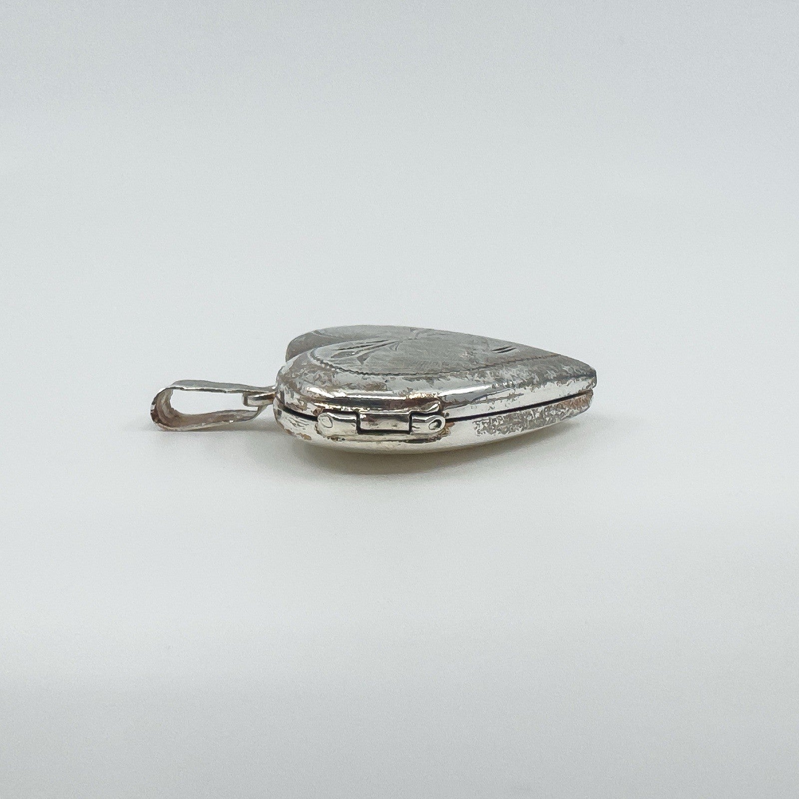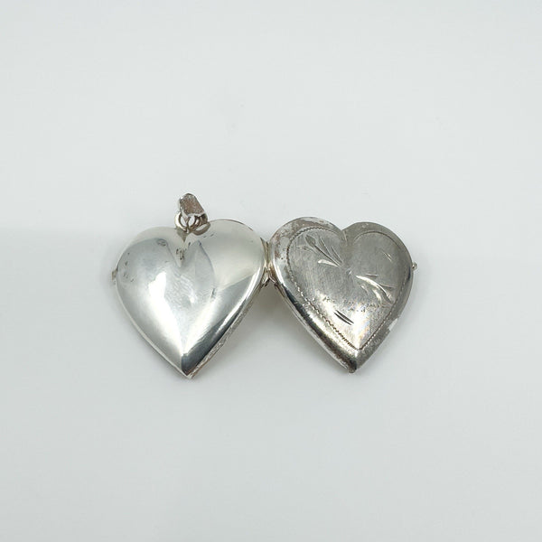 A large vintage sterling silver heart locket pendant, engraved with a detailed foliate scroll design. This statement locket opens to hold two photos, making it both a sentimental and striking jewellery piece.