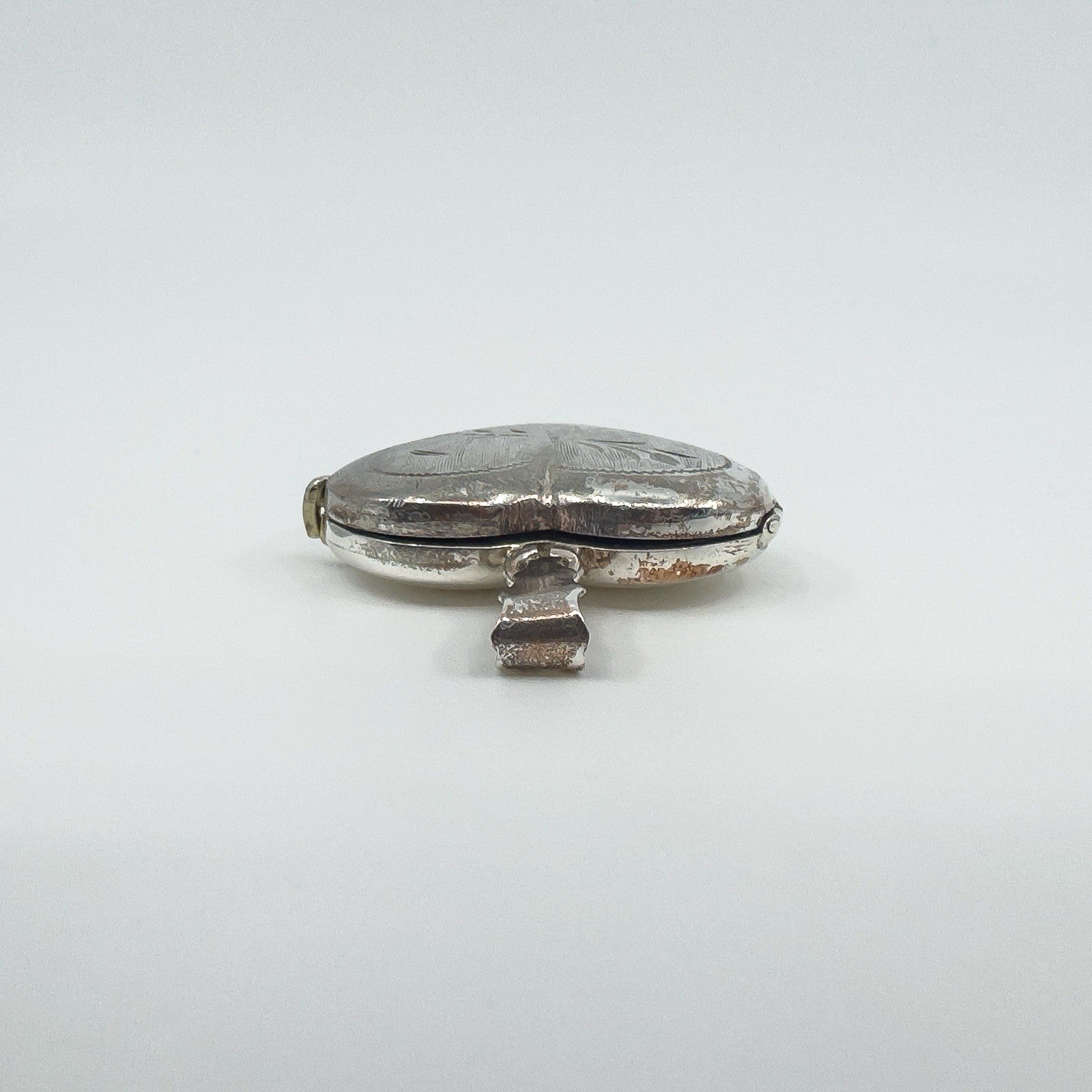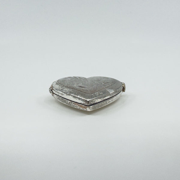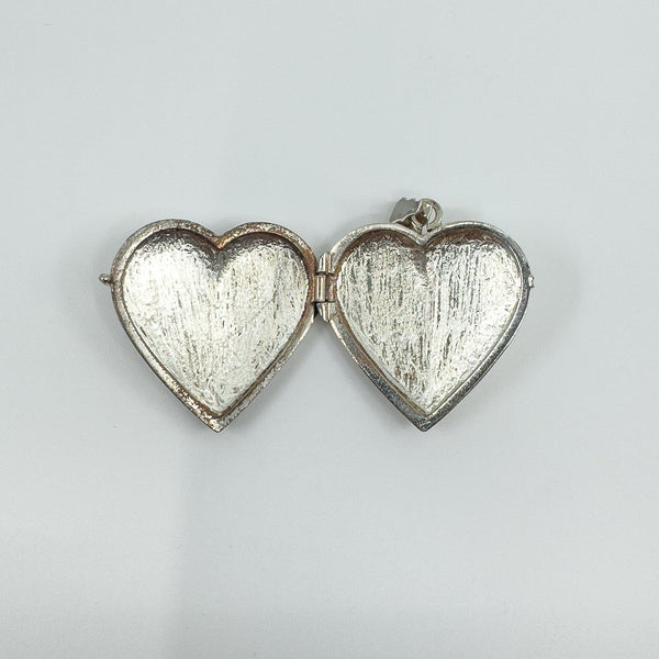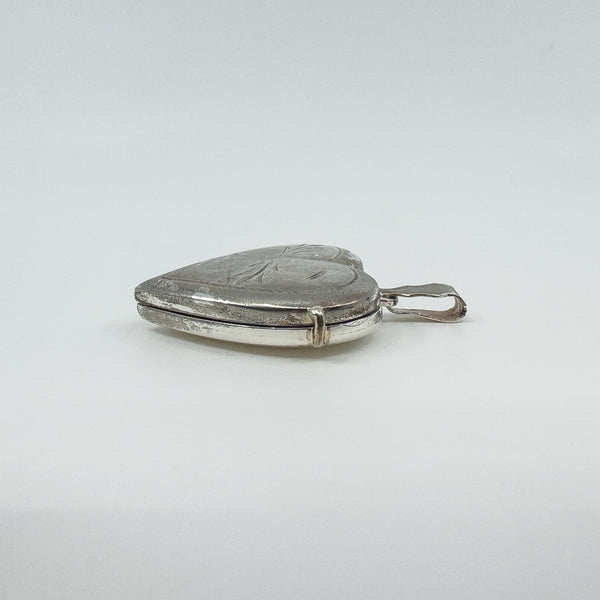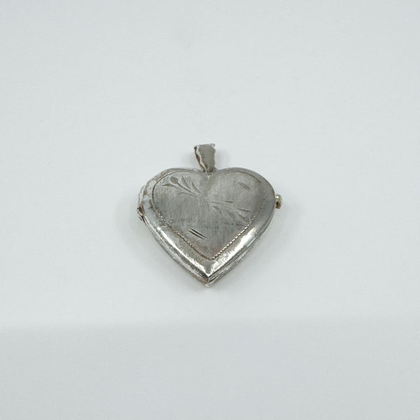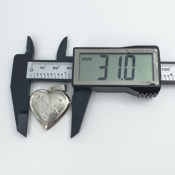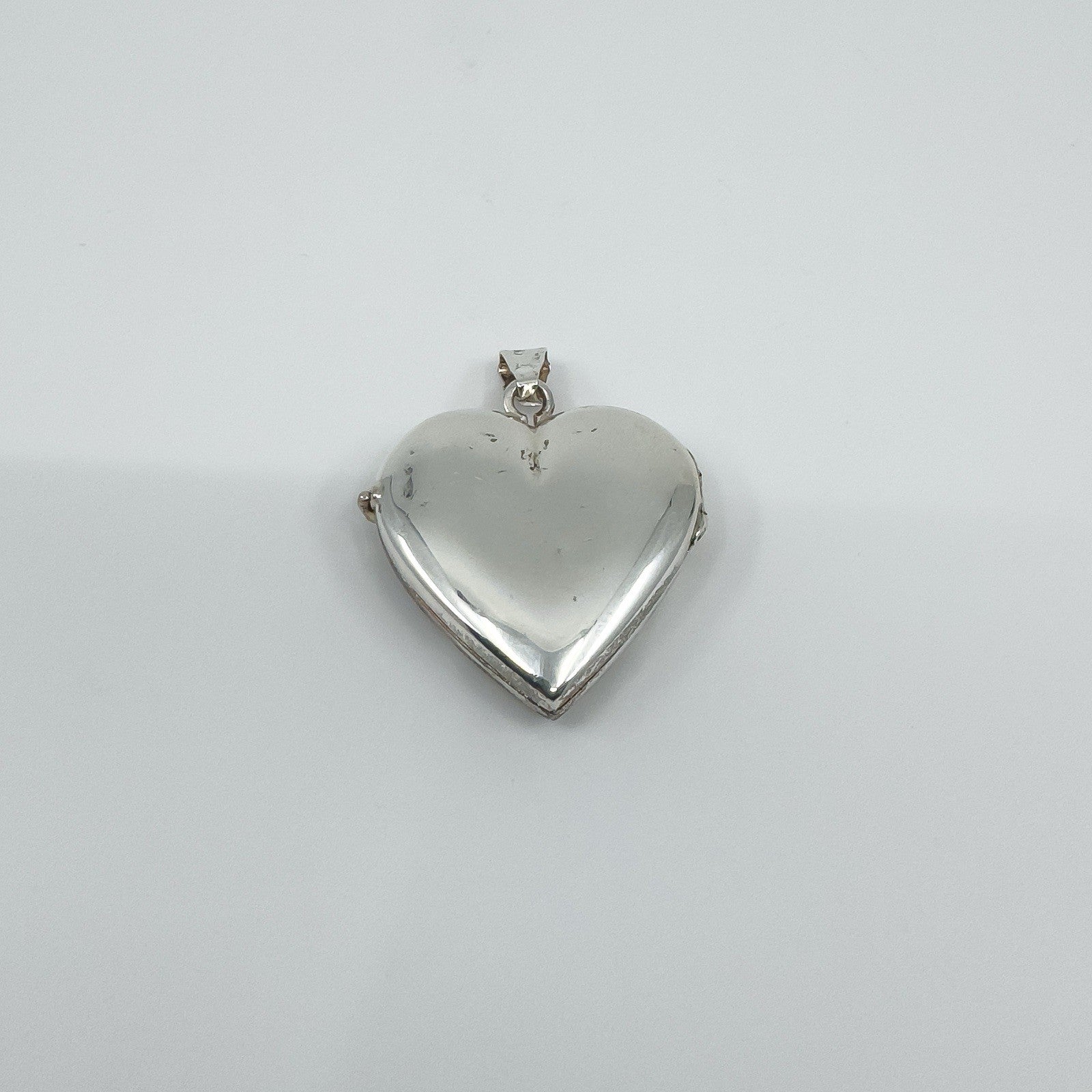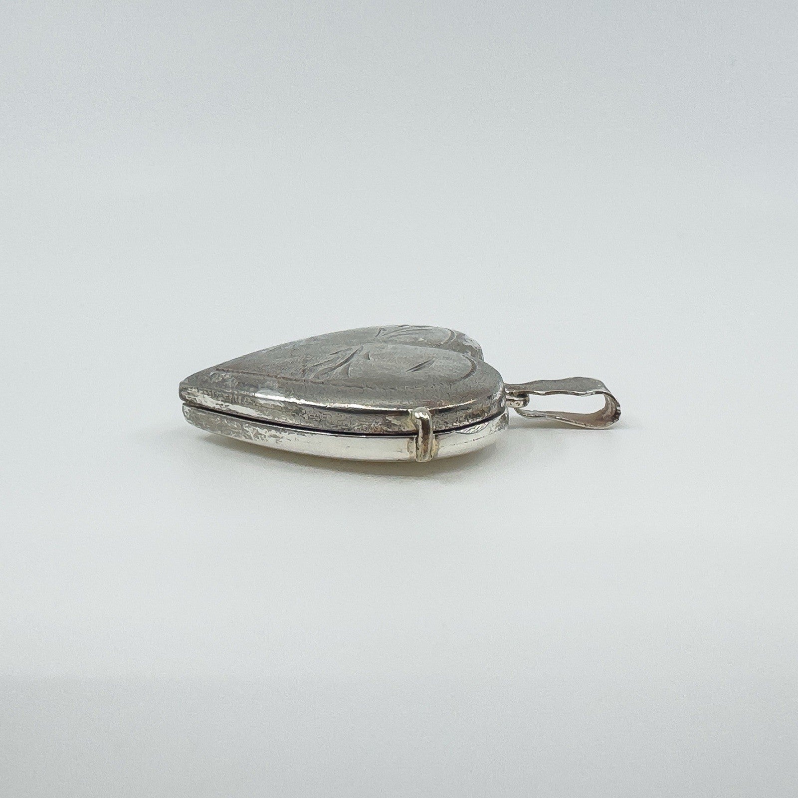 A large vintage sterling silver heart locket pendant, engraved with a detailed foliate scroll design. This statement locket opens to hold two photos, making it both a sentimental and striking jewellery piece.