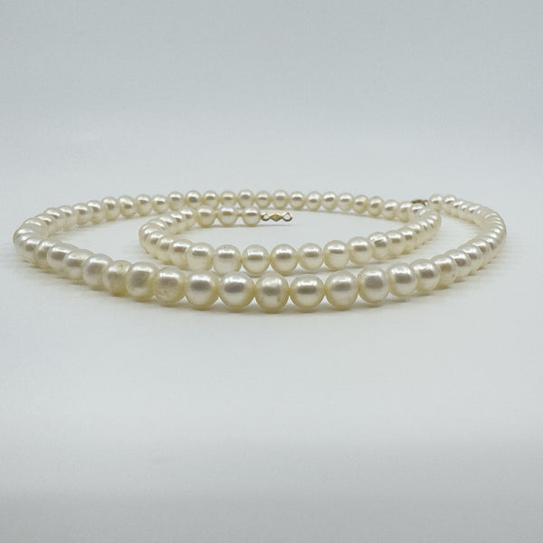A beautiful 10ct gold cultured pearl necklace, featuring creamy round pearls strung with a secure gold spring clasp. Timeless and elegant, this necklace offers understated luxury with natural lustre.