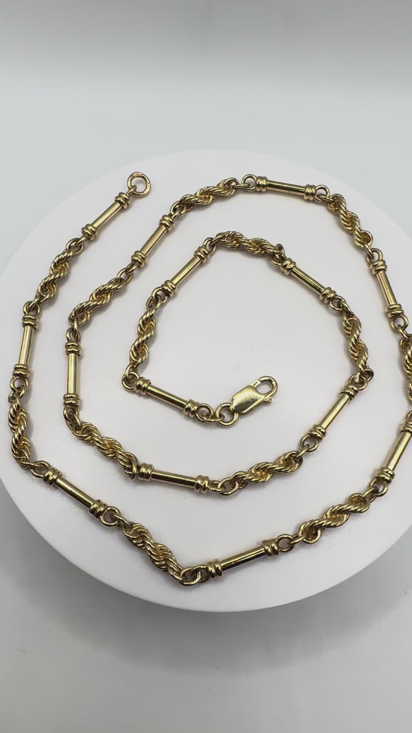 A solid 9ct gold fancy link chain featuring alternating twisted links and tubular bars, creating a striking and elegant design. This piece is beautifully crafted and hallmarked for Birmingham 1992, adding both character and authenticity.