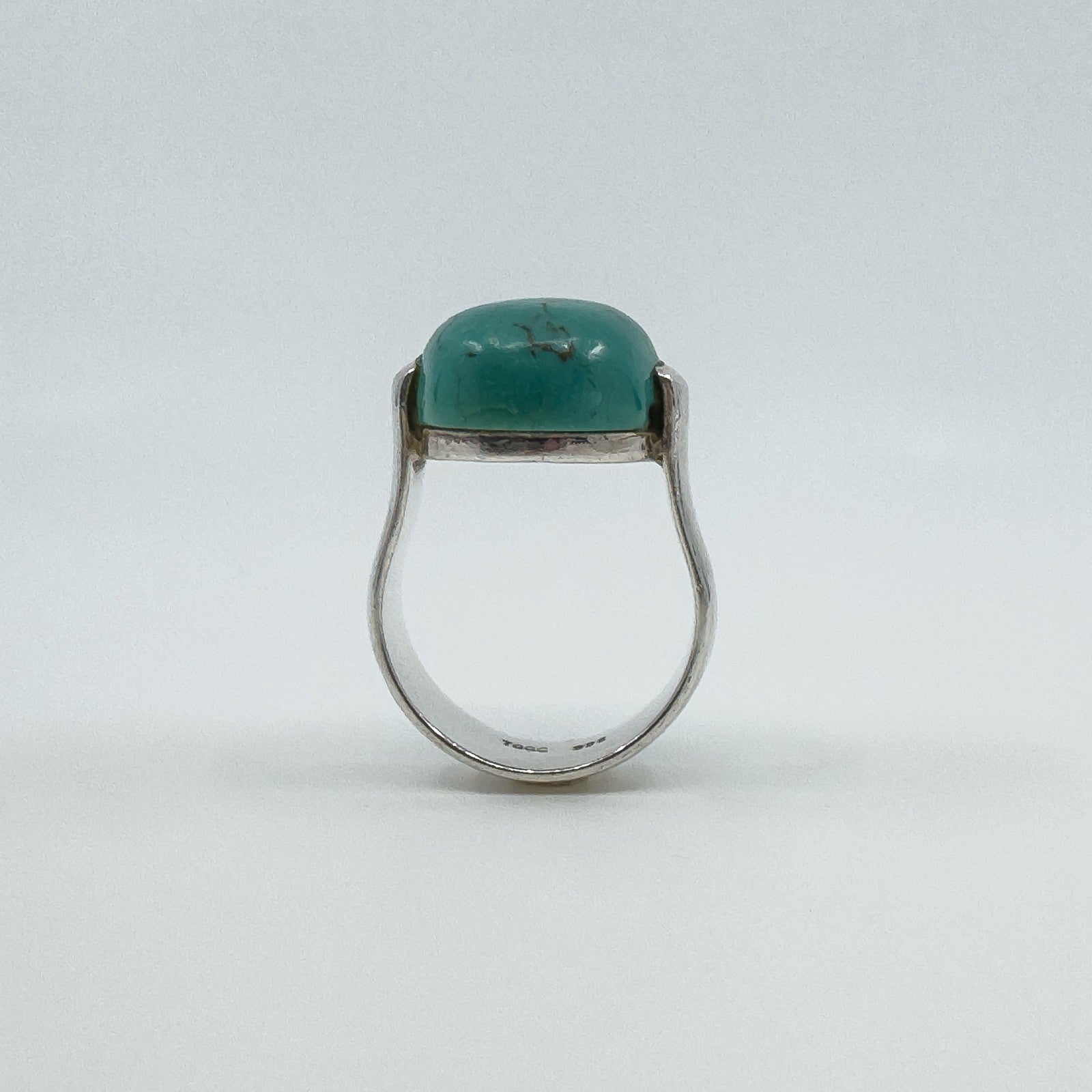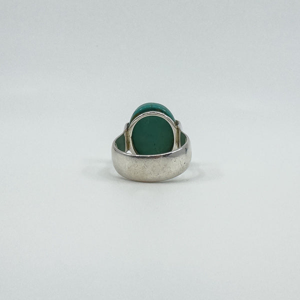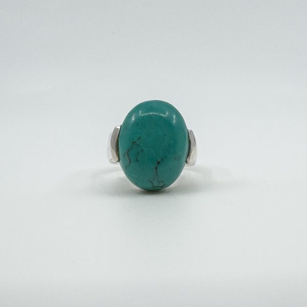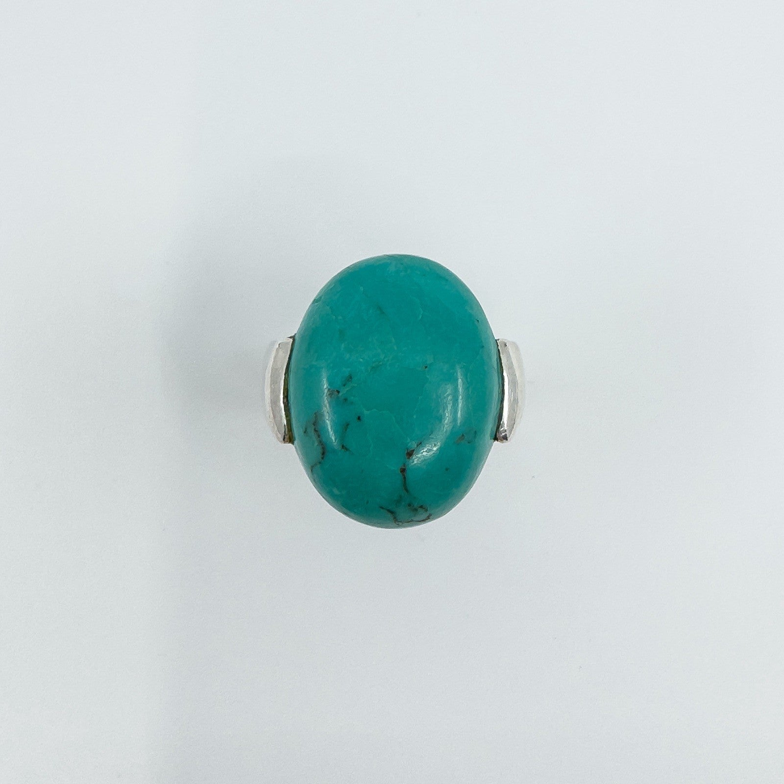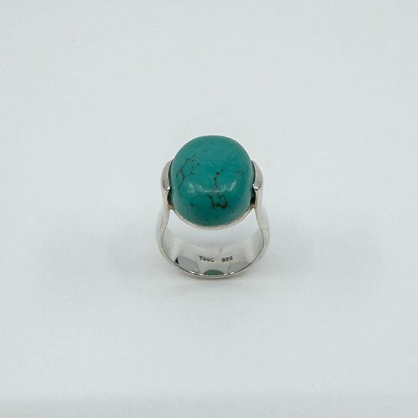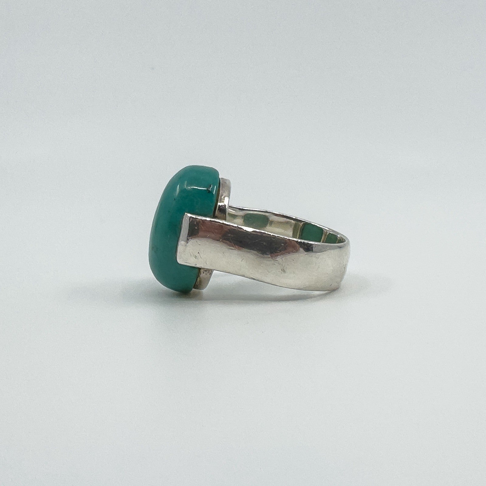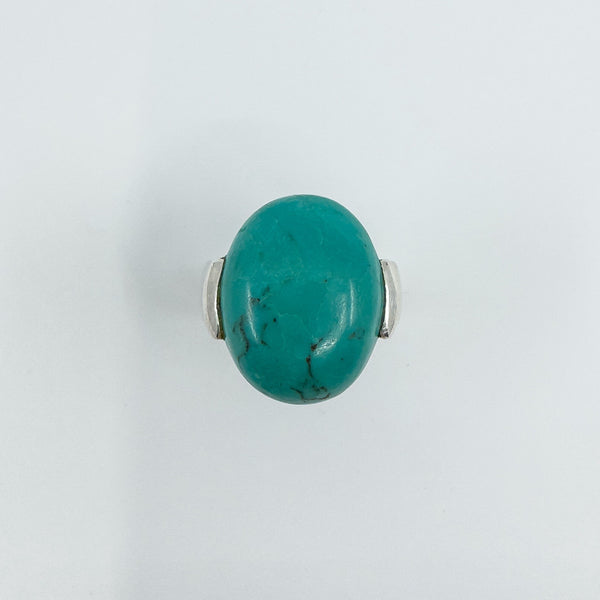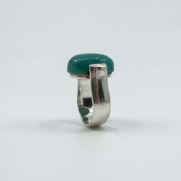 A chunky sterling silver ring set with a large natural oval turquoise. The wide band and high setting give it presence, making it a bold everyday statement or stacker.