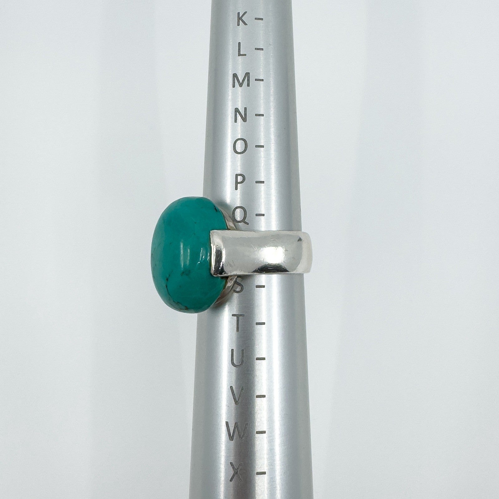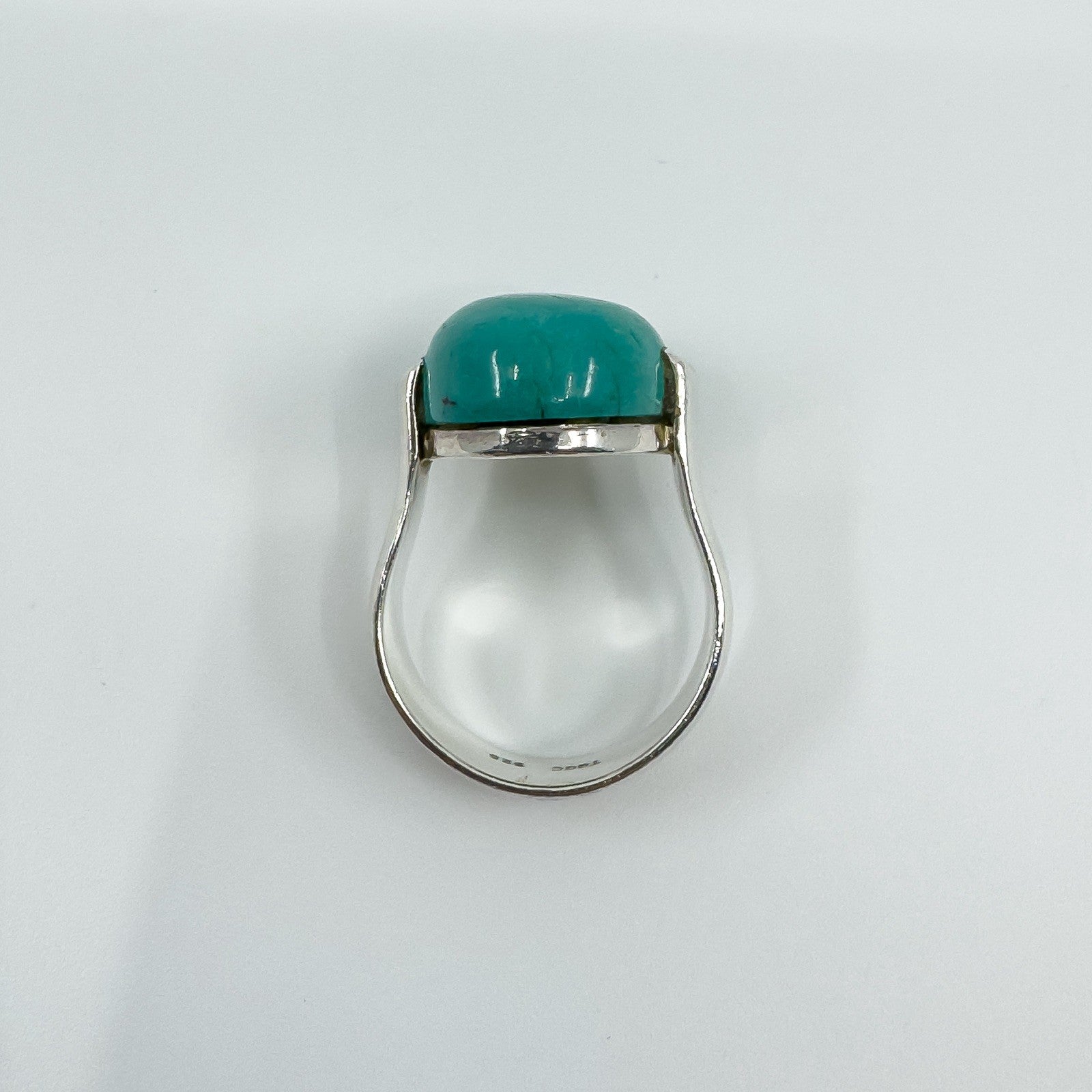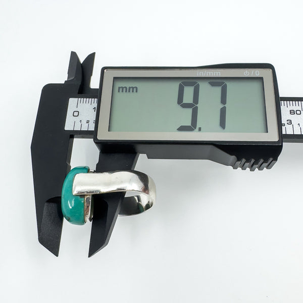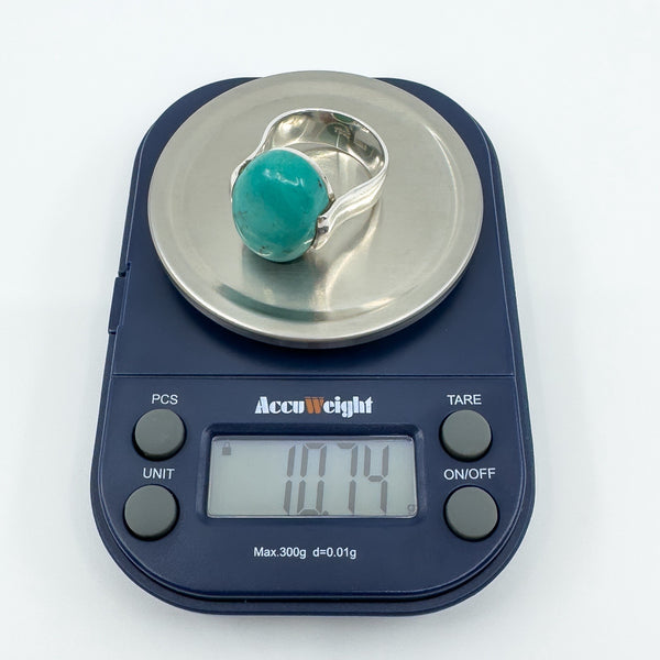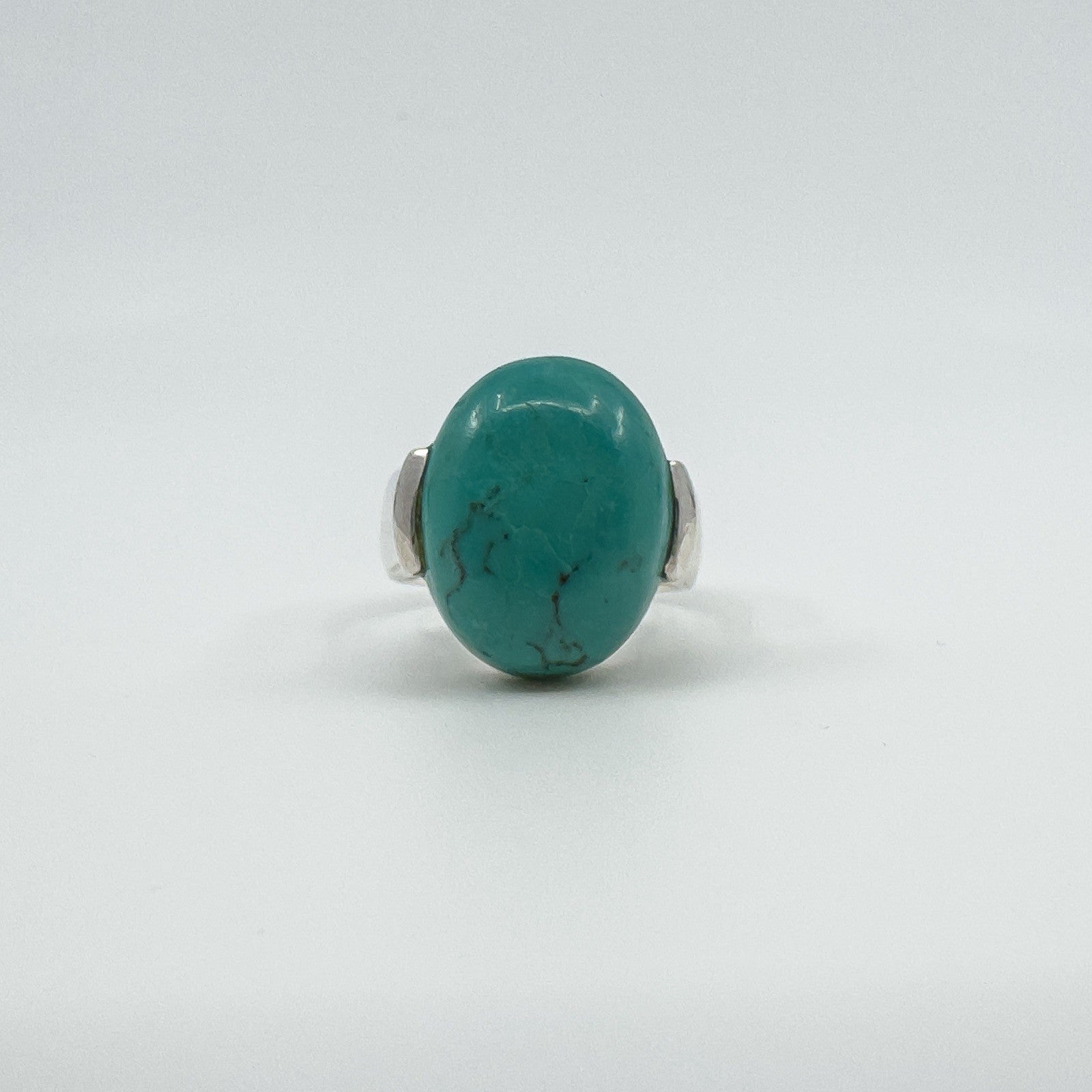 A chunky sterling silver ring set with a large natural oval turquoise. The wide band and high setting give it presence, making it a bold everyday statement or stacker.