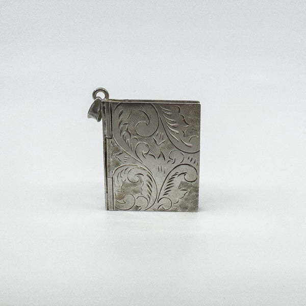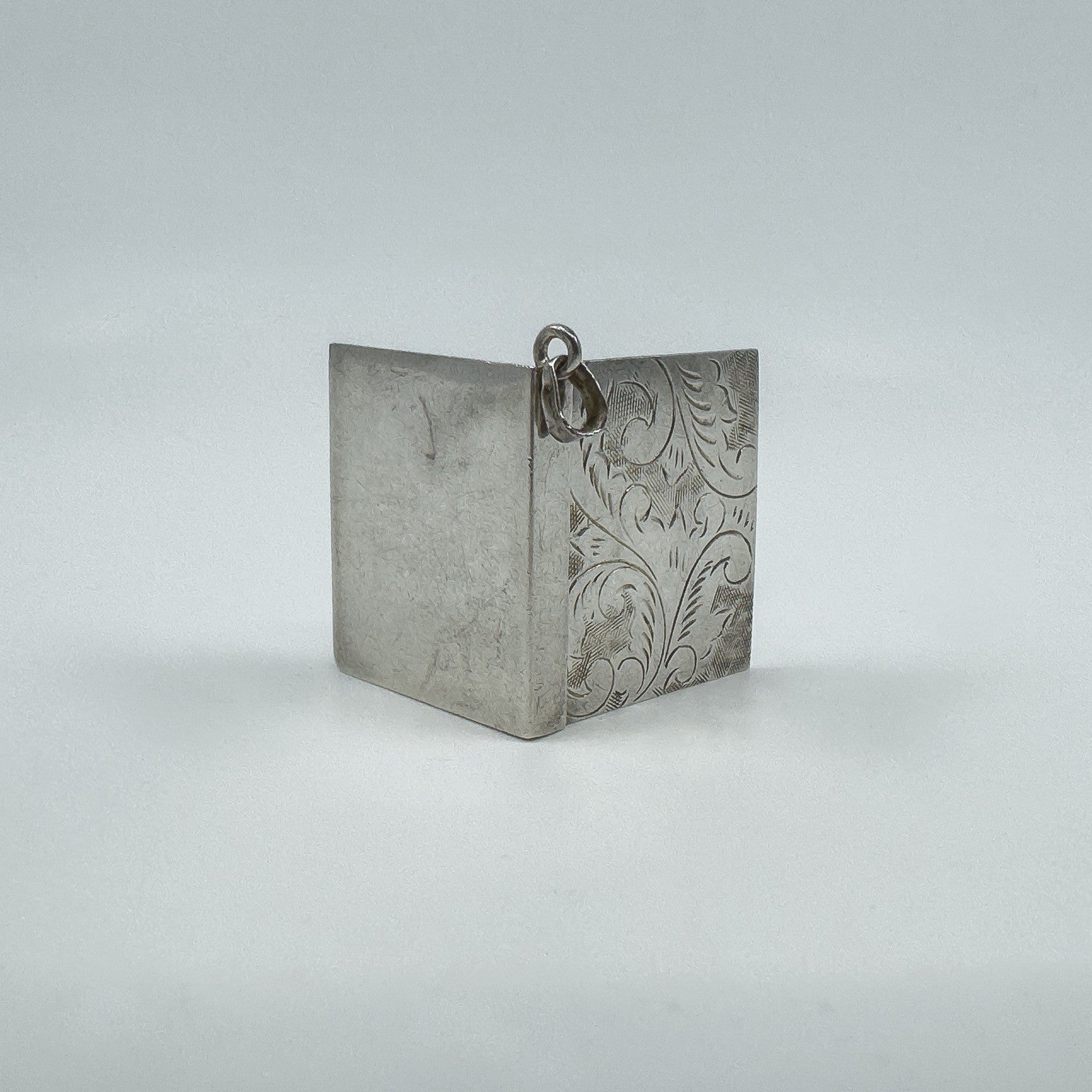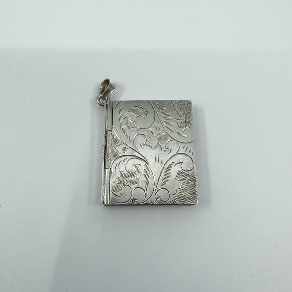 A vintage sterling silver book locket with floral engraving and a chunky feel. Complete with a bail for wearing on a chain.