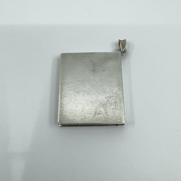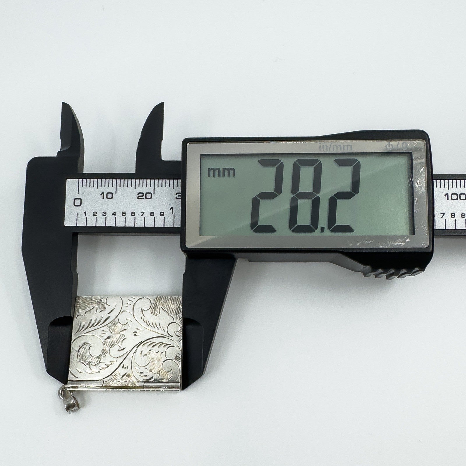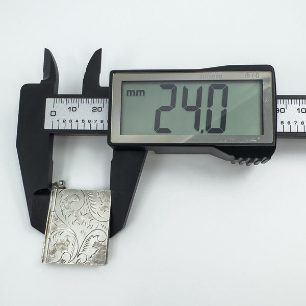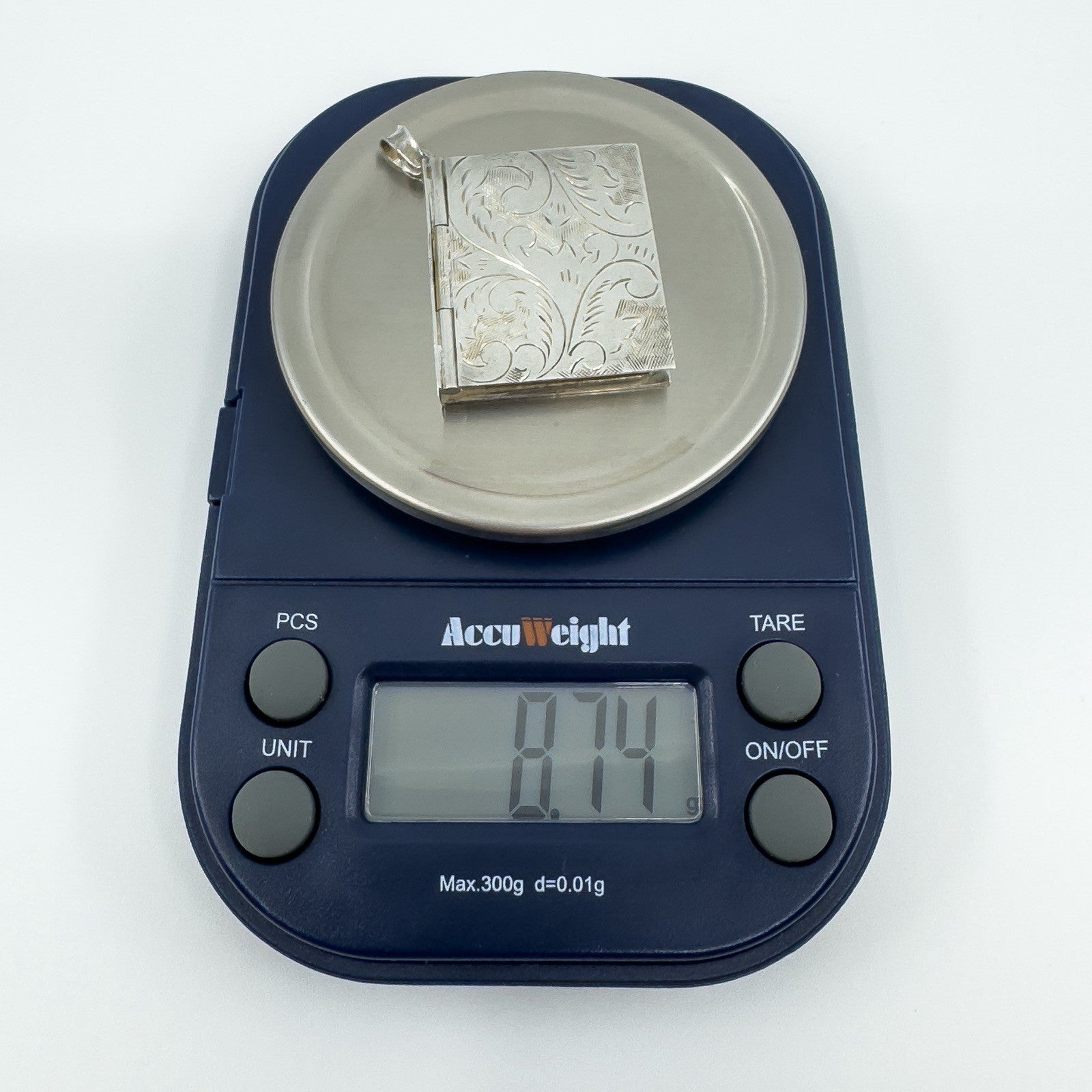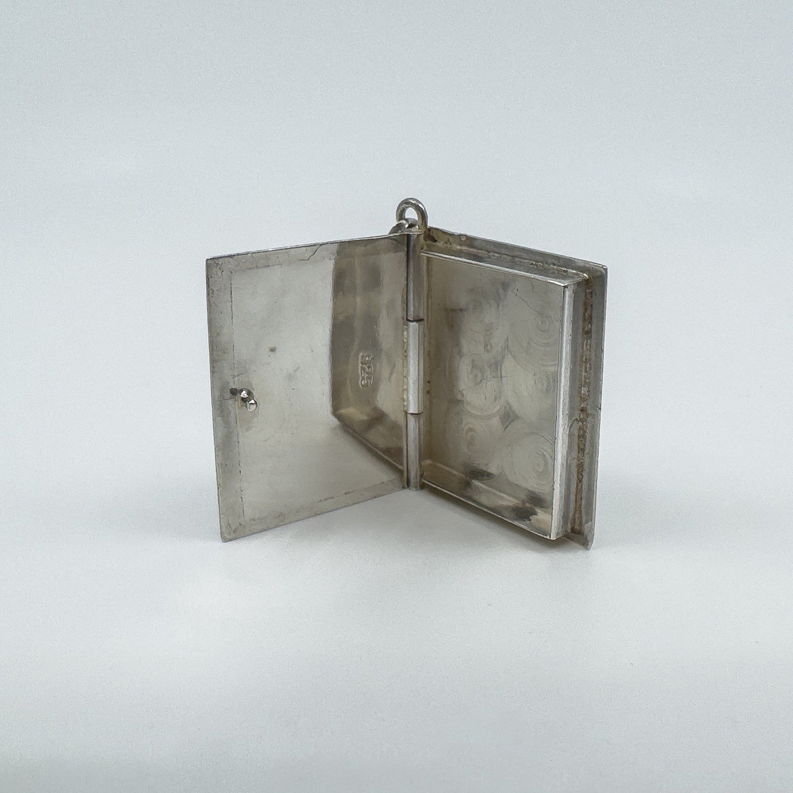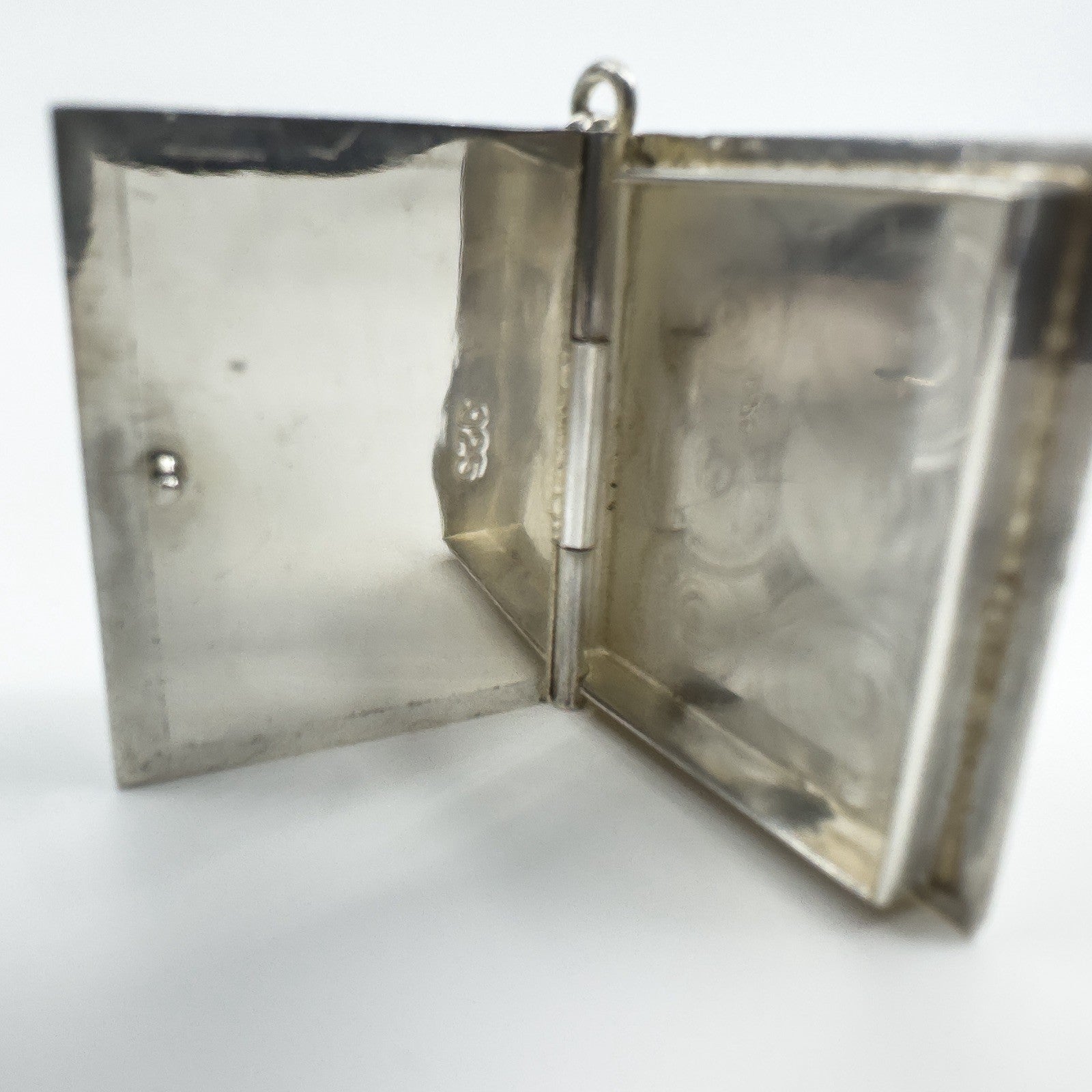 • Vintage sterling silver engraved book “secret” locket • Hinged; opens/closes securely • Holds one photo or small keepsake (rear compartment ≈3.8 mm) • Stamped 925; UK import marks; date letter E (1979) • Measures approx. 28.2 × 24 × 4.4 mm • Weight approx. 8.7 g • Complete with bail (for a chain)
