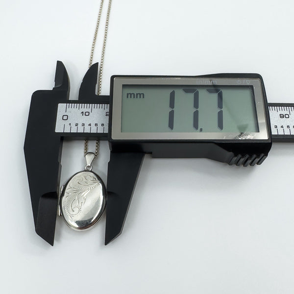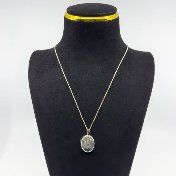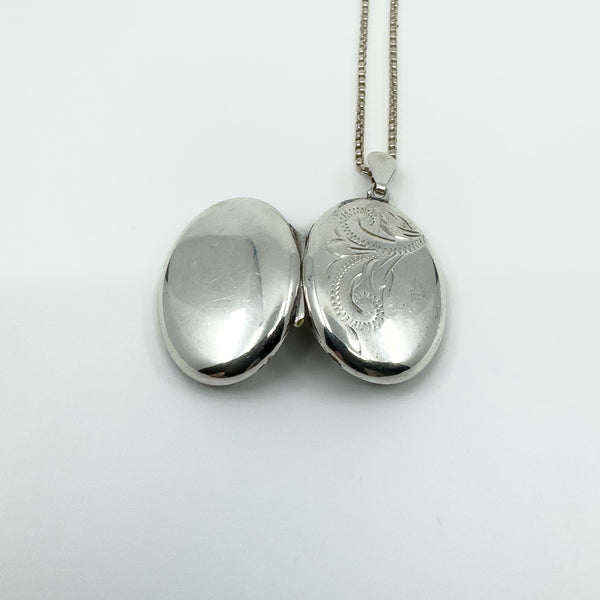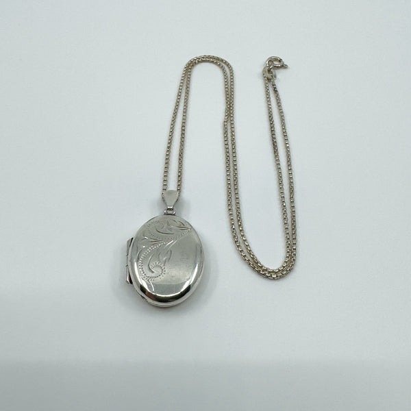 A vintage sterling silver oval locket with foliate engraving to the front, paired with a 16 inch chain.