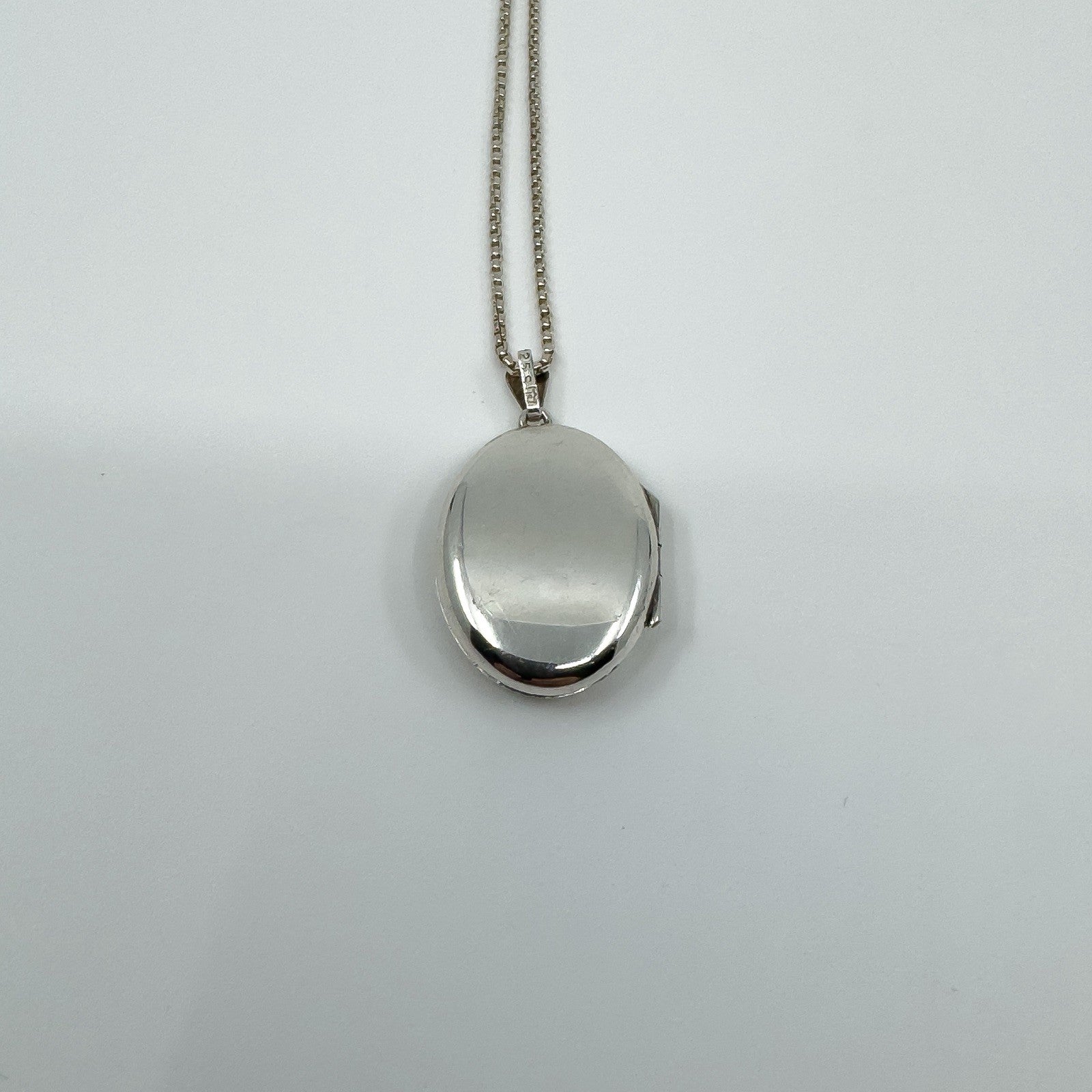 Hinged and secure, it holds two photos. The chain is stamped 925; the locket is stamped 925s JS.