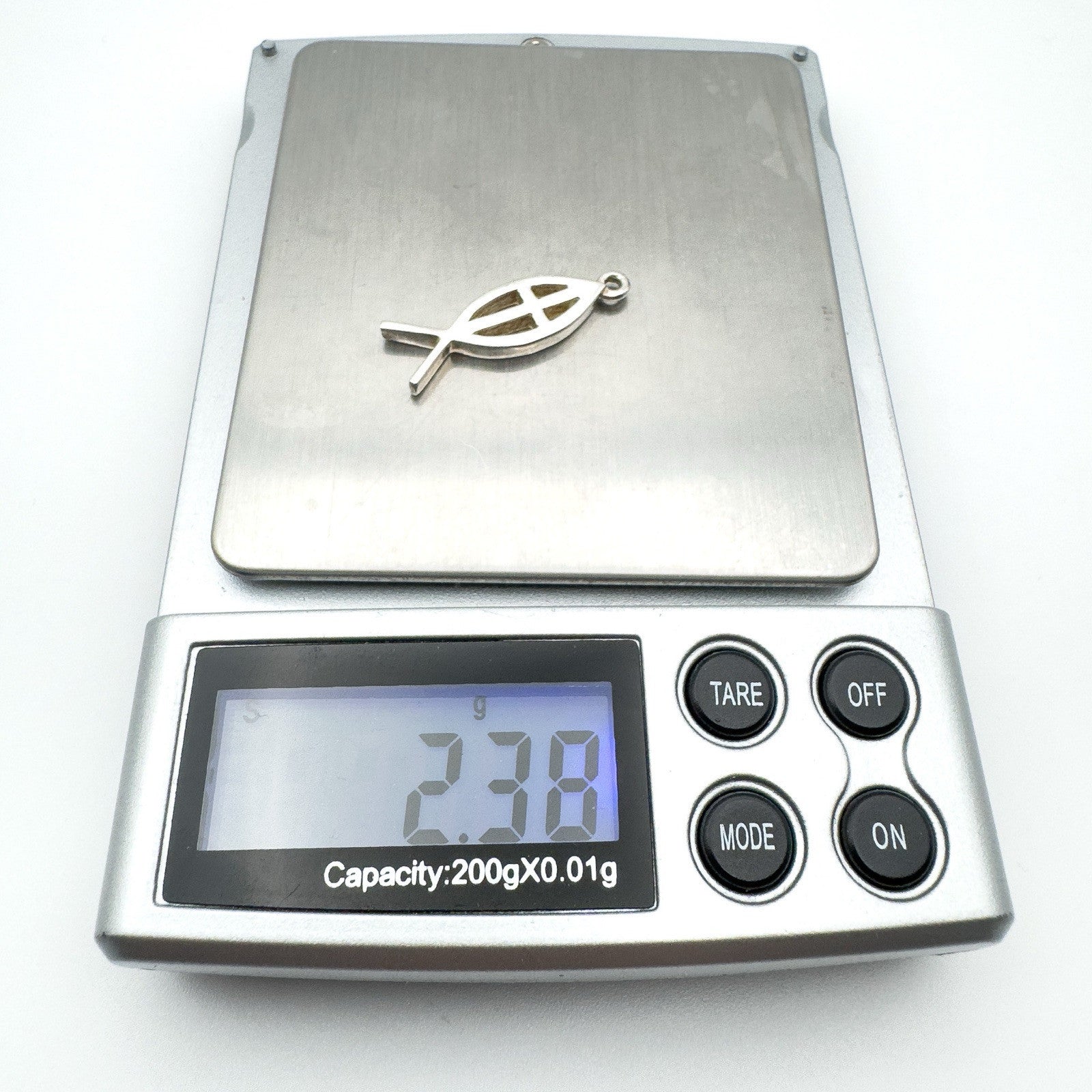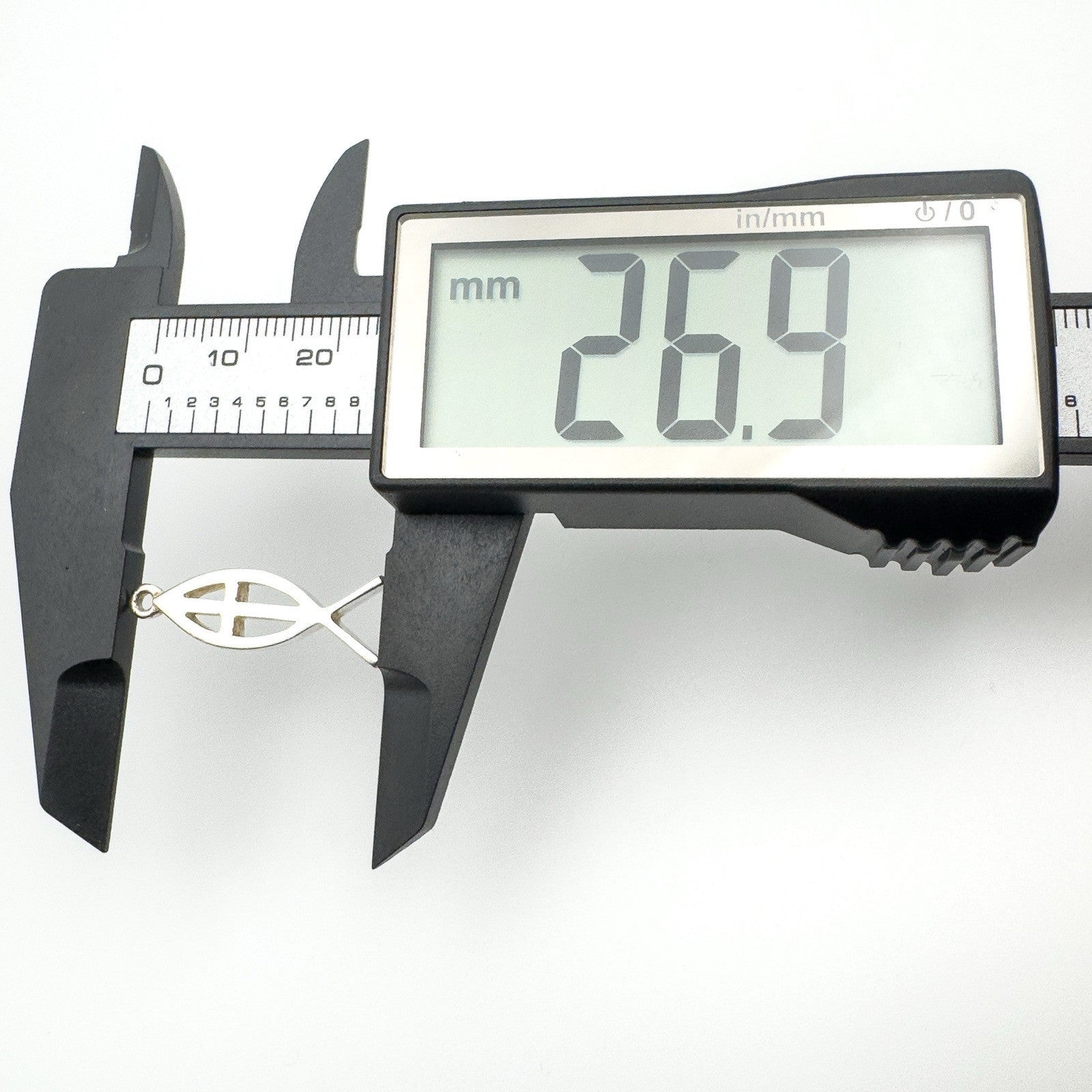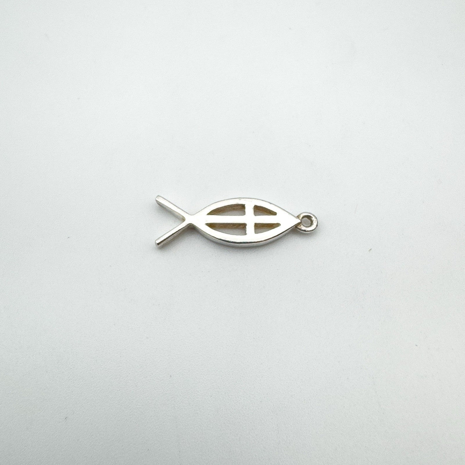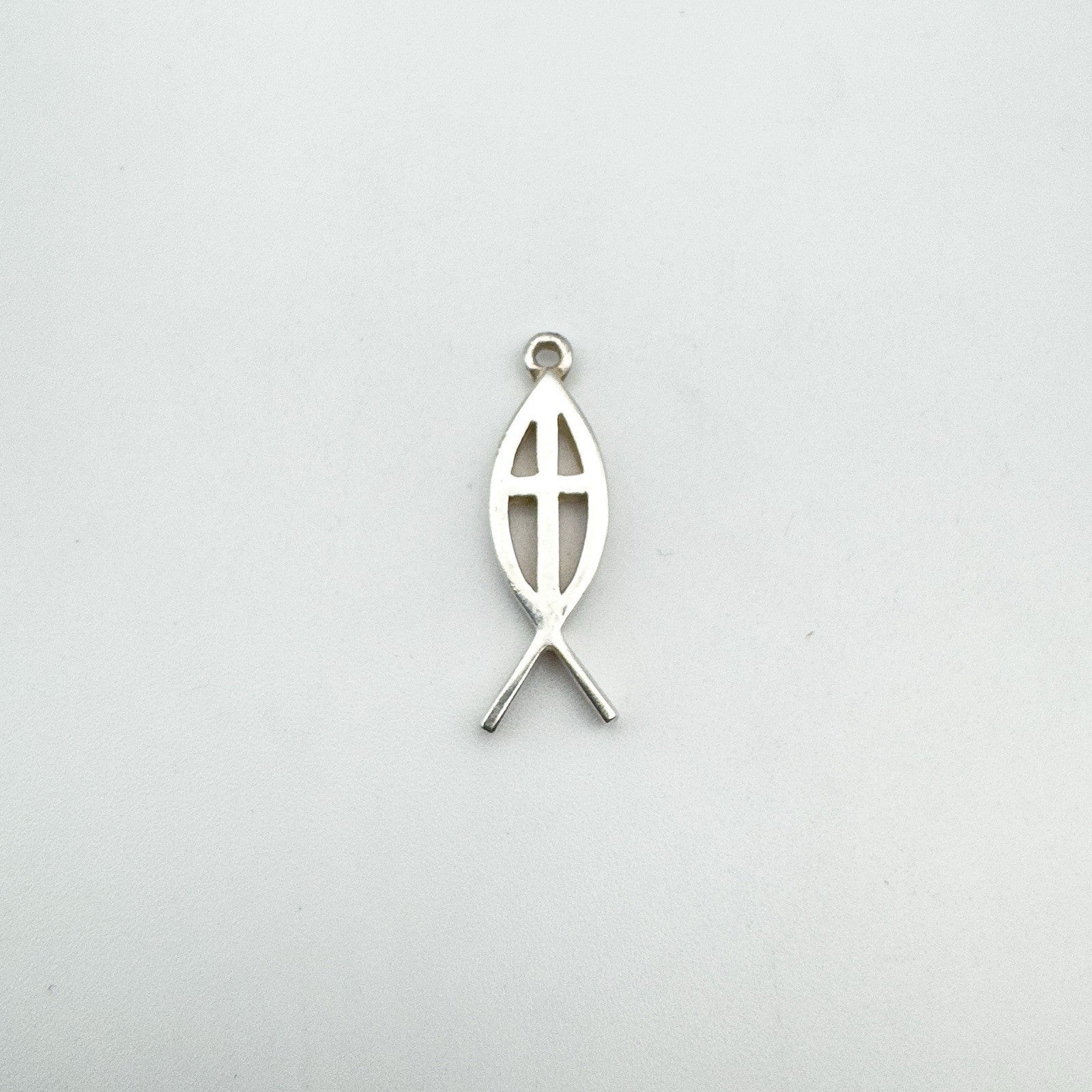 A symbolic and minimal Christian Fish Cross charm in tested sterling silver. Though unmarked, the pendant has been confirmed as 925 silver and is now fitted with a new jump ring for easy wear.