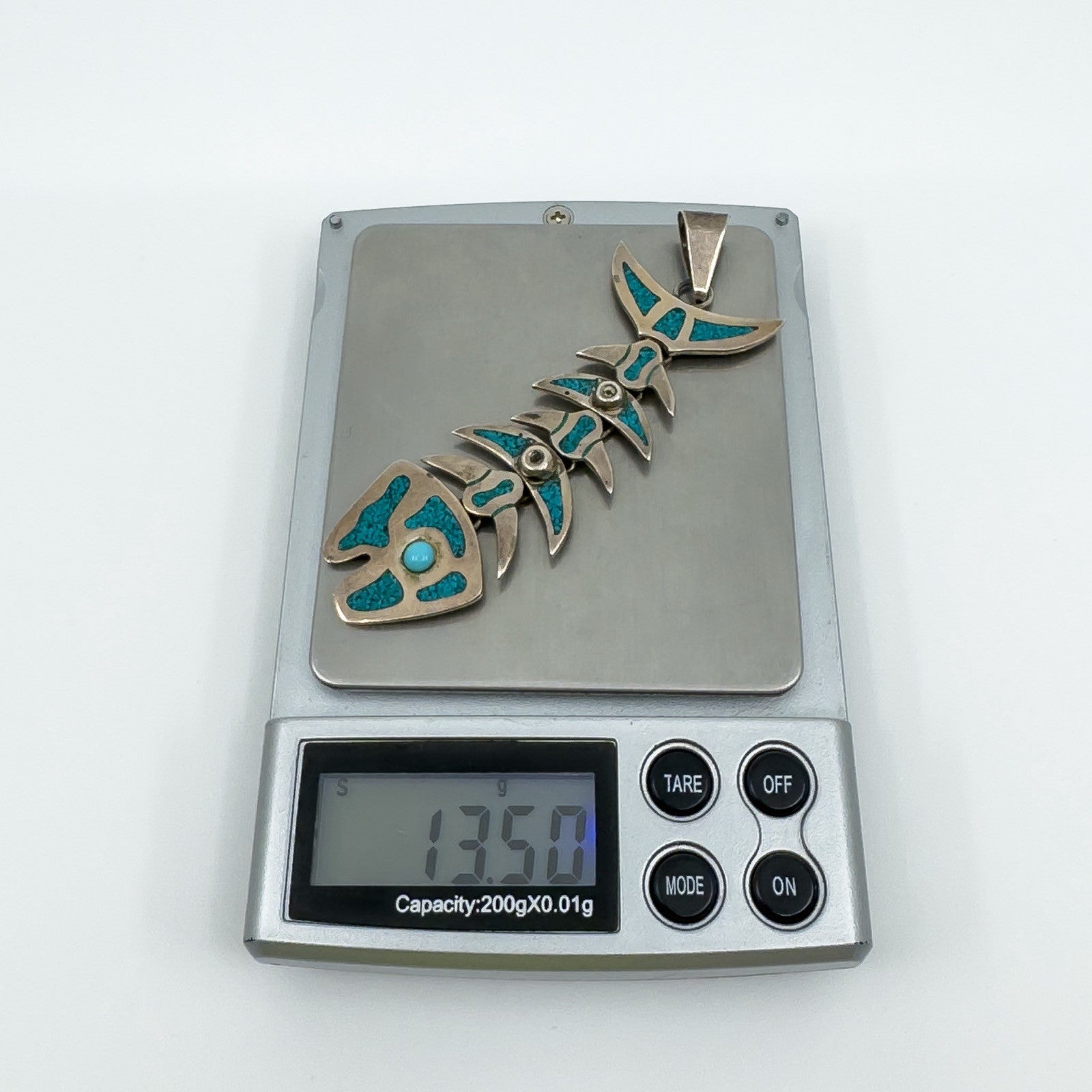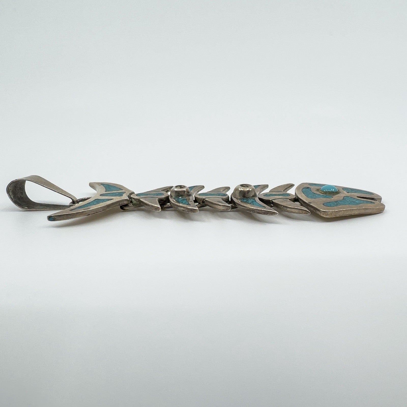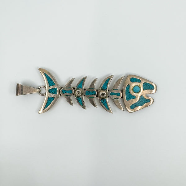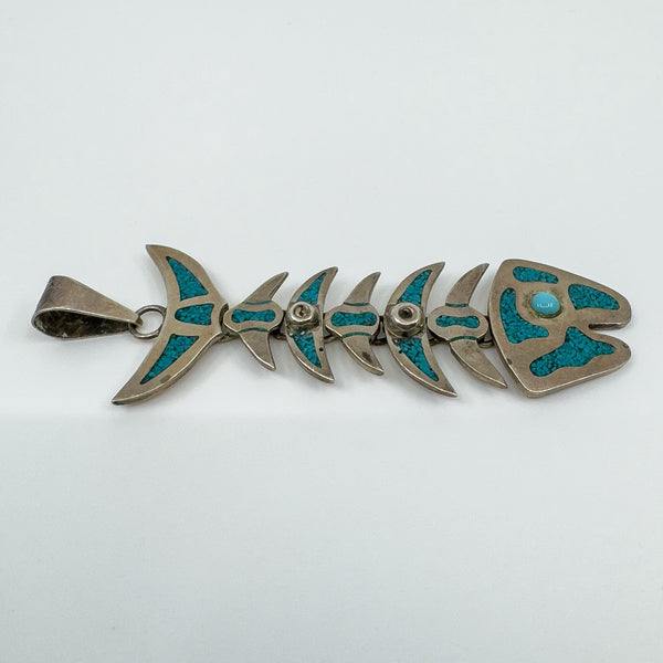 A large vintage sterling silver articulated skeleton fish pendant set with turquoise. The articulated design gives the piece movement and character, making it a unique statement pendant.