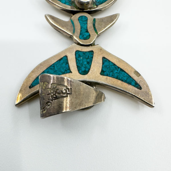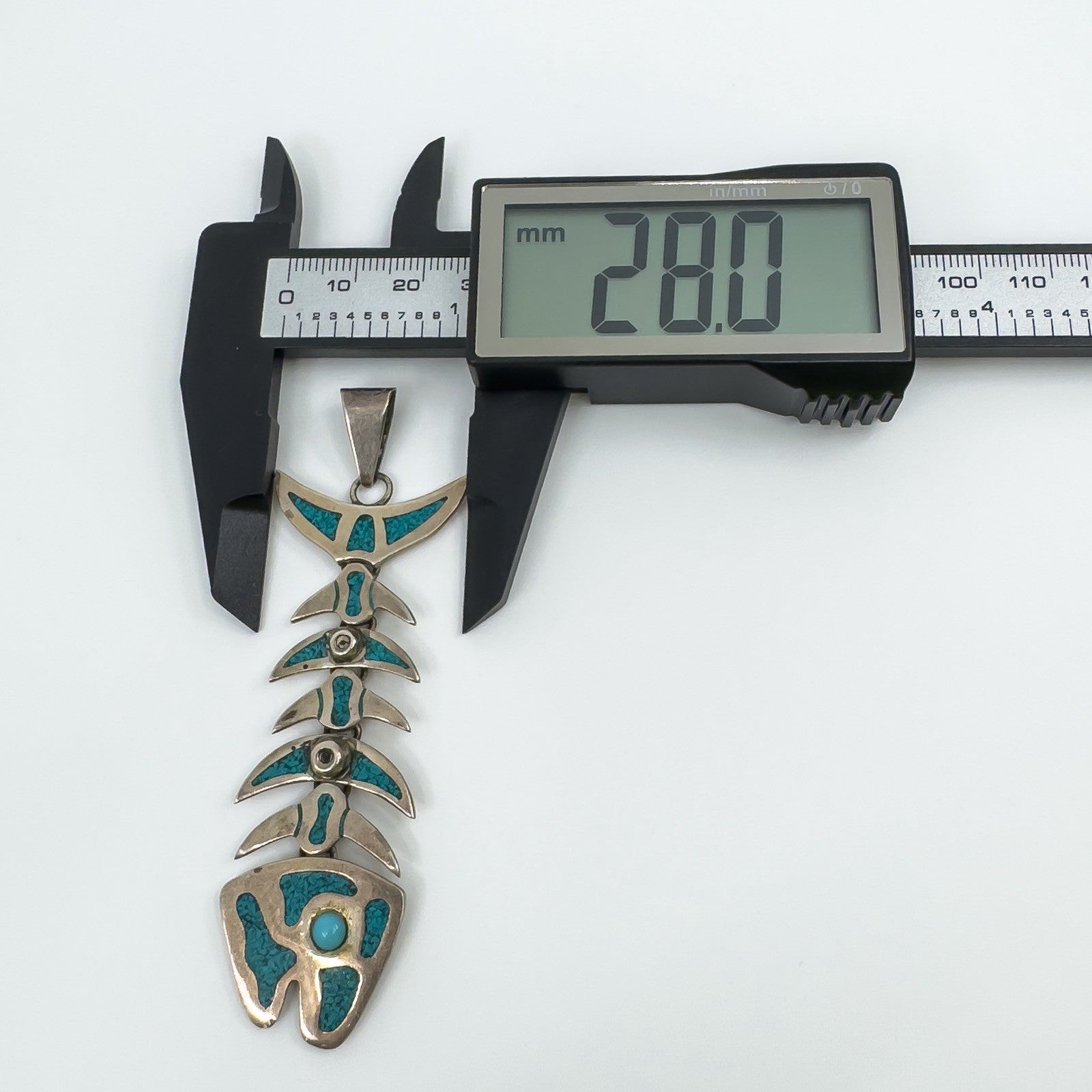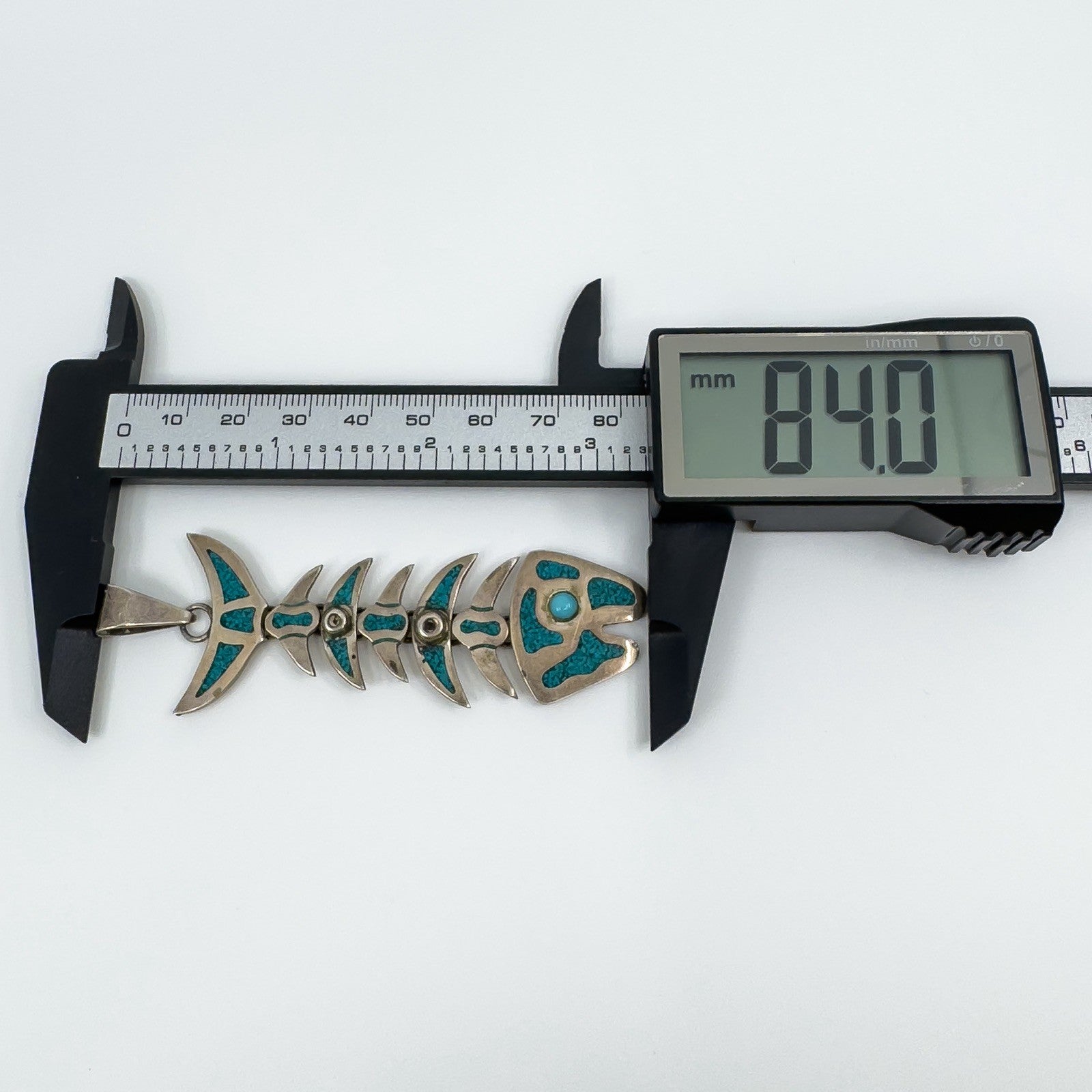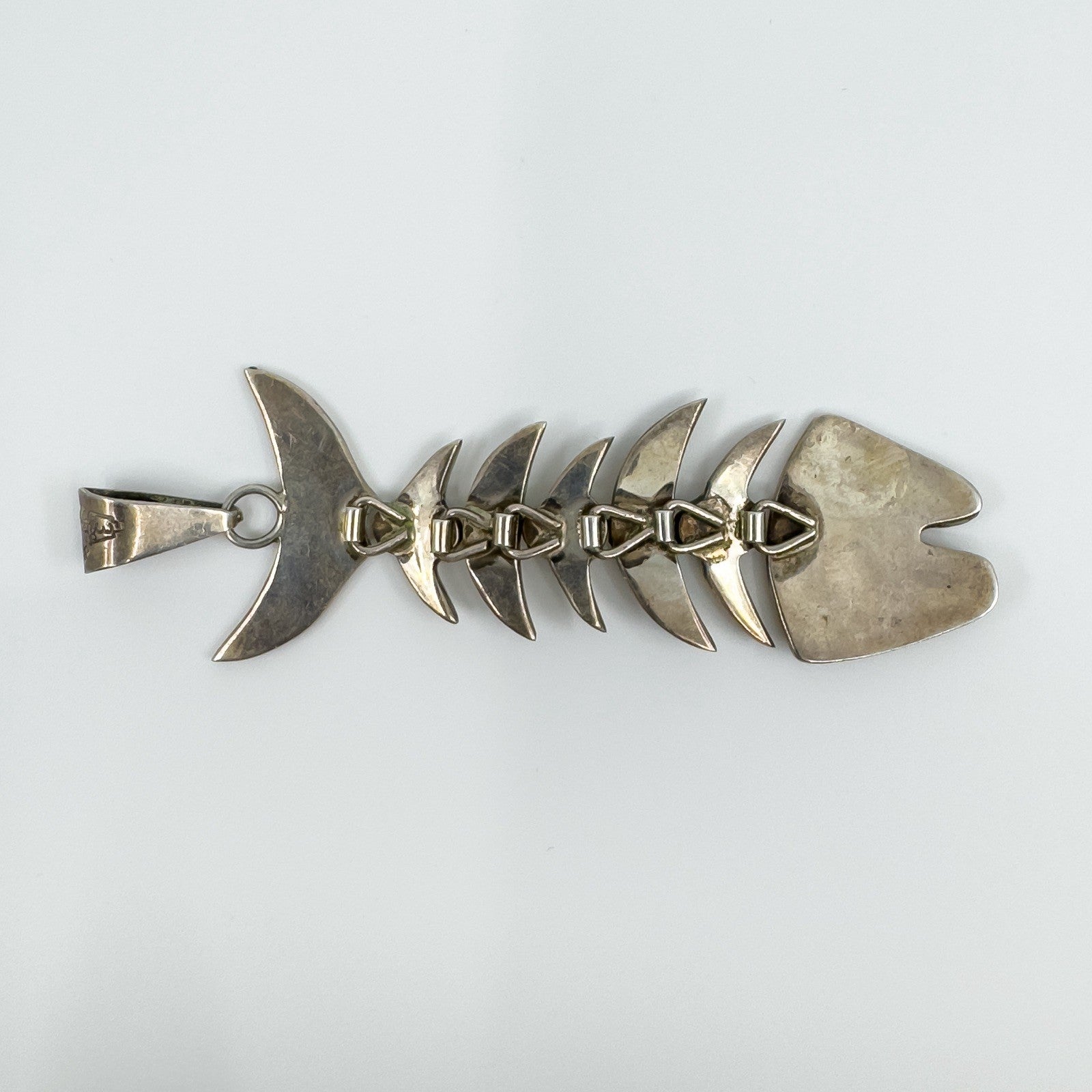 A large vintage sterling silver articulated skeleton fish pendant set with turquoise. The articulated design gives the piece movement and character, making it a unique statement pendant.