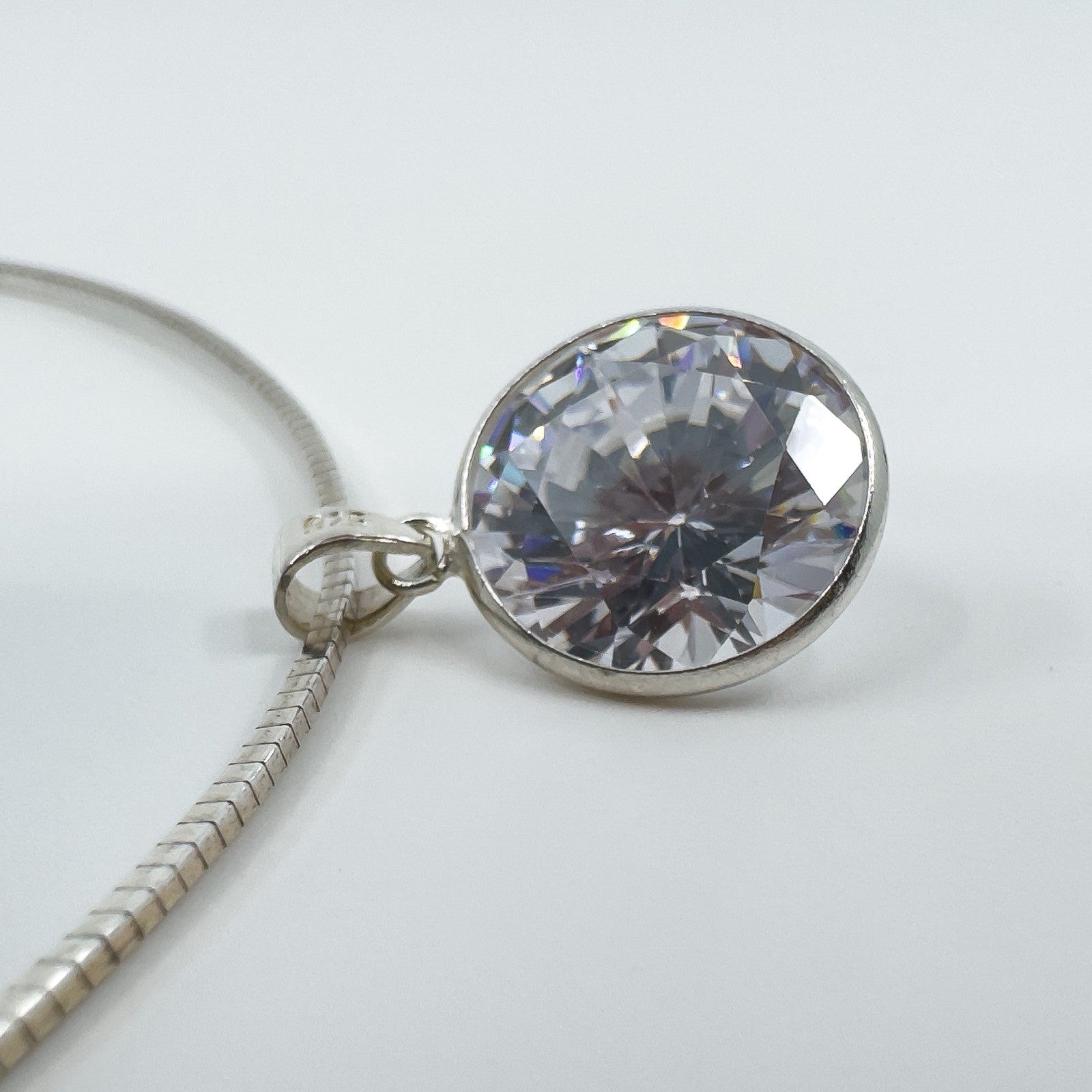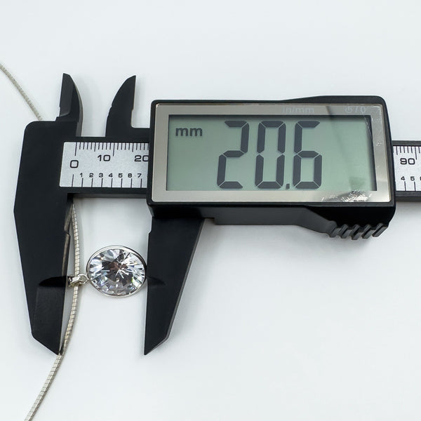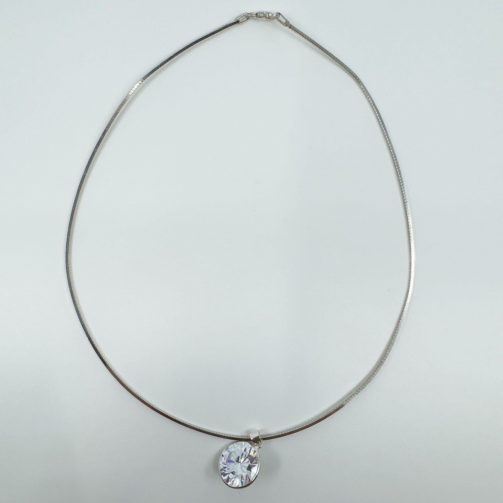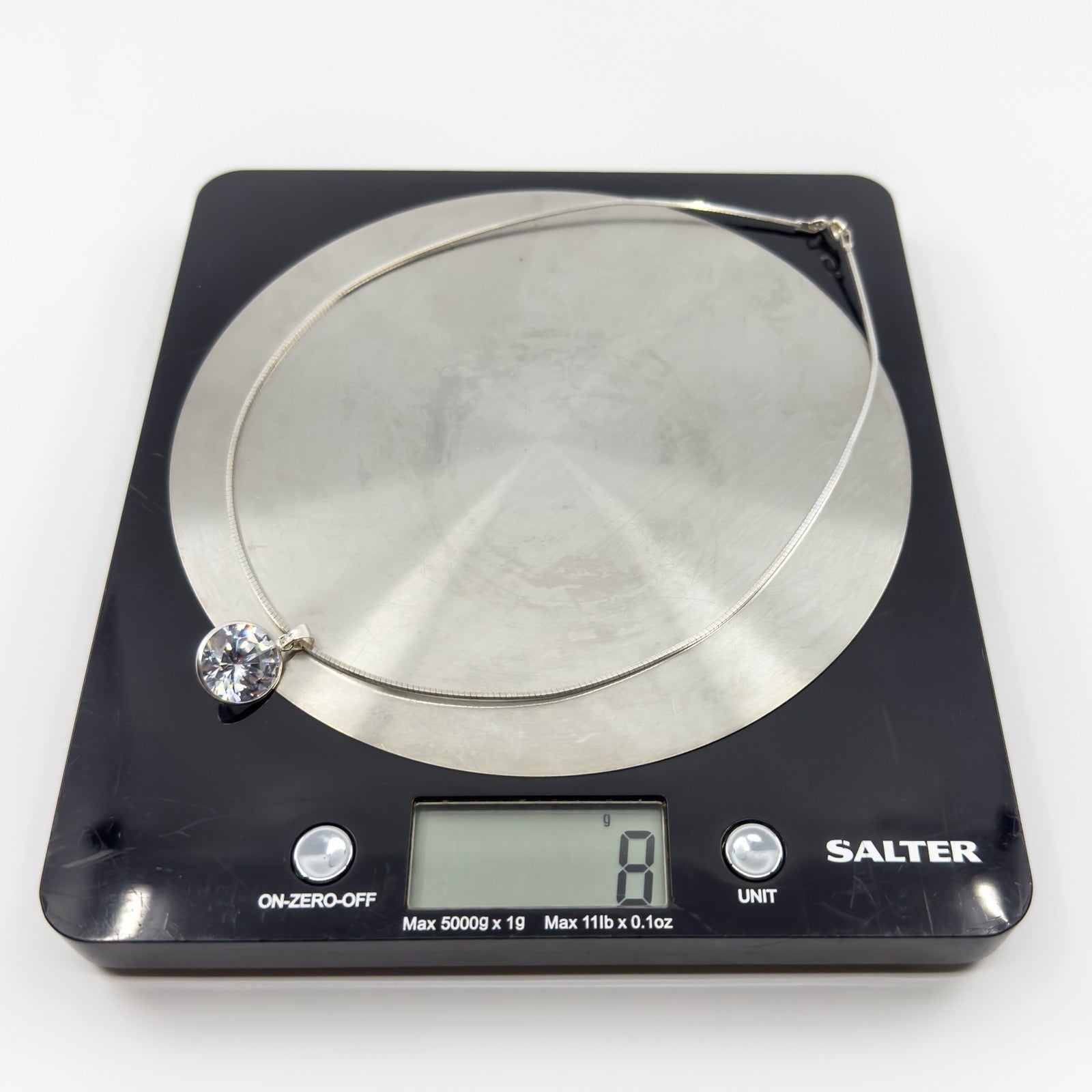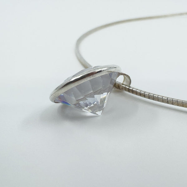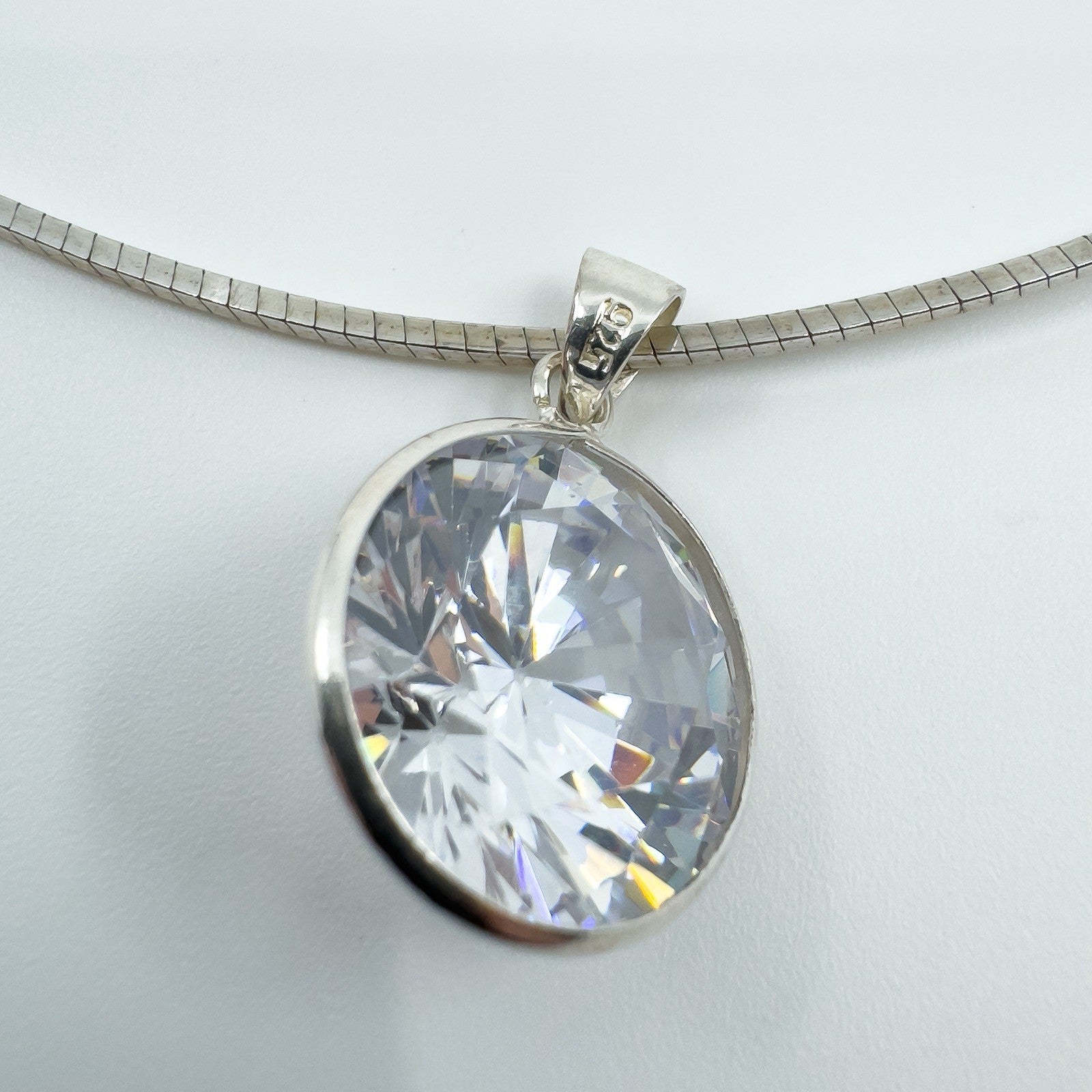 • Sterling silver CZ pendant on 16 inch omega chain• Round CZ in bezel setting (est. ≈10.5 ct)• Stamped 925• Pendant approx. 20.6 × 14.7 × 8.4 mm• Chain thickness approx. 1.1 mm• Combined weight approx. 8 g