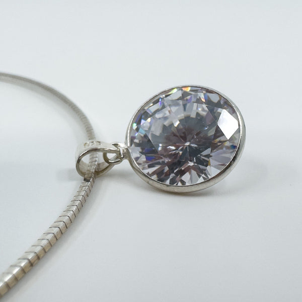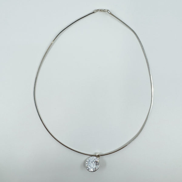 A sterling silver pendant set with a large round cubic zirconia (est. 10.5 ct) in a bezel setting, on a 16 inch omega chain.