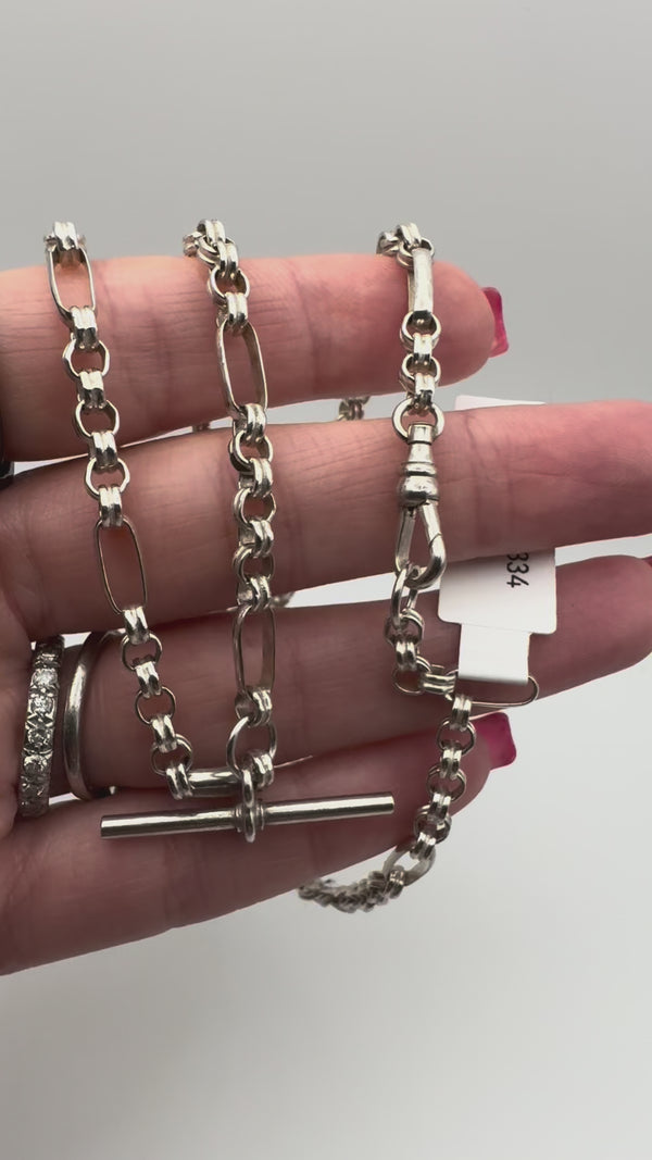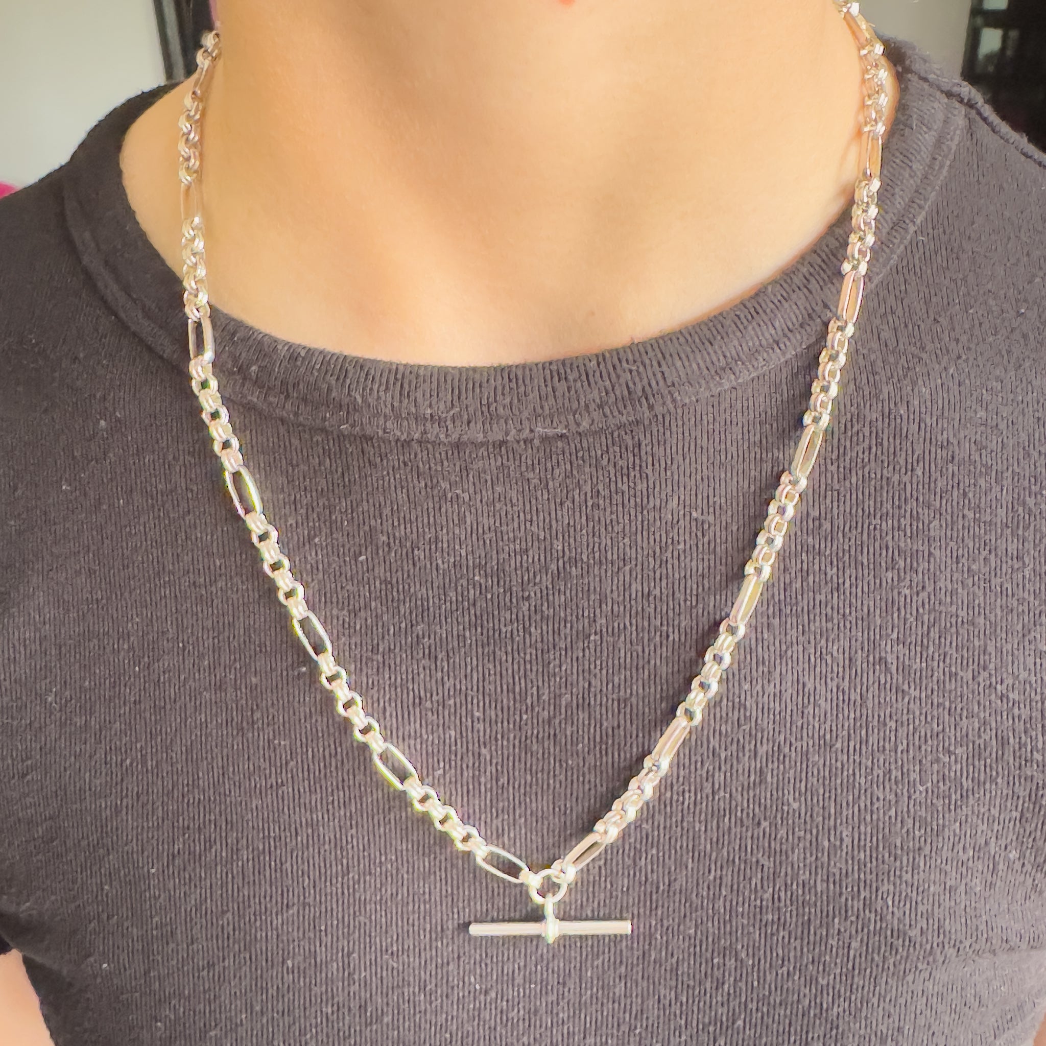 A bold vintage piece featuring a solid sterling silver T-Bar pendant on a 20” inch fancy link chain. The pendant hangs from a swivel dog clip clasp stamped “STERLING”, while the hoop is hallmarked with CB, Rose, and 925 (Sheffield).