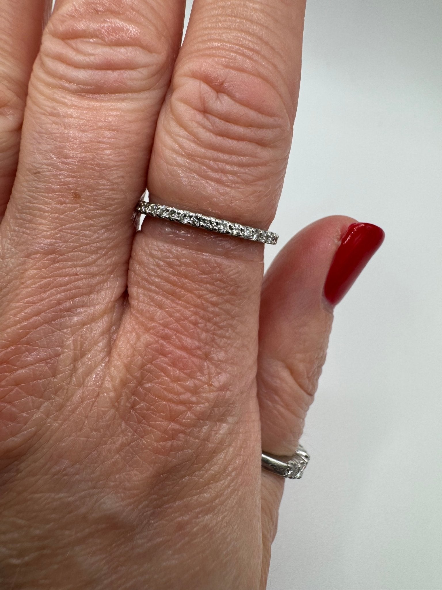 • 14ct white gold diamond three-quarter eternity band • Natural round diamonds (tested), est. total ≈0.35 ct • Prong set; low profile • Head measures approx. 18.9 × 1.9 mm • Band underside approx. 1.8 mm • Depth approx. 2 mm • Weight approx. 1.9 g • Ring size O • Stamped 14K