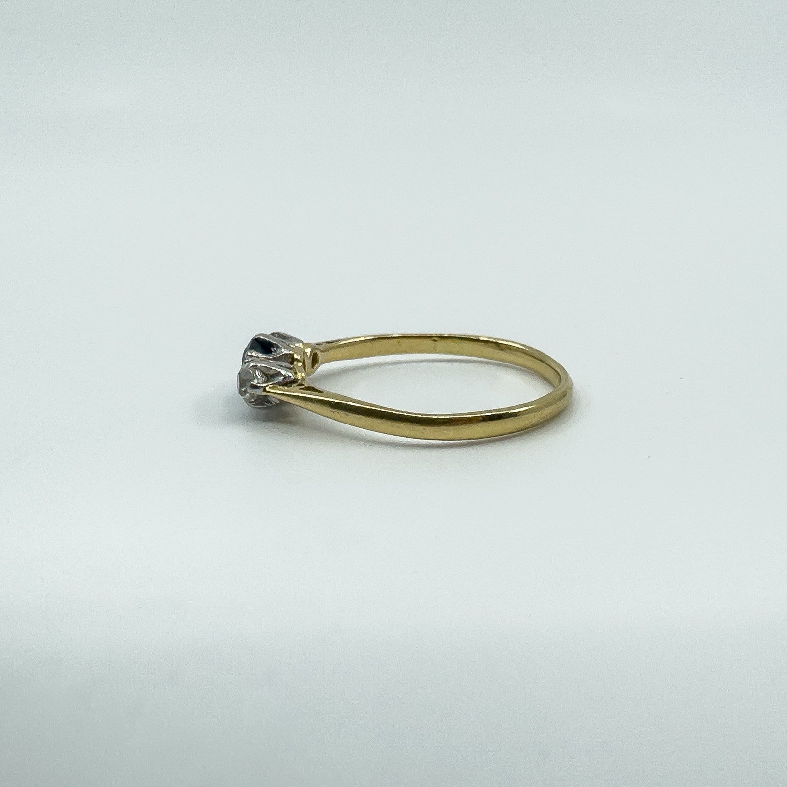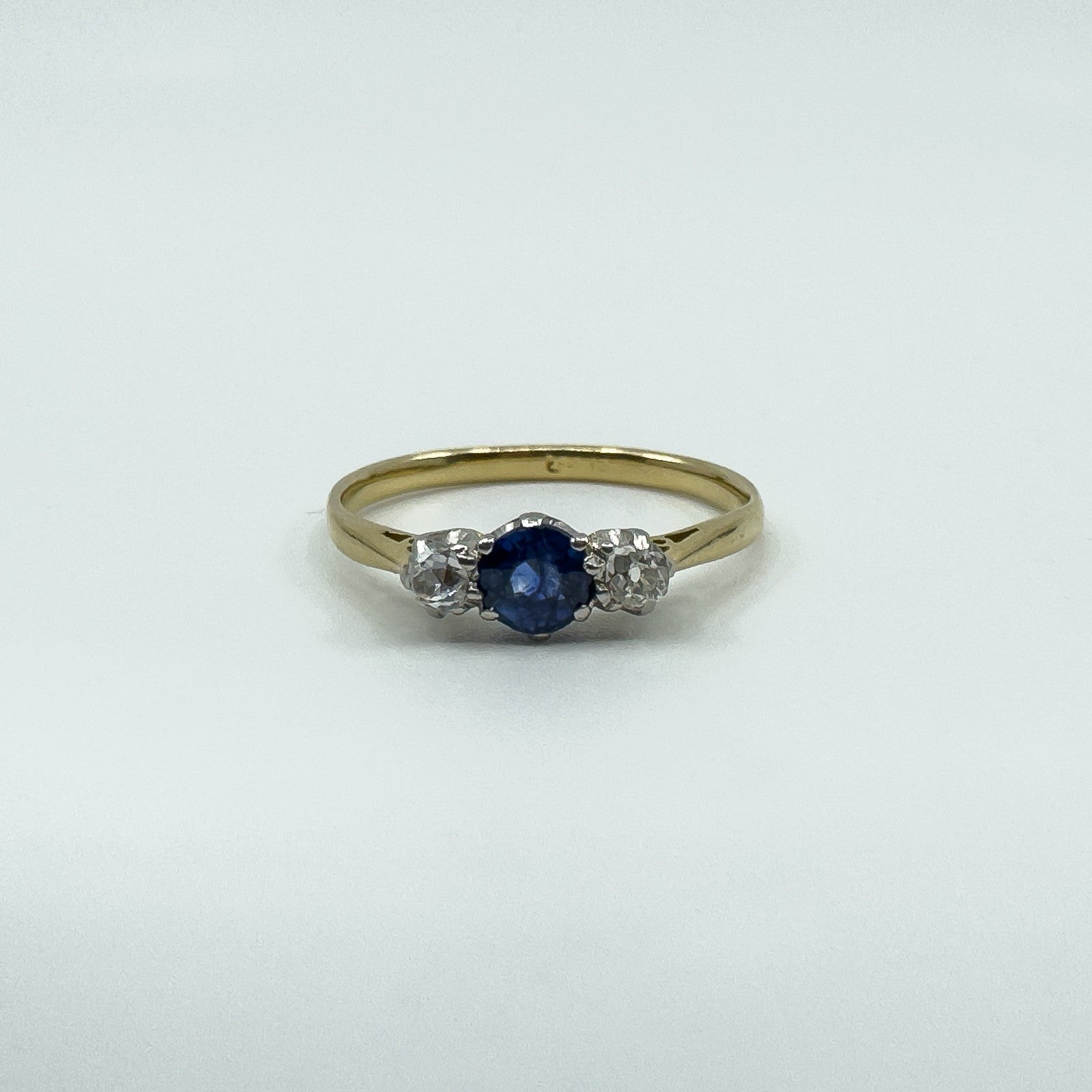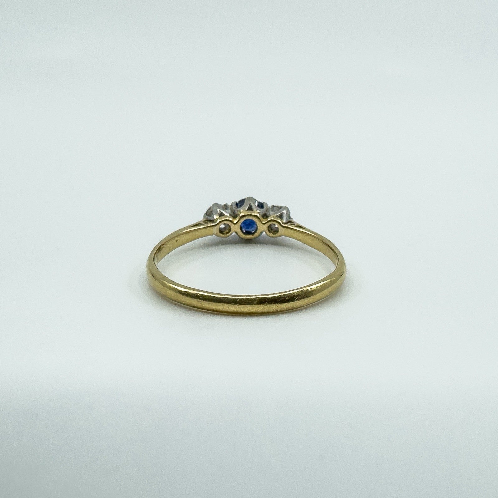 • Item: Antique sapphire and old cut diamond trilogy ring • Metal: 18ct gold (tested; partial worn “18ct” stamp) • Gemstones: 1 sapphire (round cut, estimated 0.30ct) • Diamonds: 2 old cut diamonds (tested, estimated 0.07ct each) • Total gem weight: Approx. 0.43ct (estimated total) • Ring size: Size P • Head size: Approx. 10.7mm x 5mm • Band width: Approx. 1.9mm (underside) • Depth: Approx. 4.3mm • Weight: Approx. 2.4g