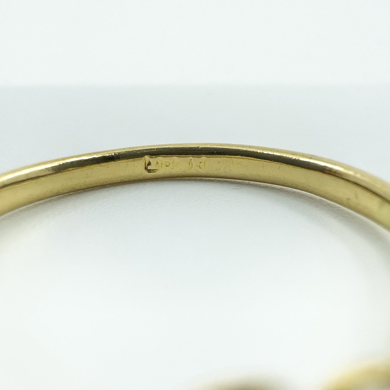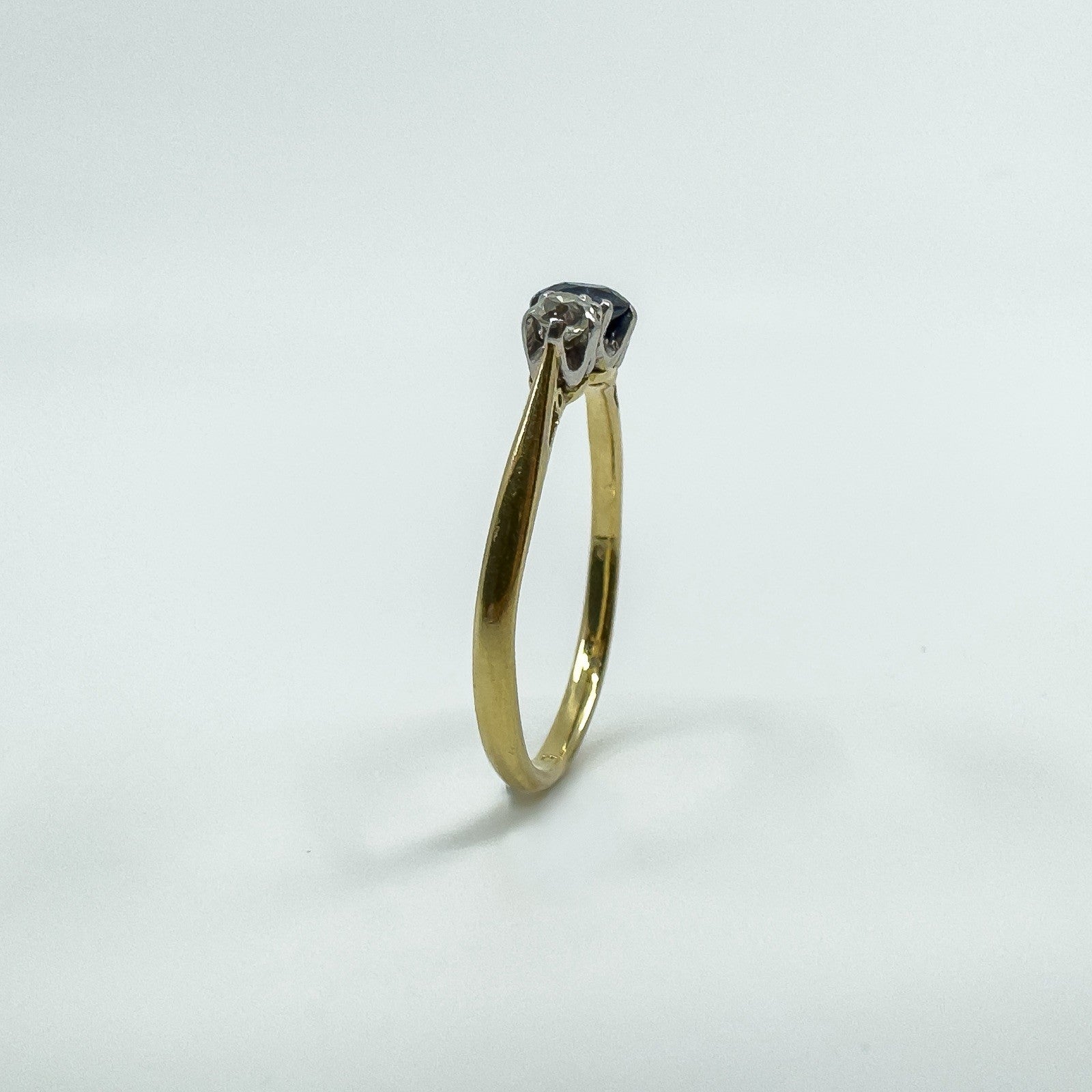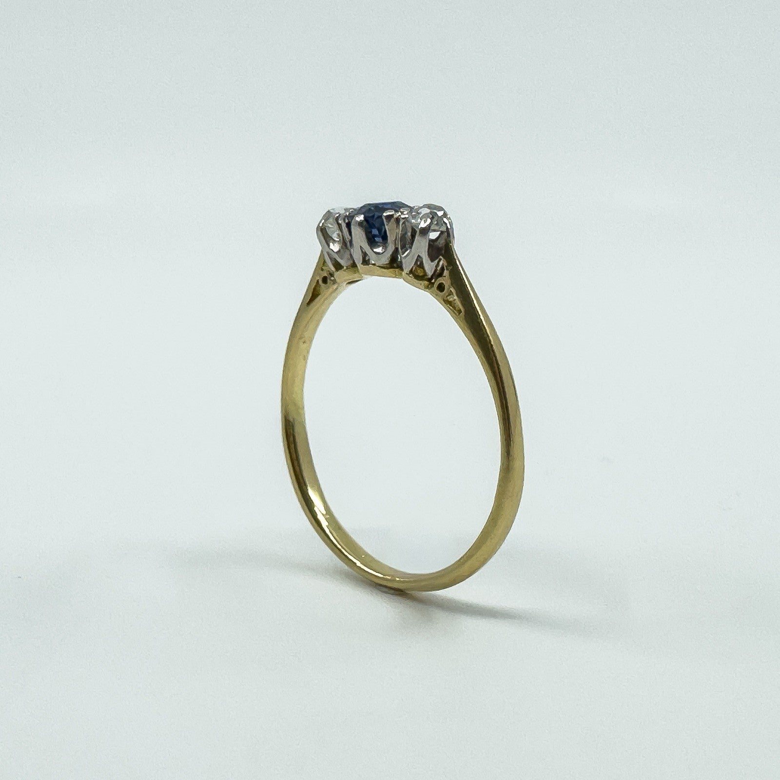 • Item: Antique sapphire and old cut diamond trilogy ring • Metal: 18ct gold (tested; partial worn “18ct” stamp) • Gemstones: 1 sapphire (round cut, estimated 0.30ct) • Diamonds: 2 old cut diamonds (tested, estimated 0.07ct each) • Total gem weight: Approx. 0.43ct (estimated total) • Ring size: Size P • Head size: Approx. 10.7mm x 5mm • Band width: Approx. 1.9mm (underside) • Depth: Approx. 4.3mm • Weight: Approx. 2.4g
