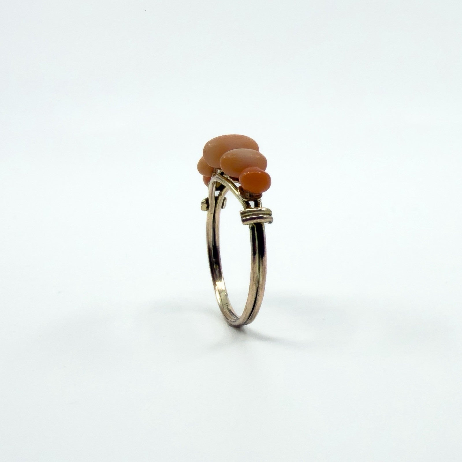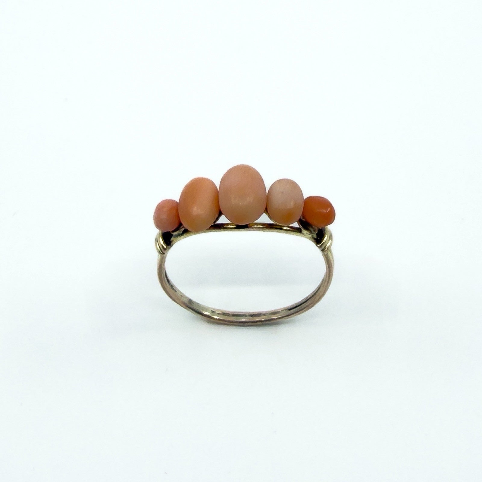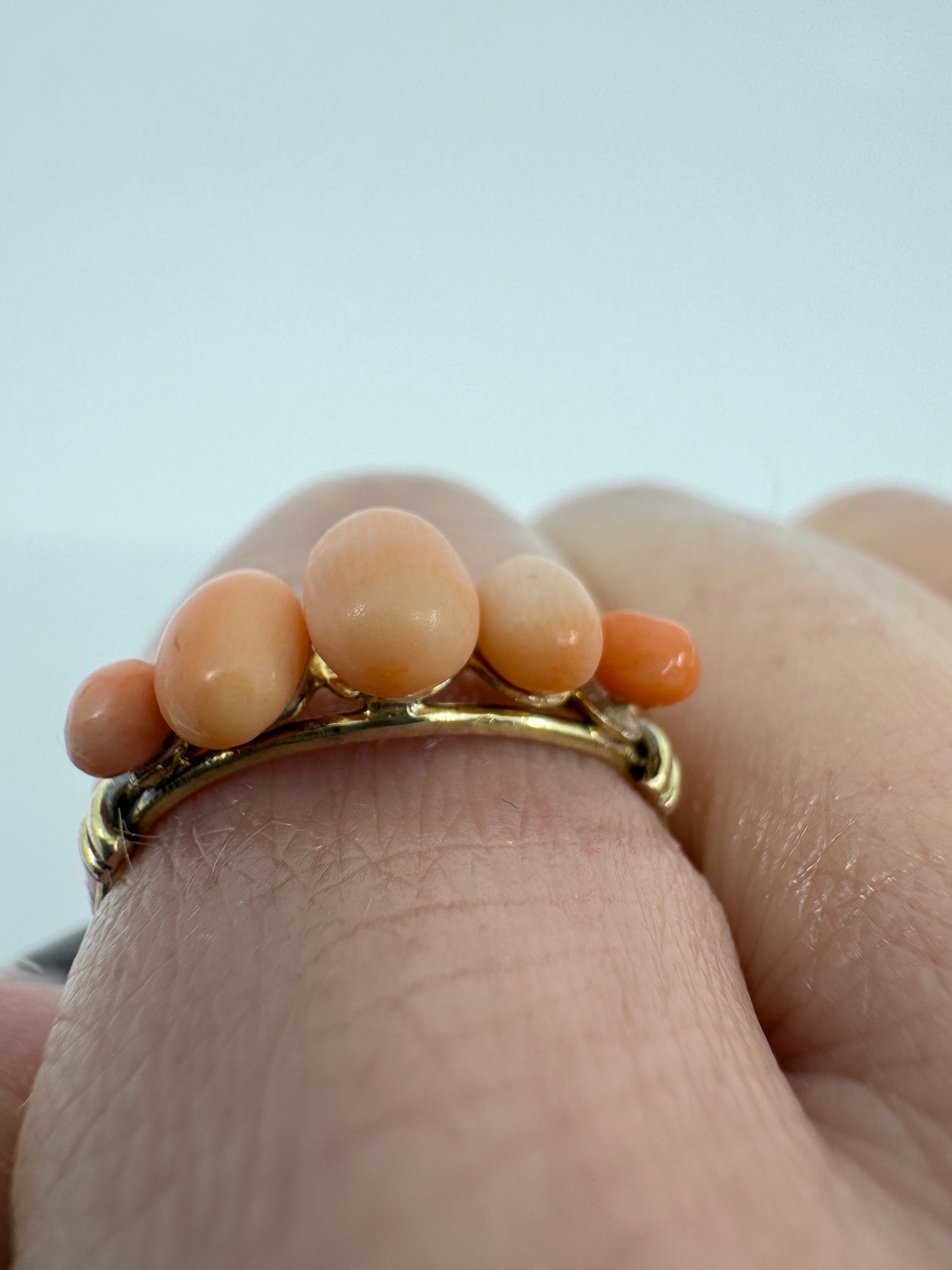 Antique 9ct gold five stone coral ring set with five oval cut pieces of natural coral. Not stamped, but tested as 9ct gold.