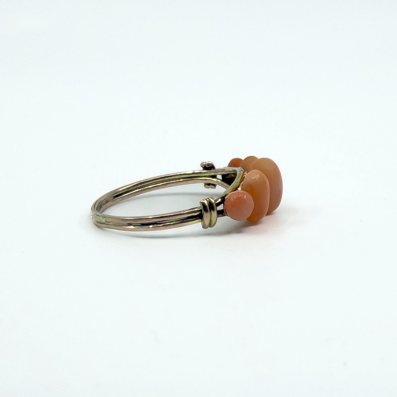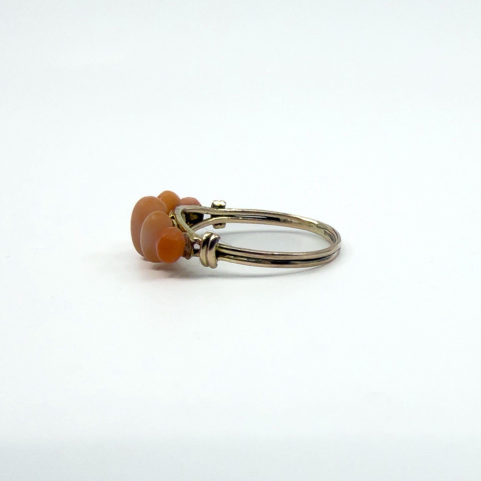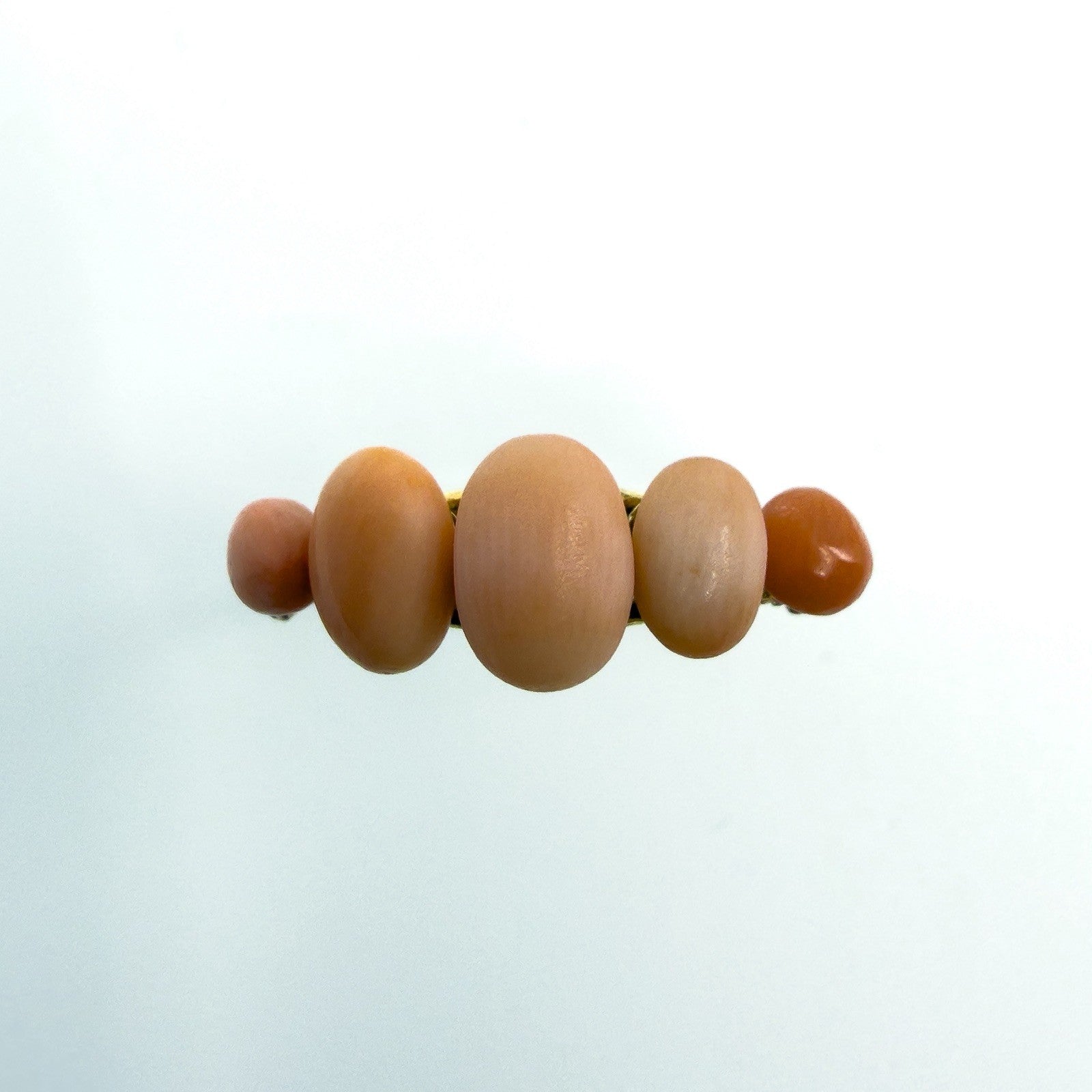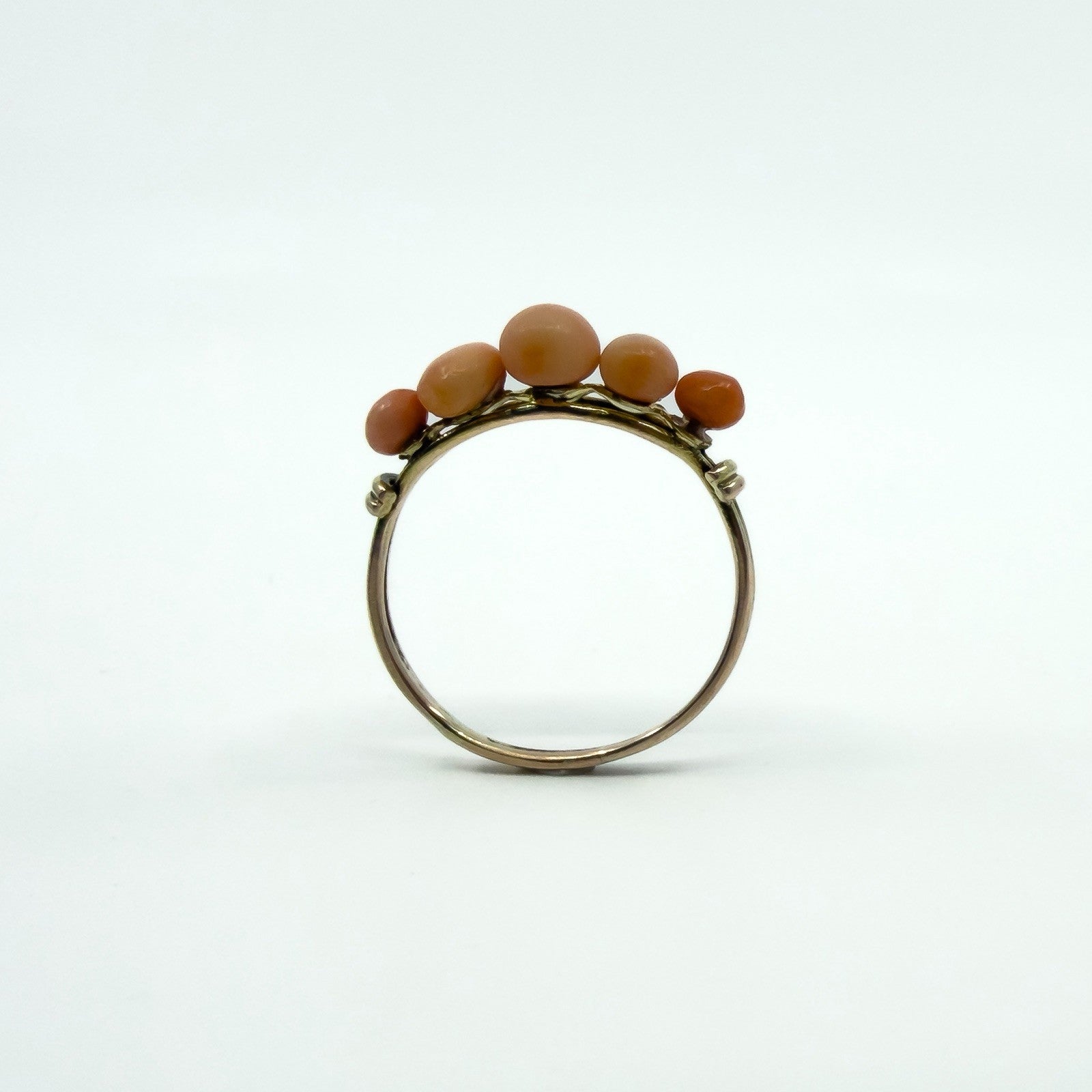 Antique 9ct gold five stone coral ring set with five oval cut pieces of natural coral. Not stamped, but tested as 9ct gold.