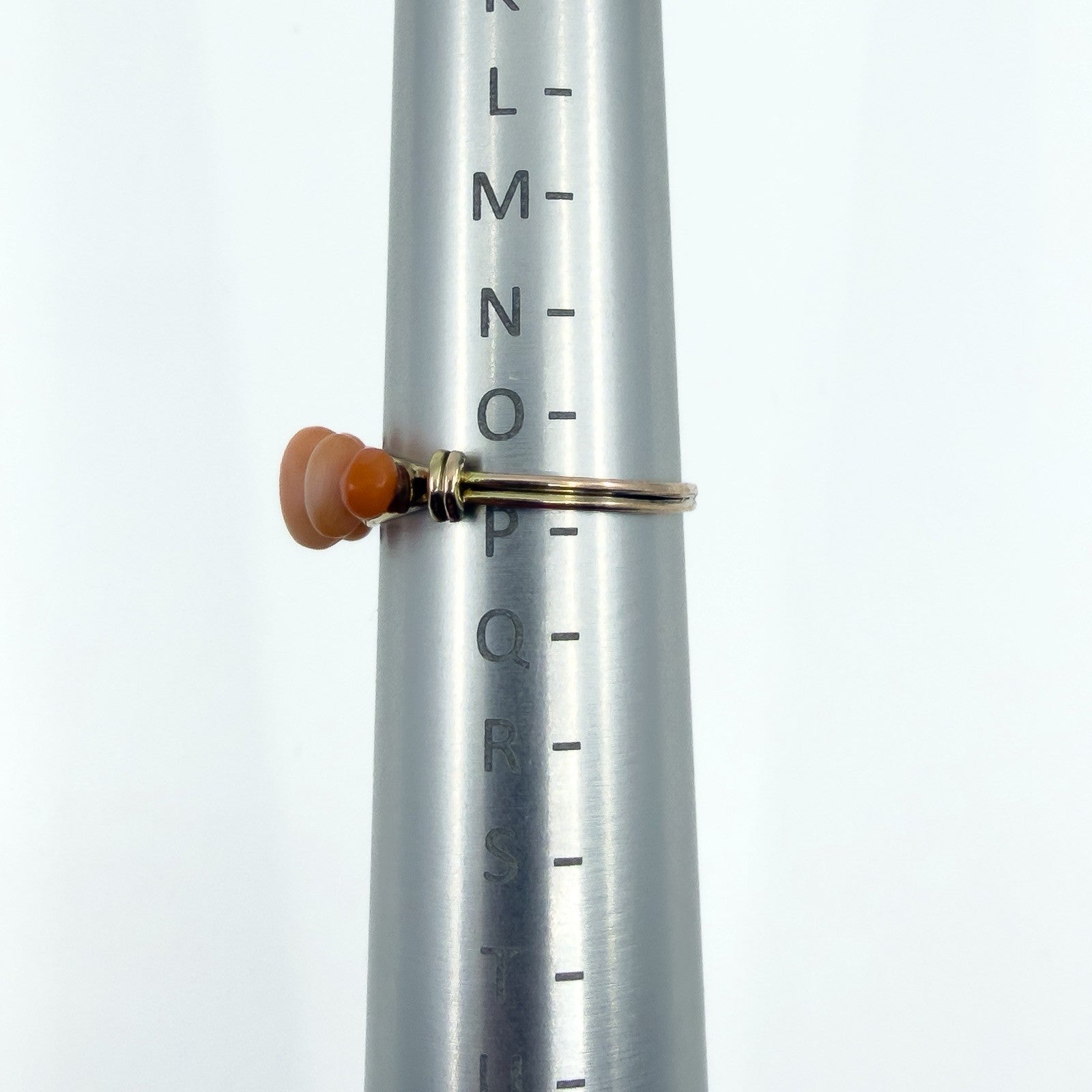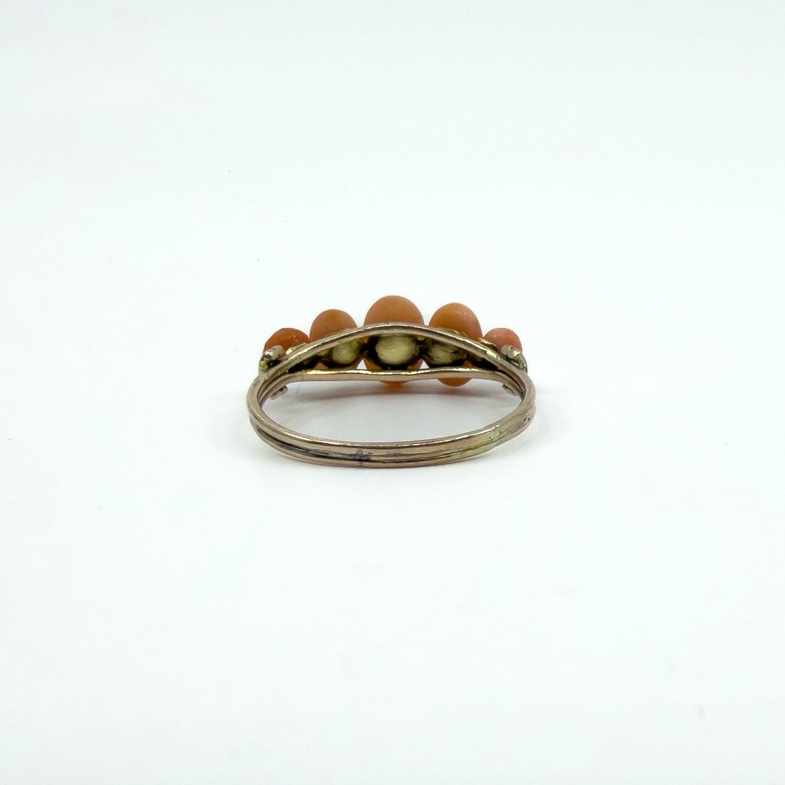 • Item: Antique five stone coral ring • Metal: 9ct gold (tested) • Gemstone: Natural coral (5 oval cut stones) • Ring size: Size O - P • Head size: Approx. 19.6mm x 7.1mm • Band width: Approx. 1.5mm (underside) • Depth: Approx. 6mm • Weight: Approx. 1.8g • Hallmarks: Not stamped; tested as 9ct gold
