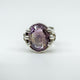 A large sterling silver ring set with an oval cut purple chalcedony weighing approximately 10.00ct, flanked by six round cut natural diamonds (tested). The striking size and rich colour of the chalcedony make this a bold and eye-catching piece.