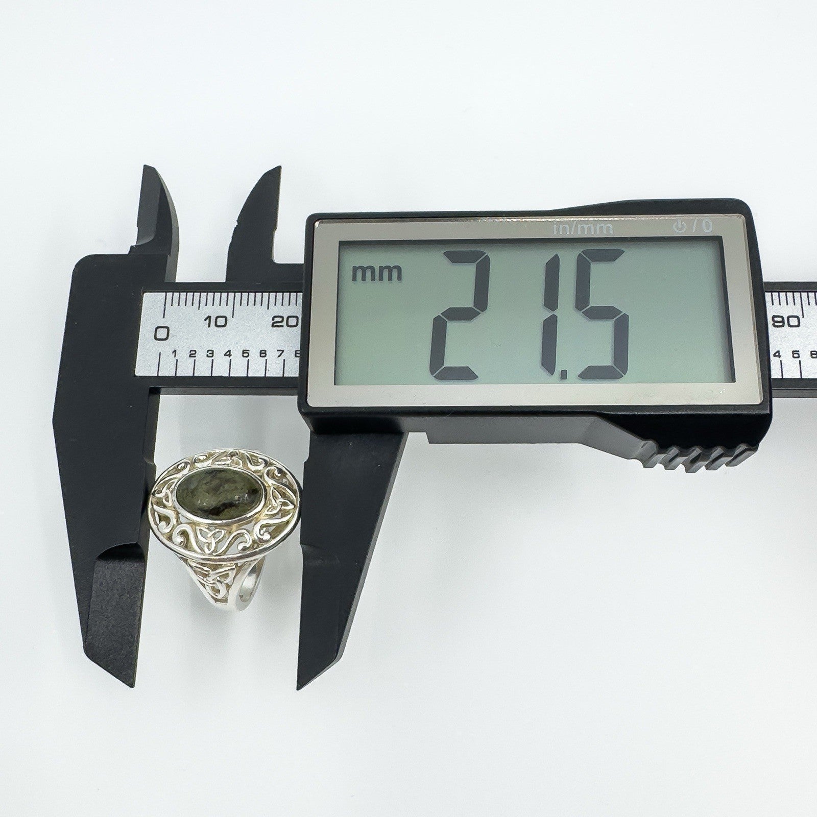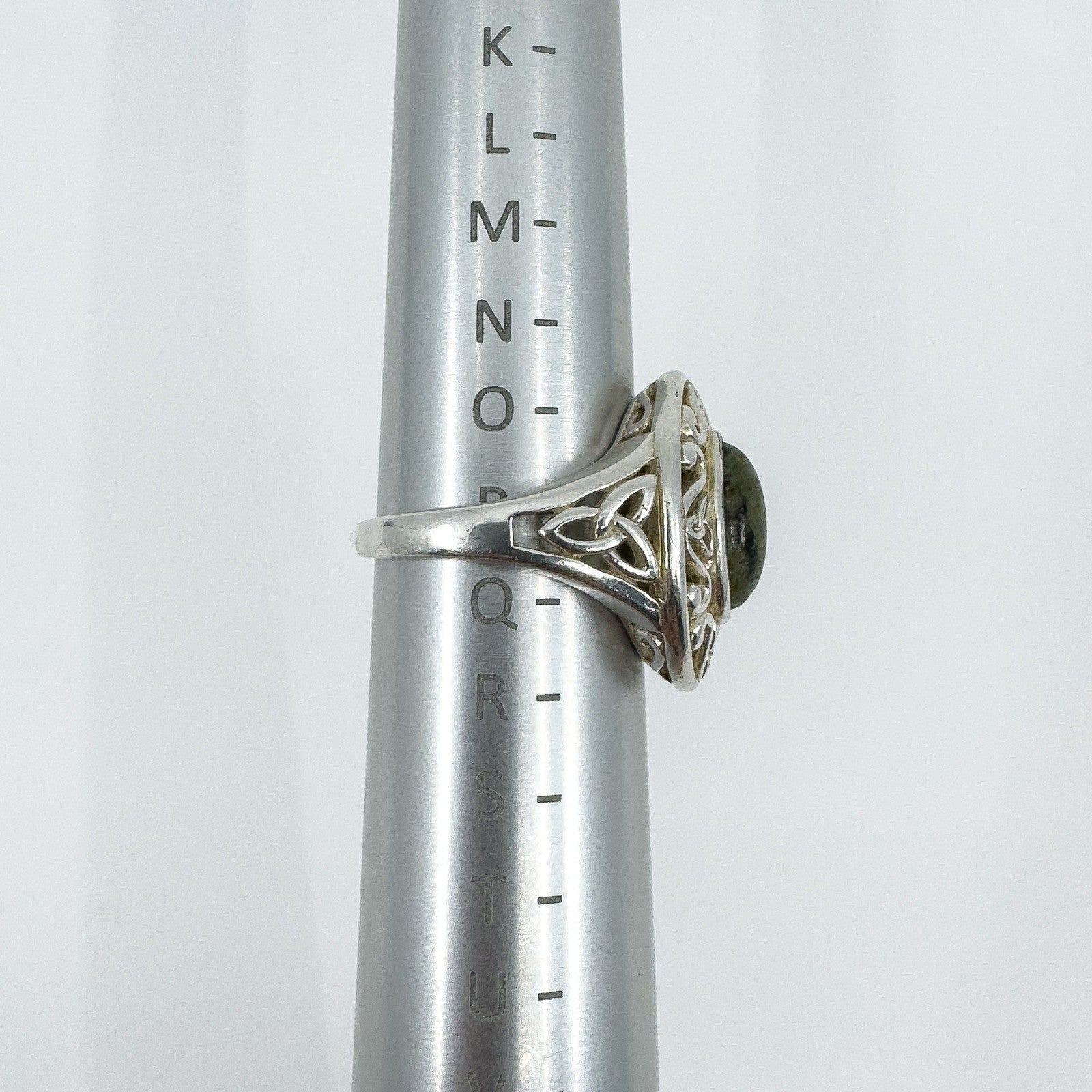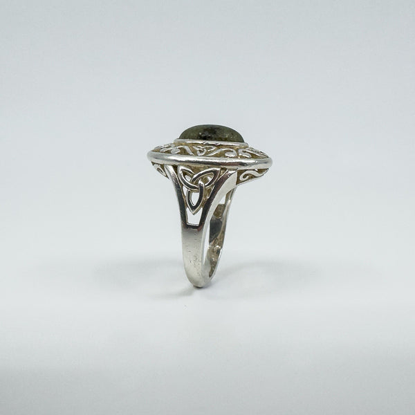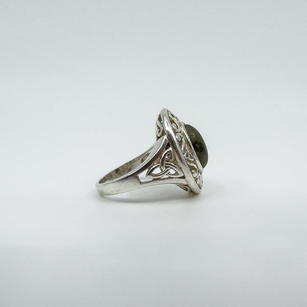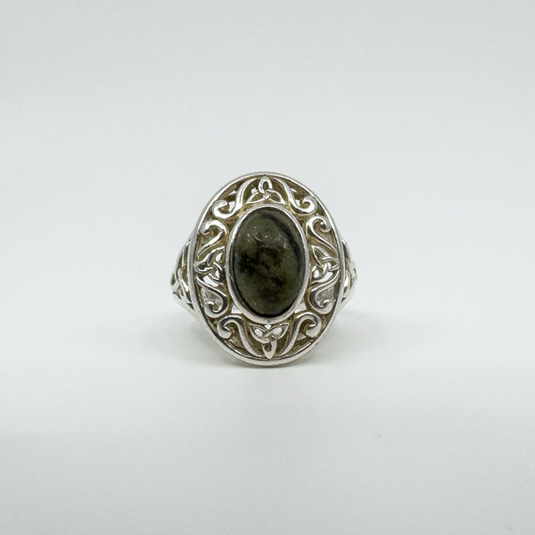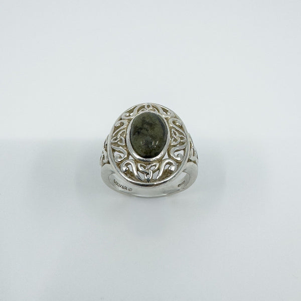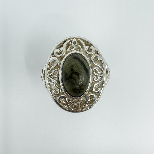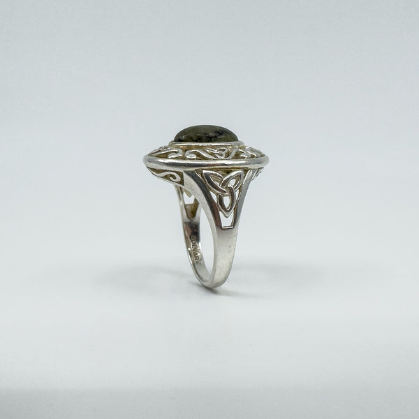 A chunky sterling silver Irish Celtic ring set with natural green Connemara marble, the only marble of its kind found exclusively in Ireland. The oval stone is surrounded by a detailed Celtic knot-work design that includes the Trinity motif, symbolising unity and eternity.