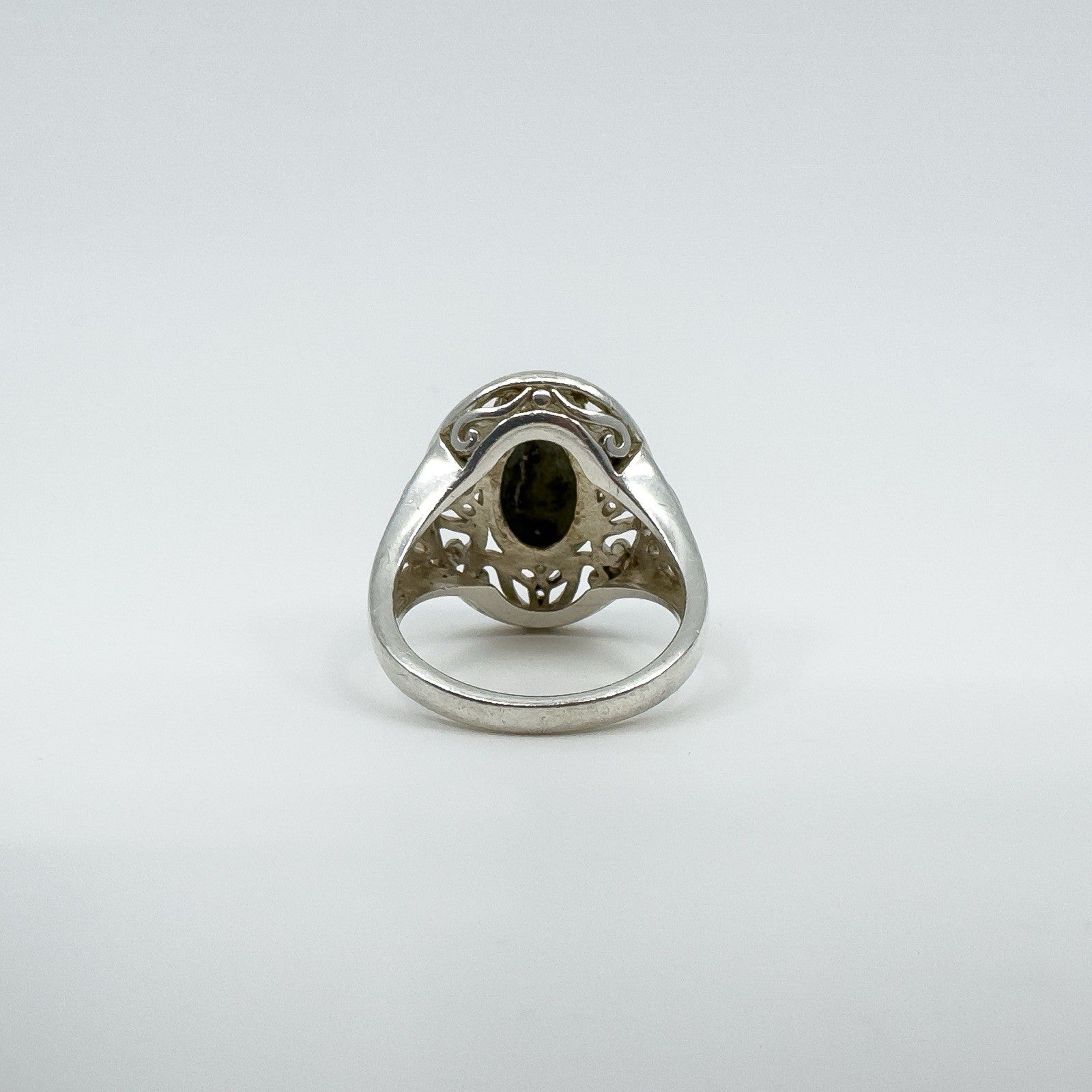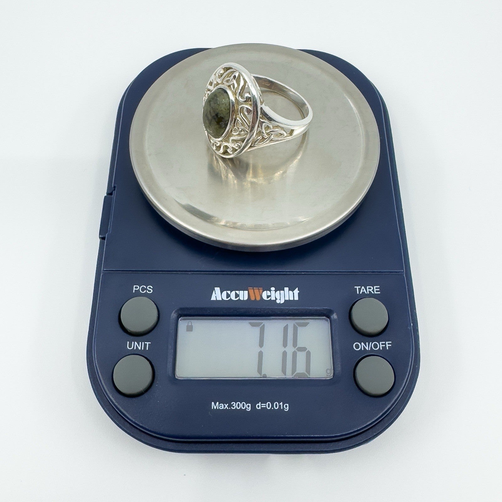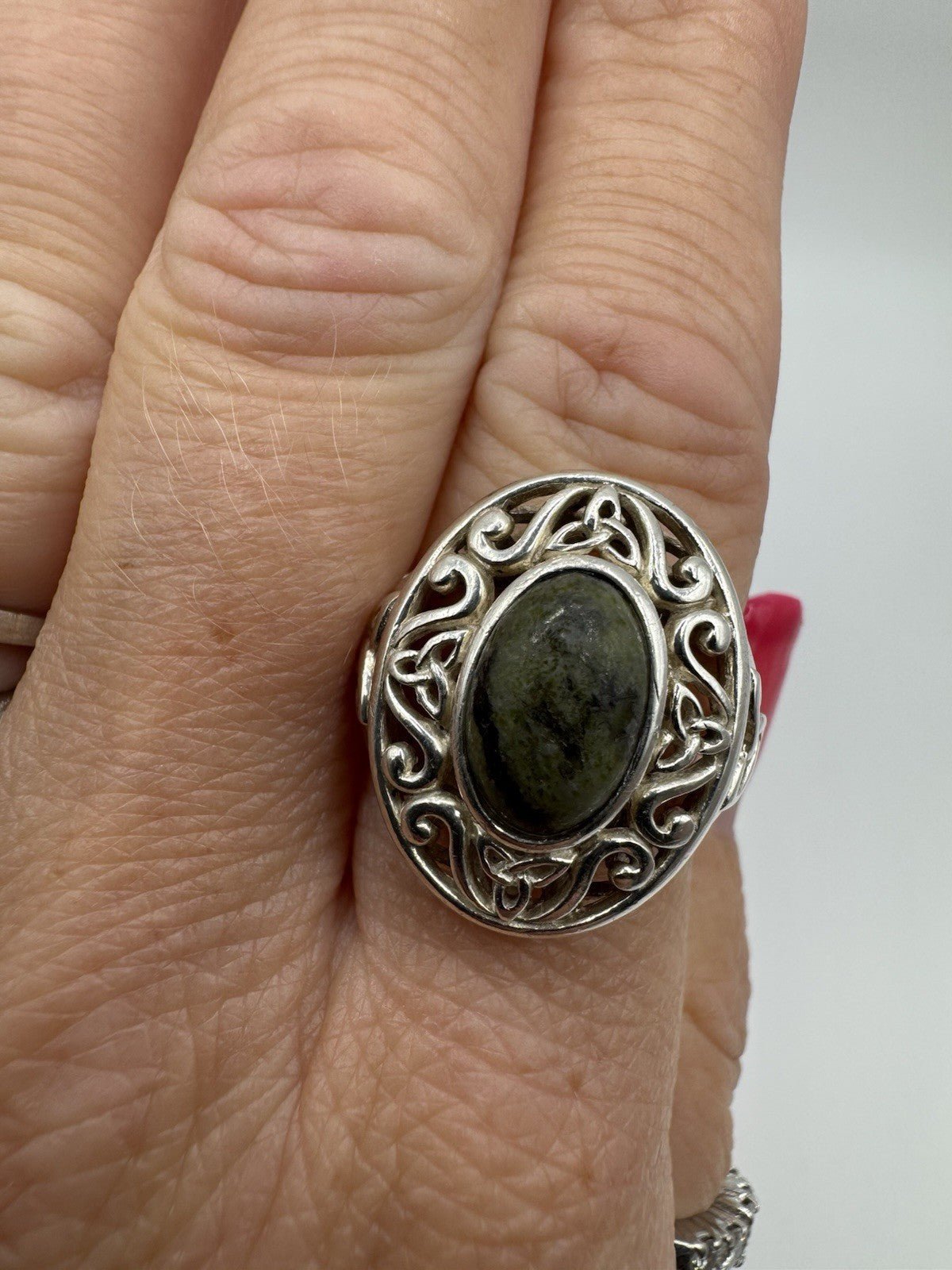A chunky sterling silver Irish Celtic ring set with natural green Connemara marble, the only marble of its kind found exclusively in Ireland. The oval stone is surrounded by a detailed Celtic knot-work design that includes the Trinity motif, symbolising unity and eternity.