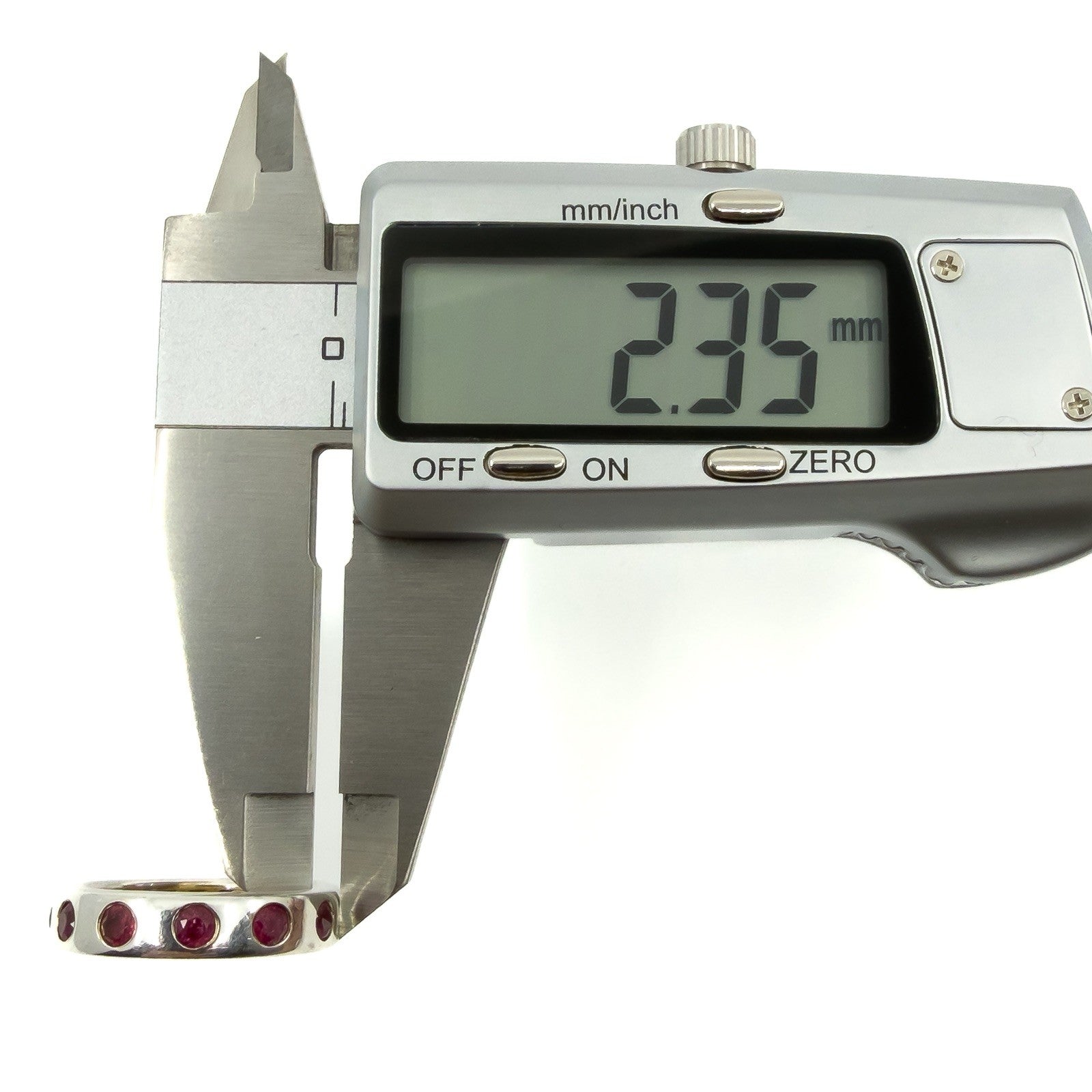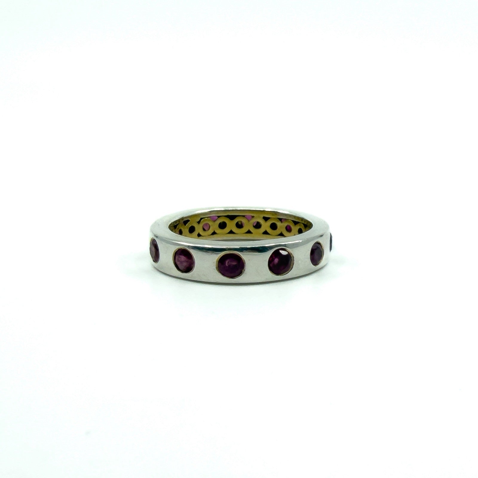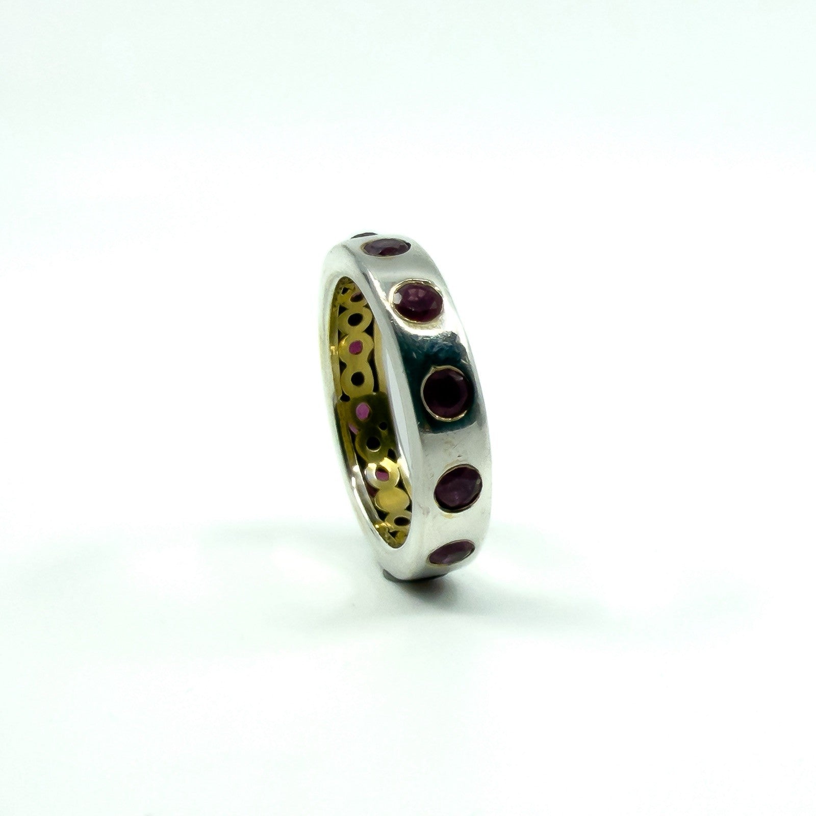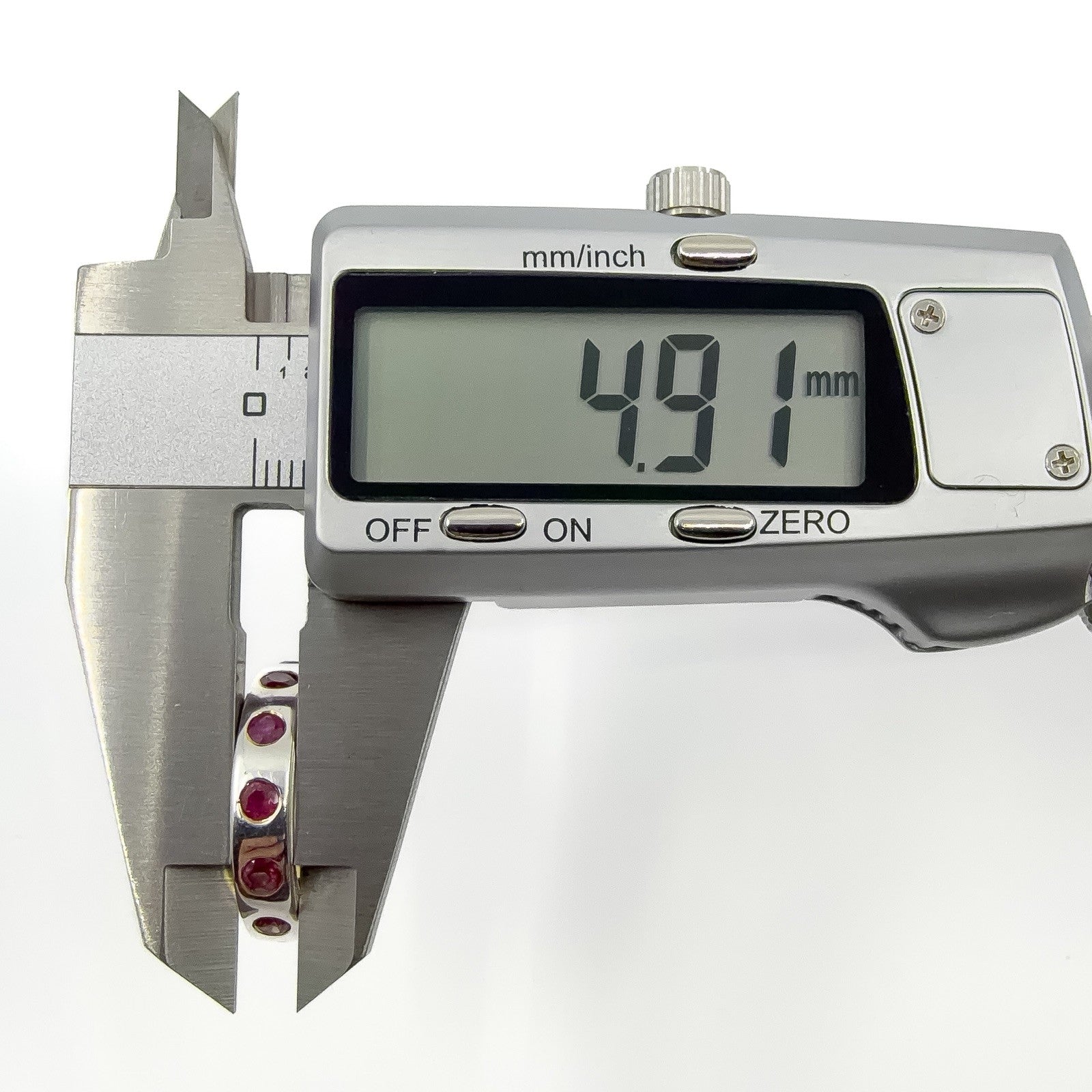 A chunky sterling silver full eternity band set with round cut rubies all the way around the ring.