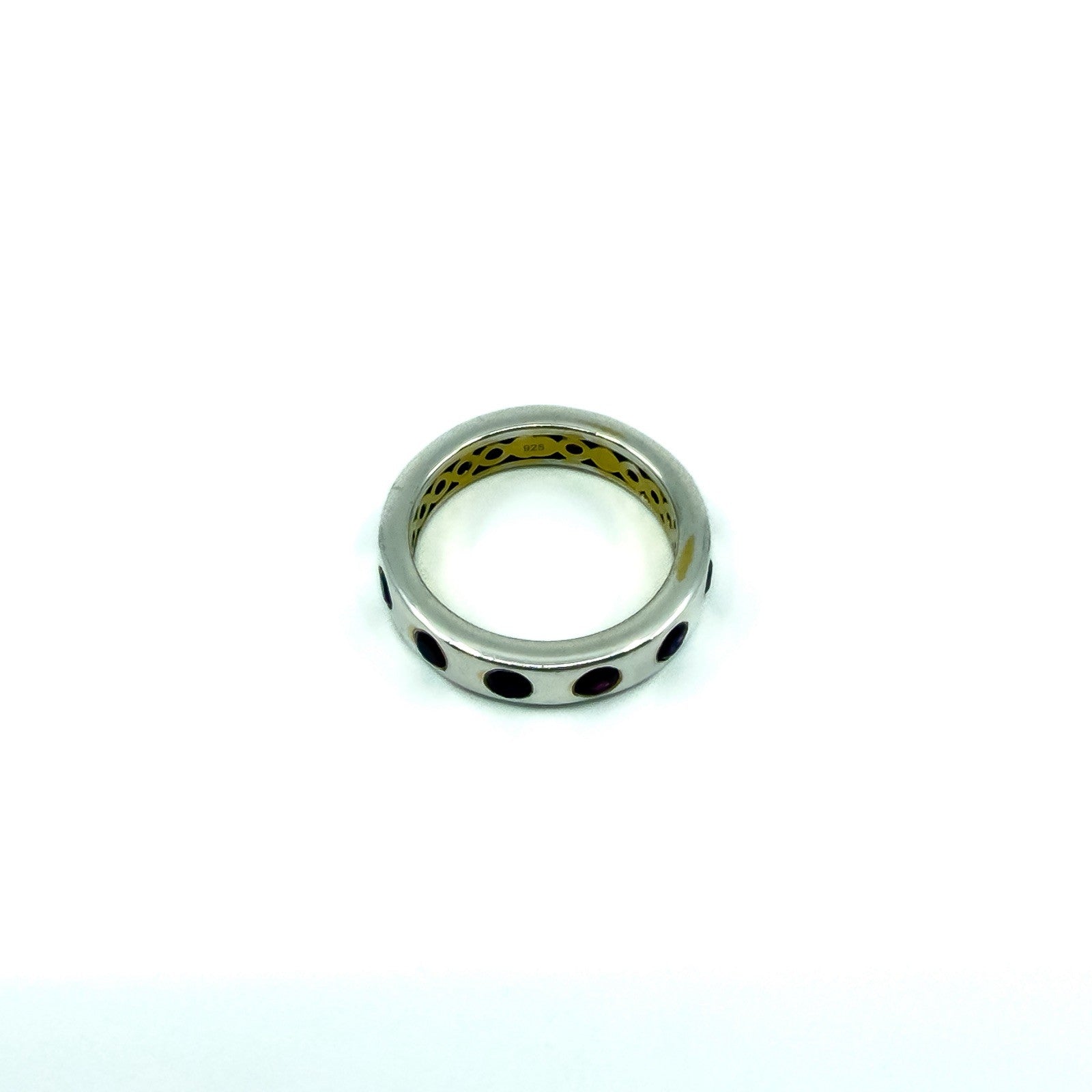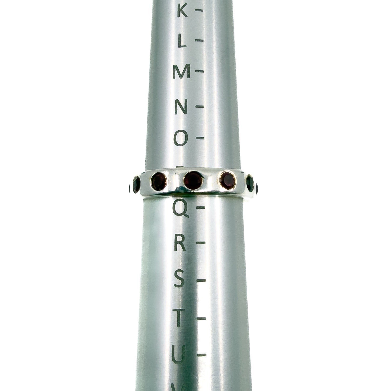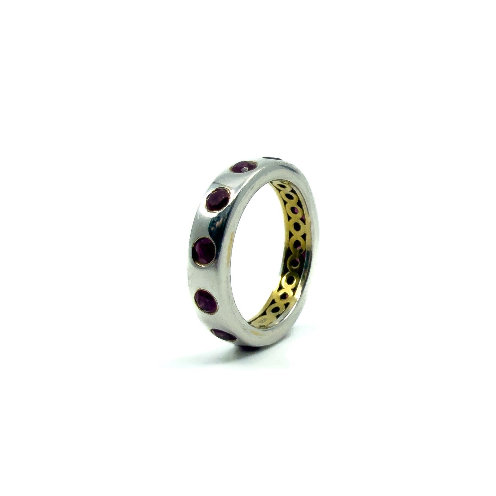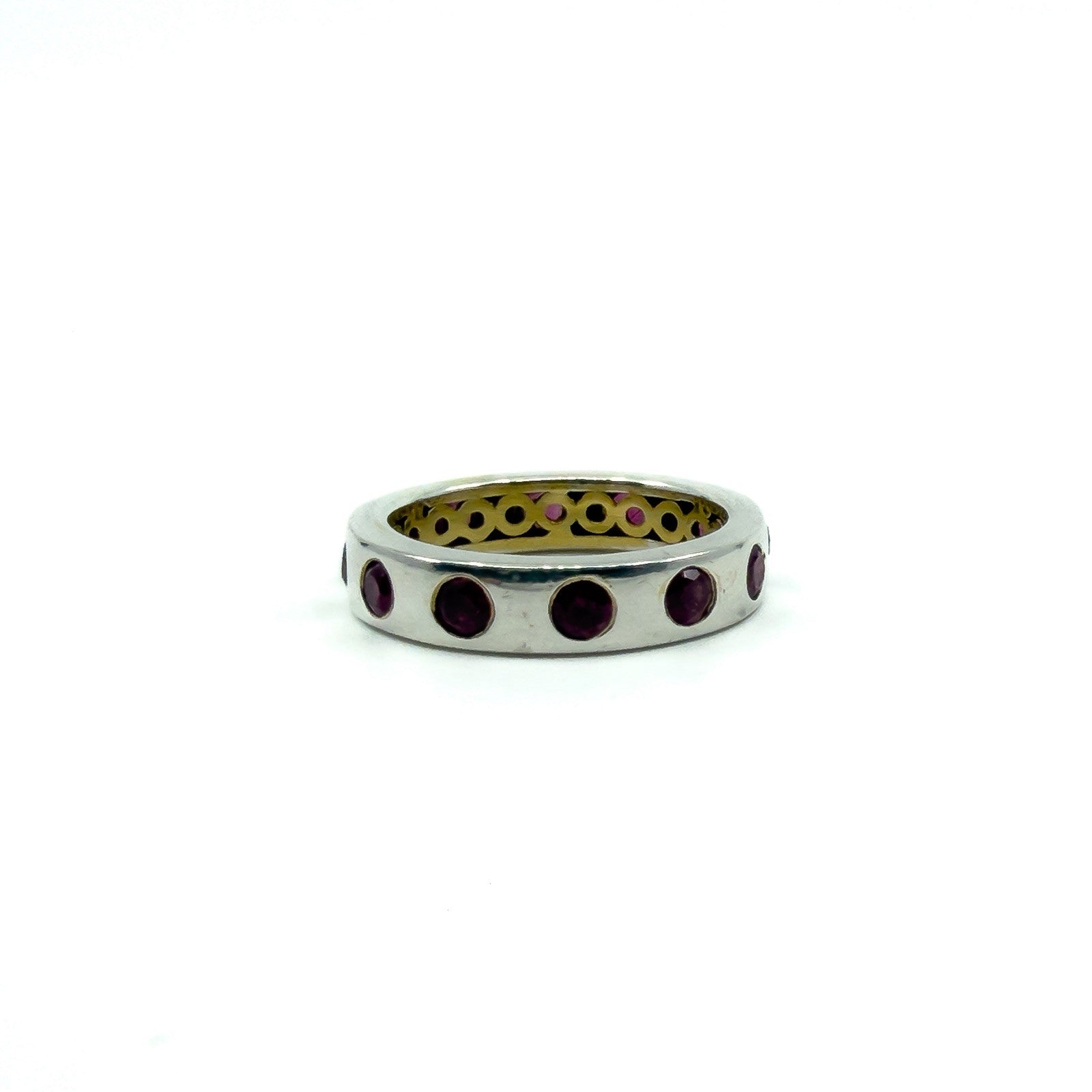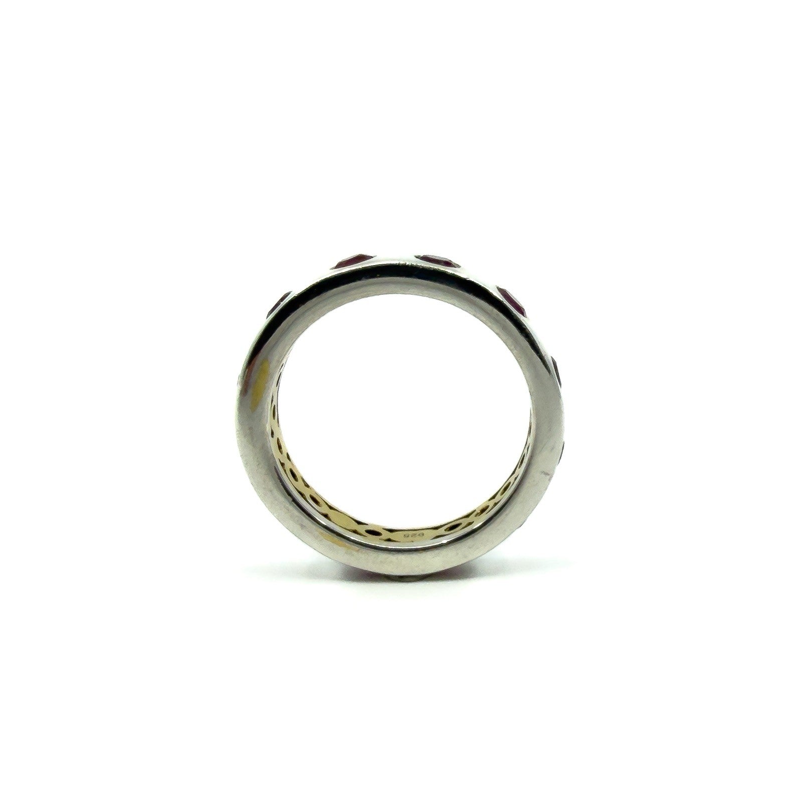 A chunky sterling silver full eternity band set with round cut rubies all the way around the ring.