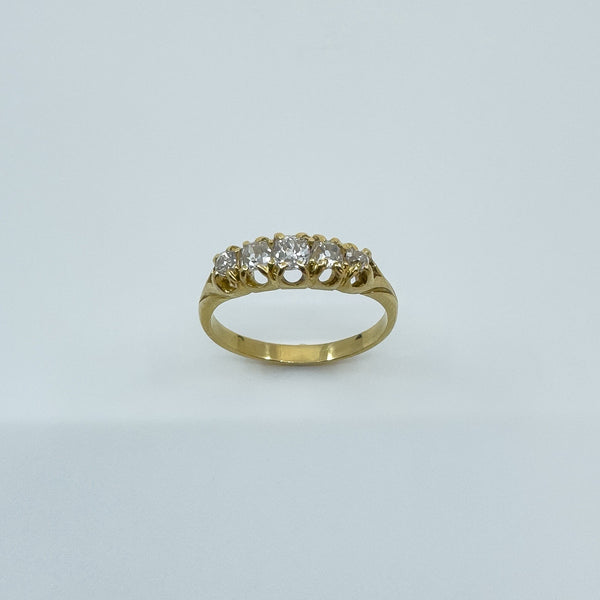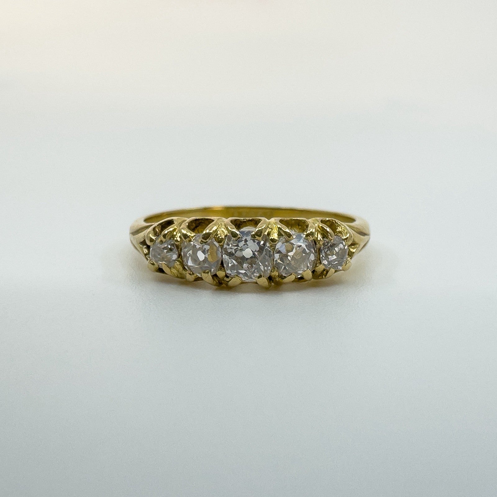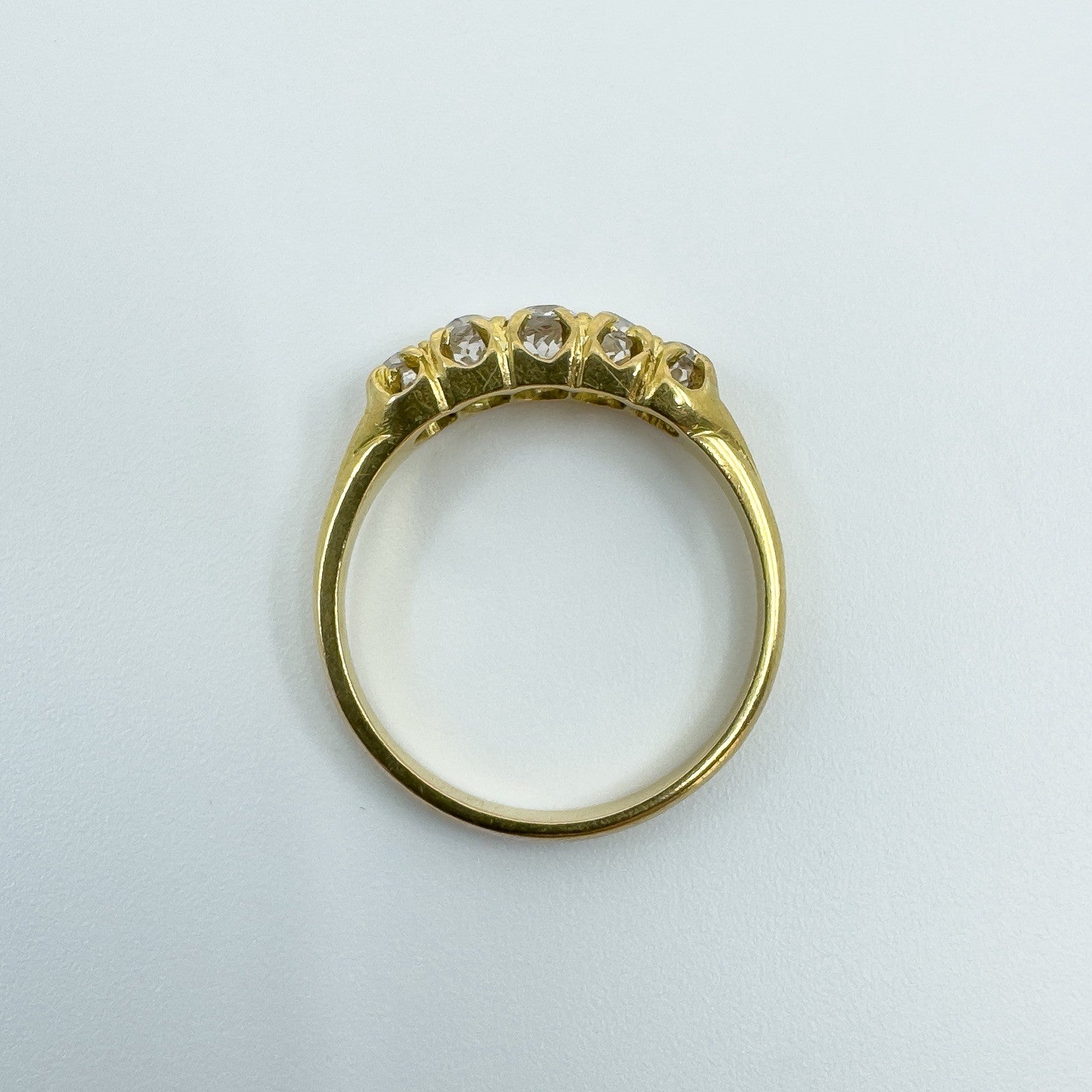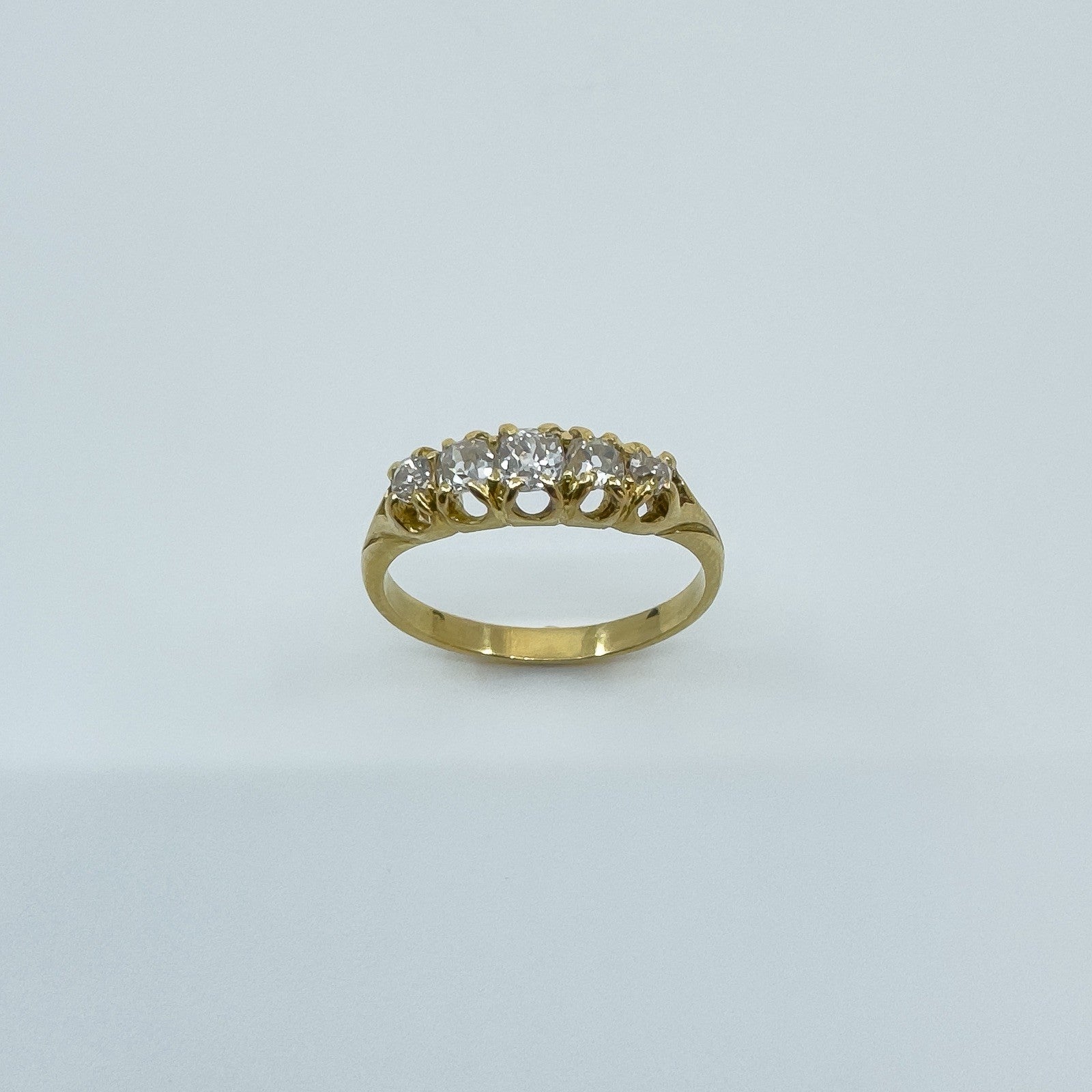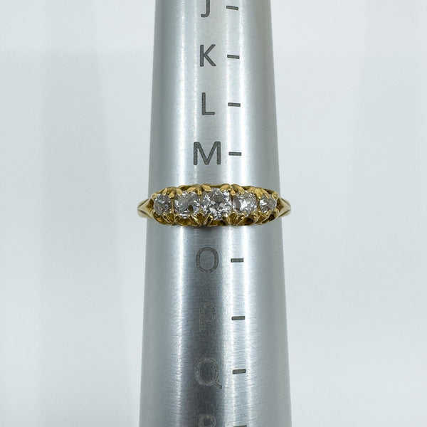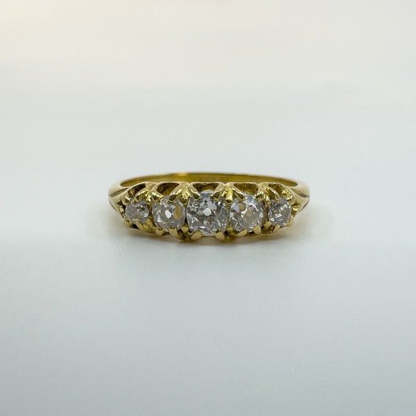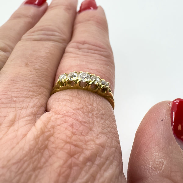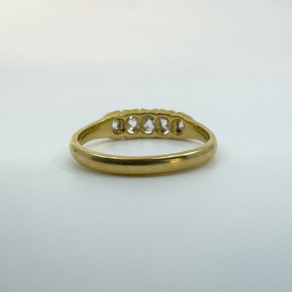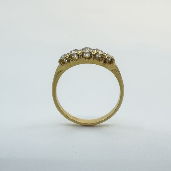 The five natural old cut diamonds (tested) are estimated to total around 0.50ct and are set in claw settings across the head of the ring. Not stamped but tested as 18ct gold. Ring size N with a comfortable band and a low, smooth feel on the hand.