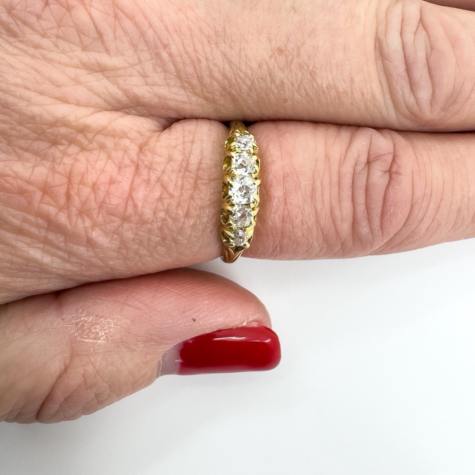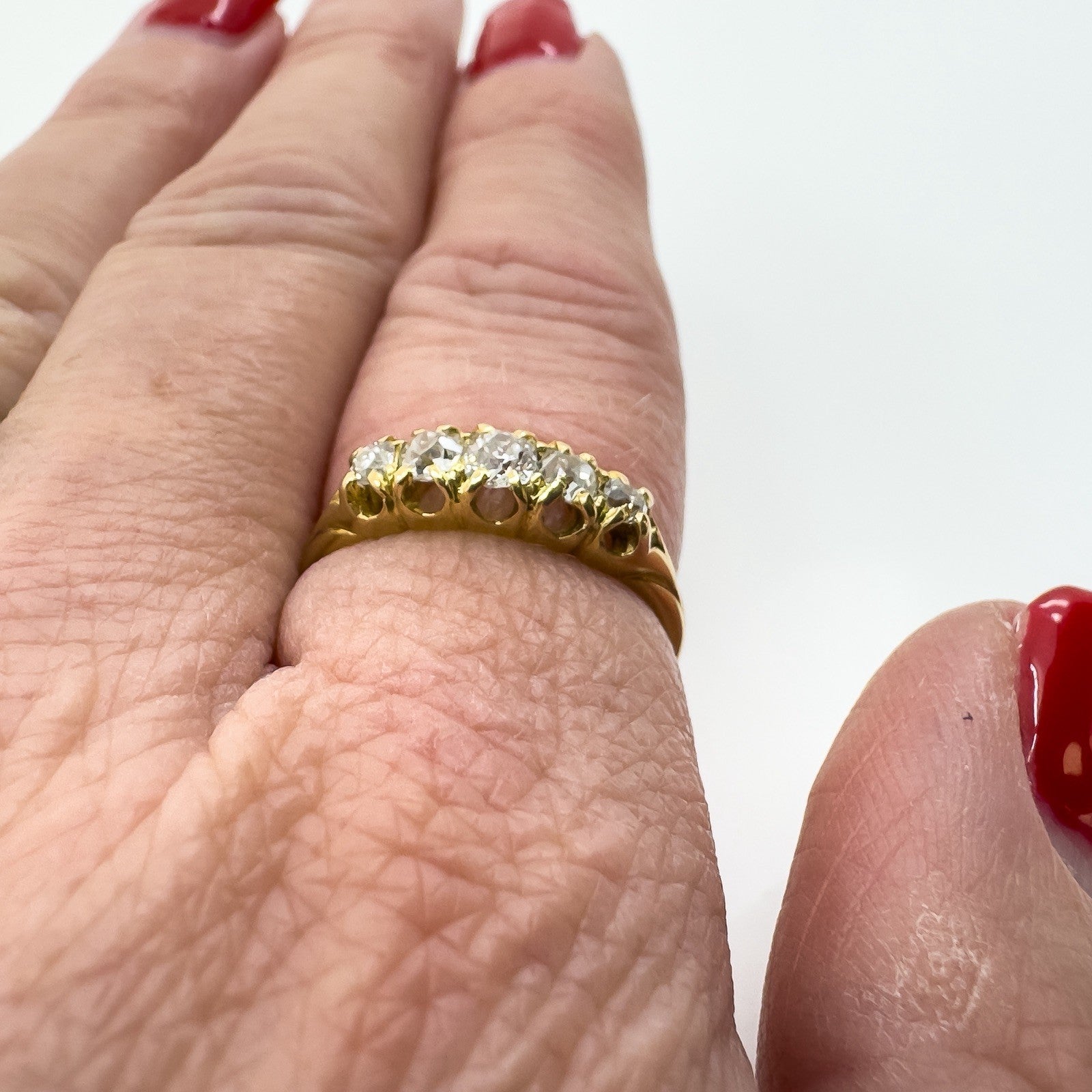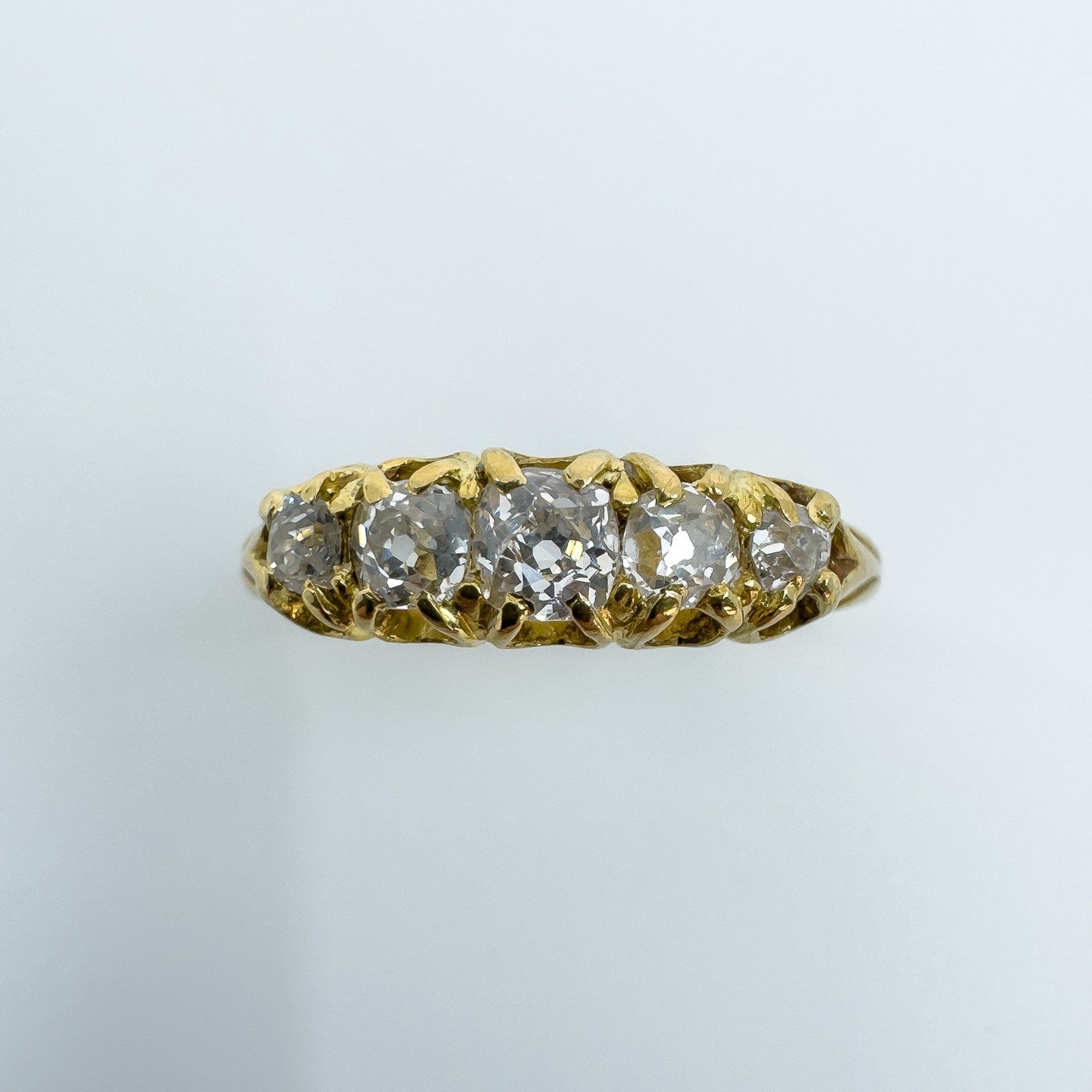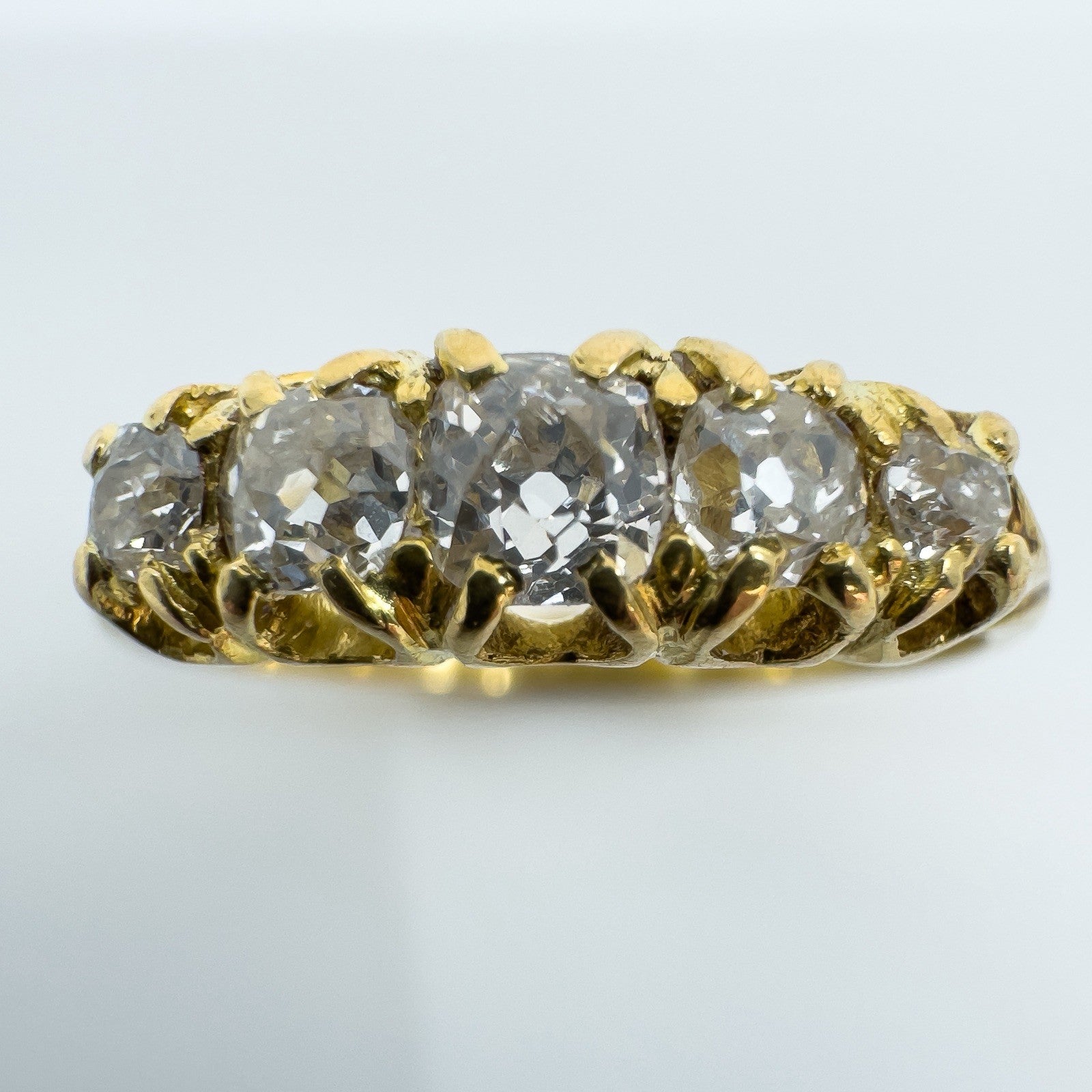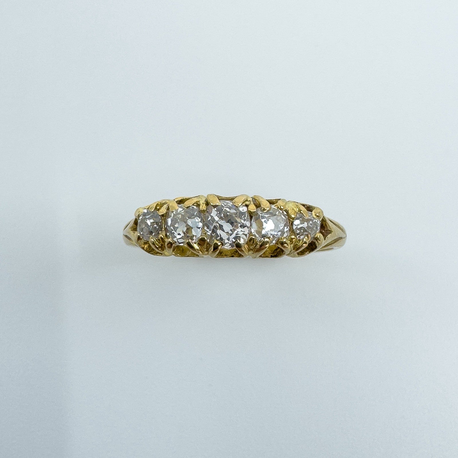 The five natural old cut diamonds (tested) are estimated to total around 0.50ct and are set in claw settings across the head of the ring. Not stamped but tested as 18ct gold. Ring size N with a comfortable band and a low, smooth feel on the hand.