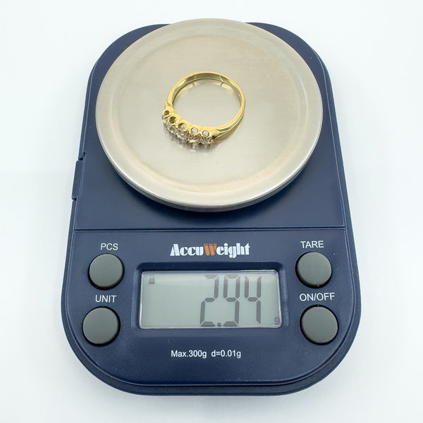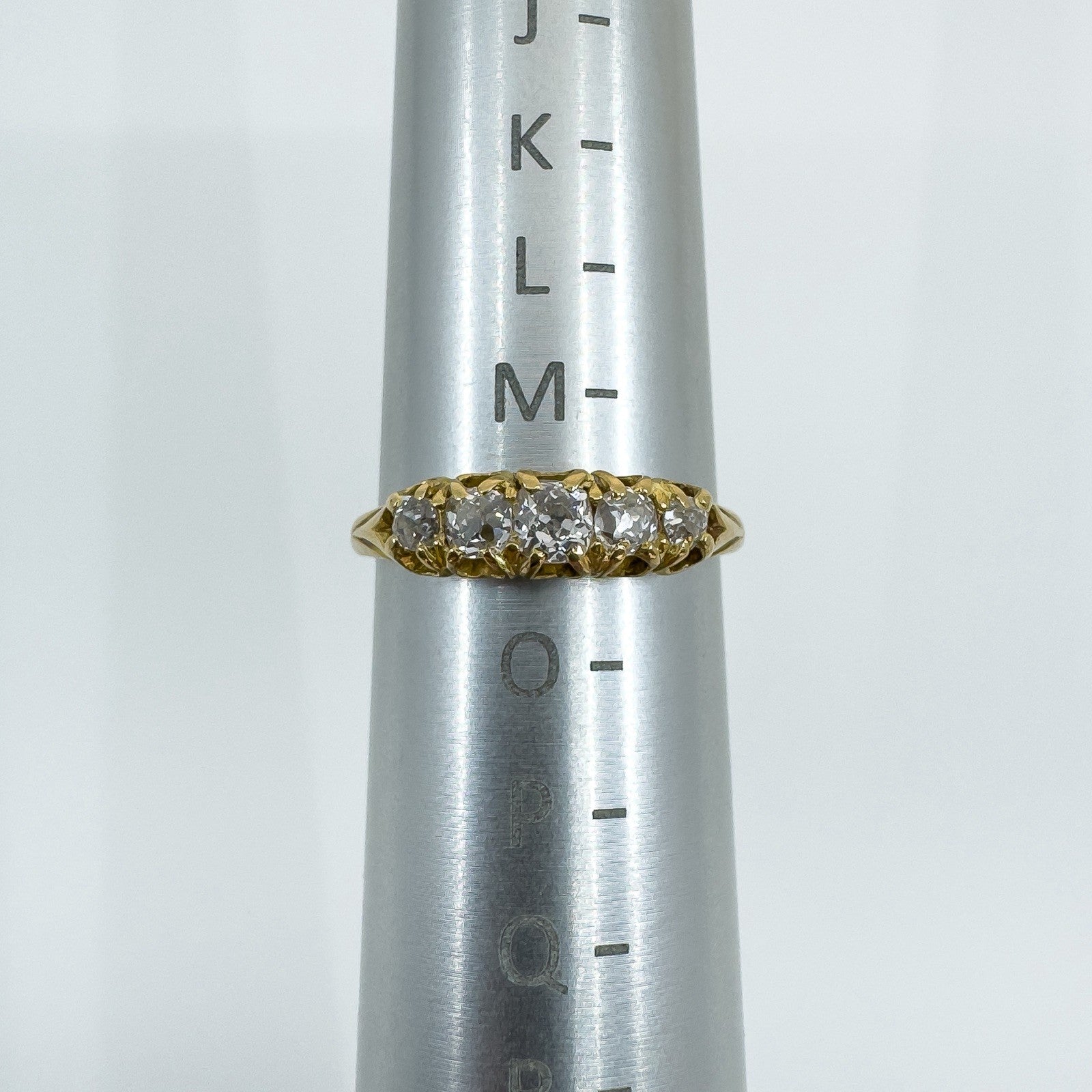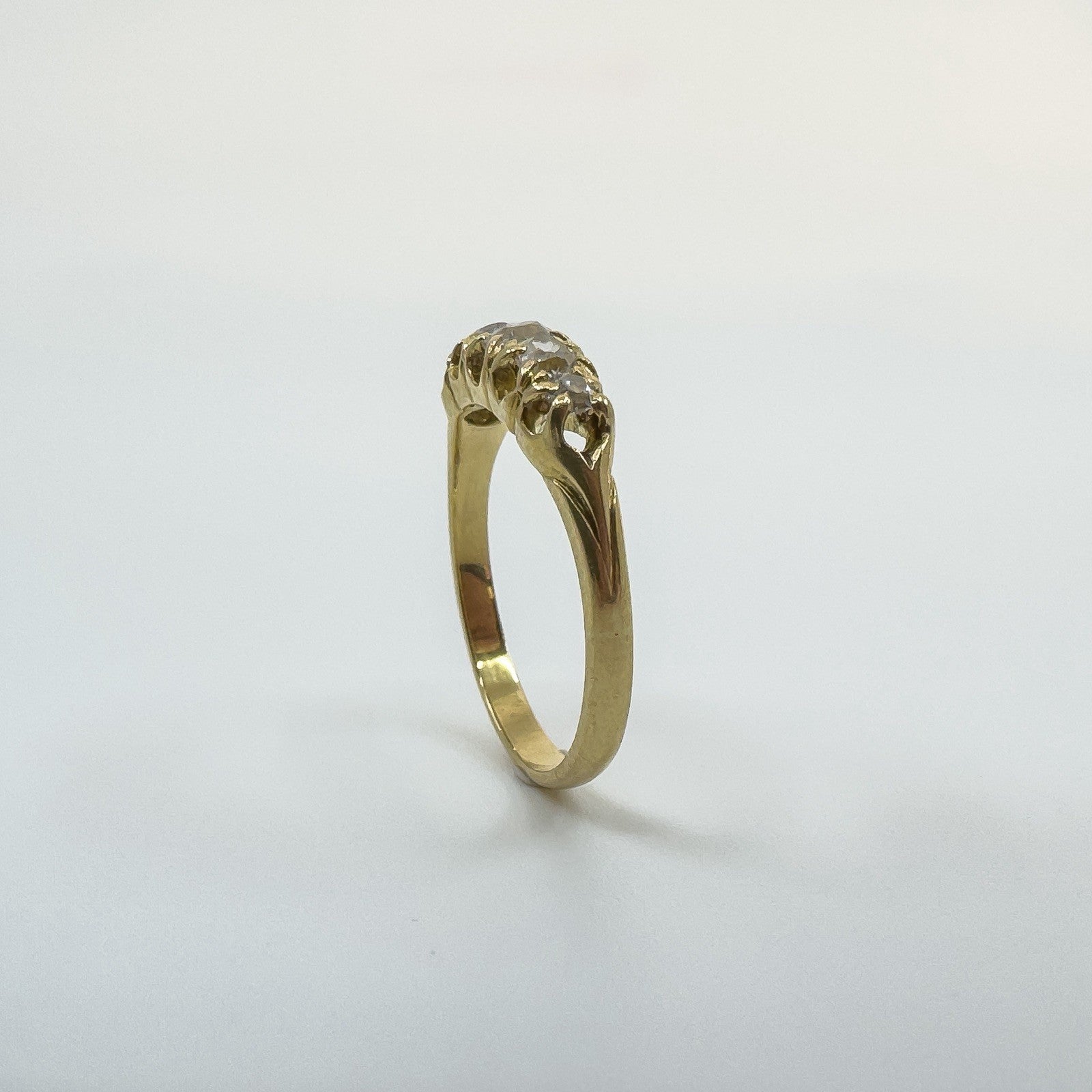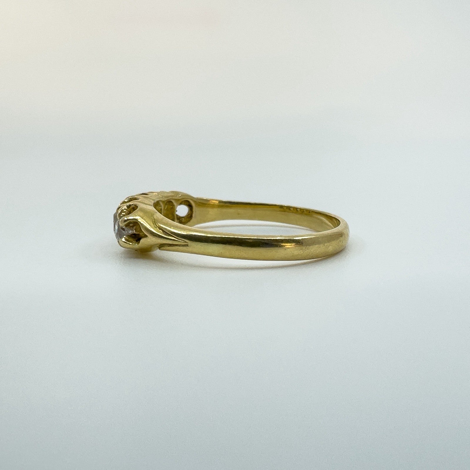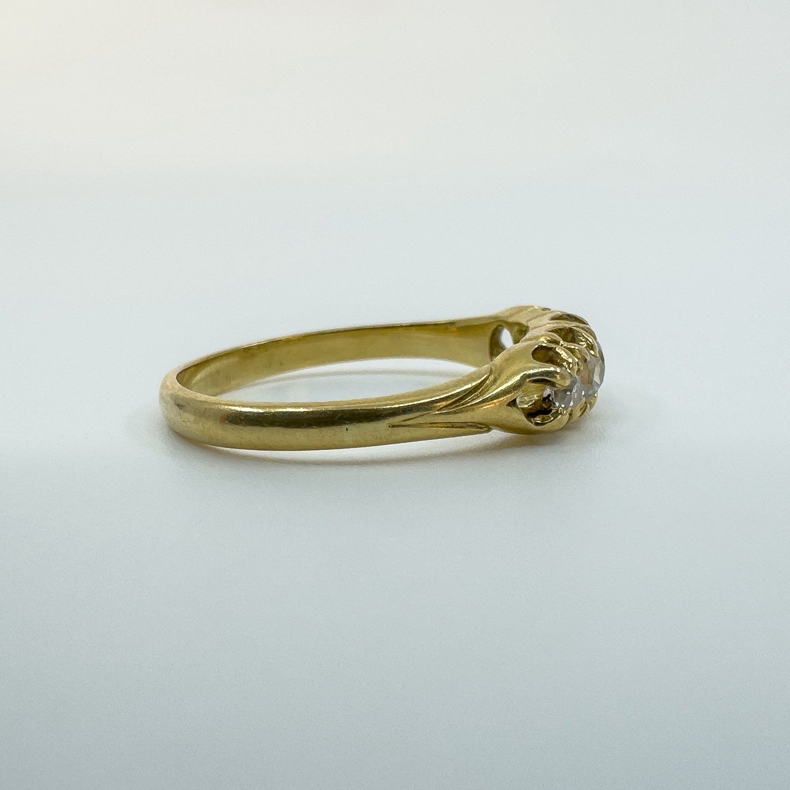 The five natural old cut diamonds (tested) are estimated to total around 0.50ct and are set in claw settings across the head of the ring. Not stamped but tested as 18ct gold. Ring size N with a comfortable band and a low, smooth feel on the hand.