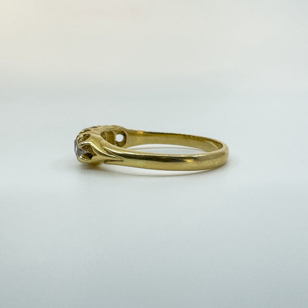 Victorian antique 18ct gold diamond boat ring set with five old cut diamonds in a classic tapered setting. A lovely period piece with gentle sparkle and an easy, wearable profile.