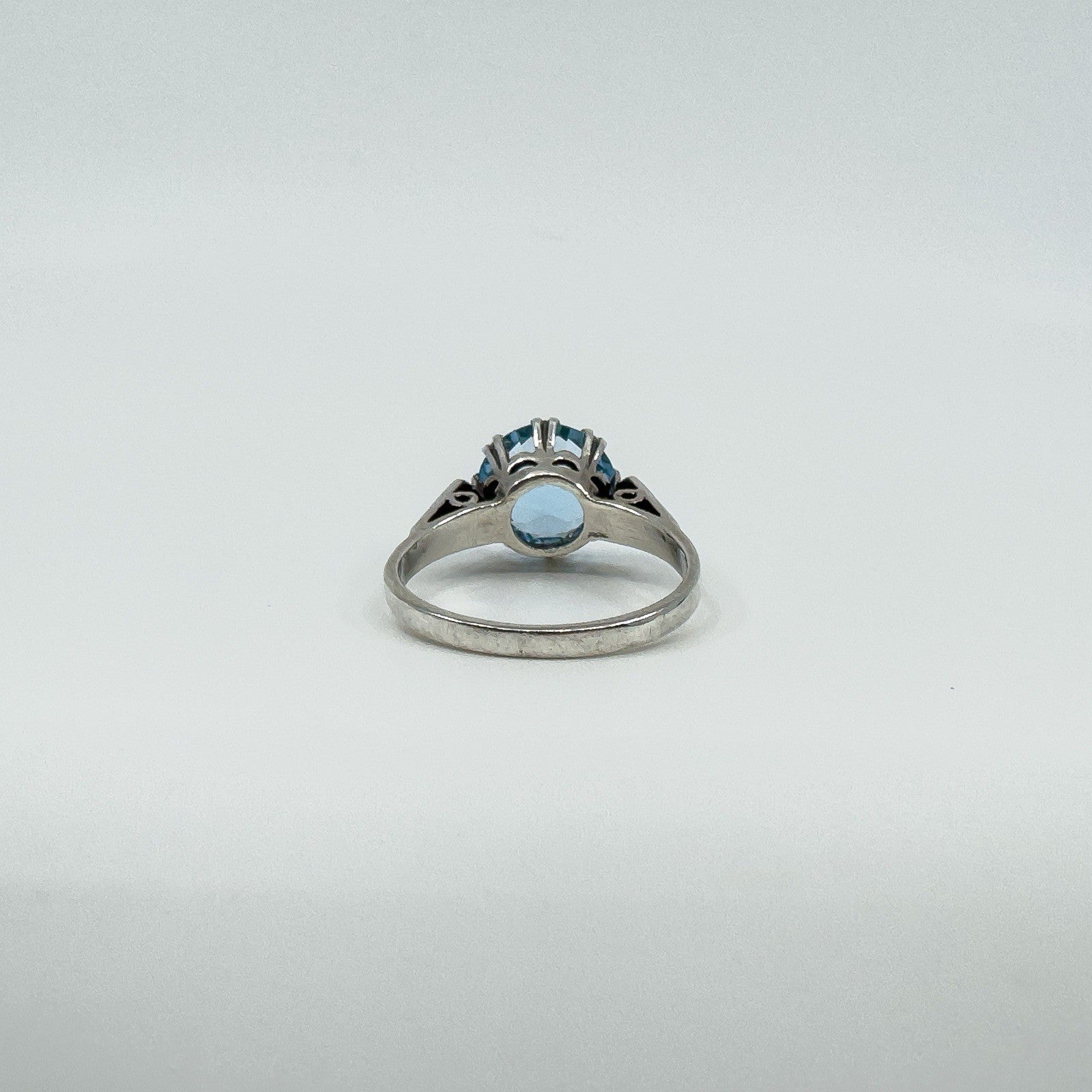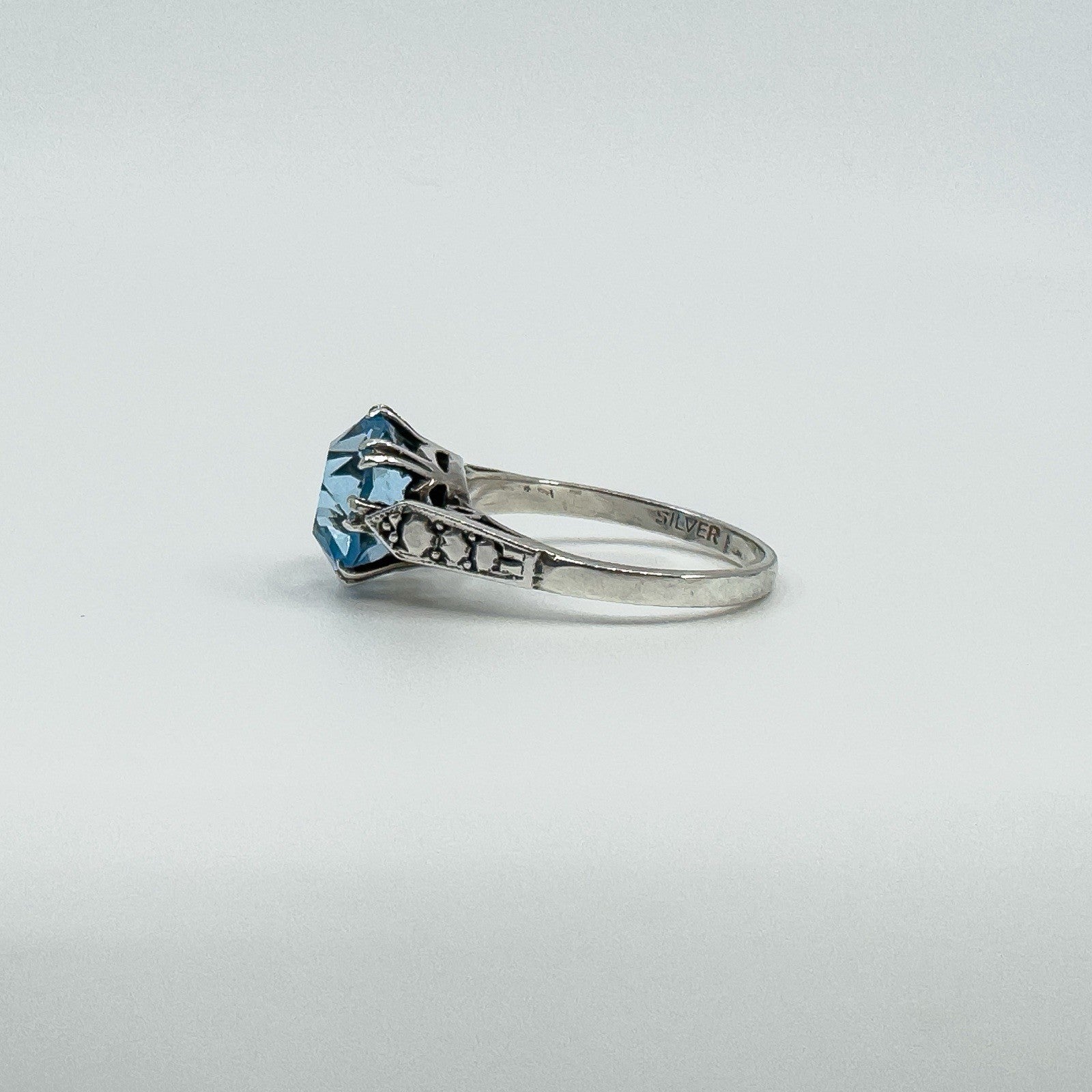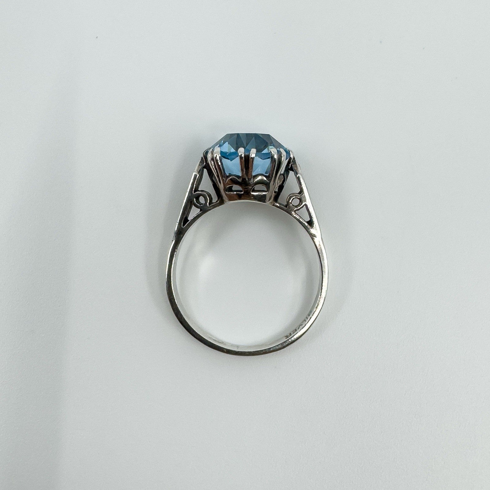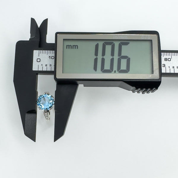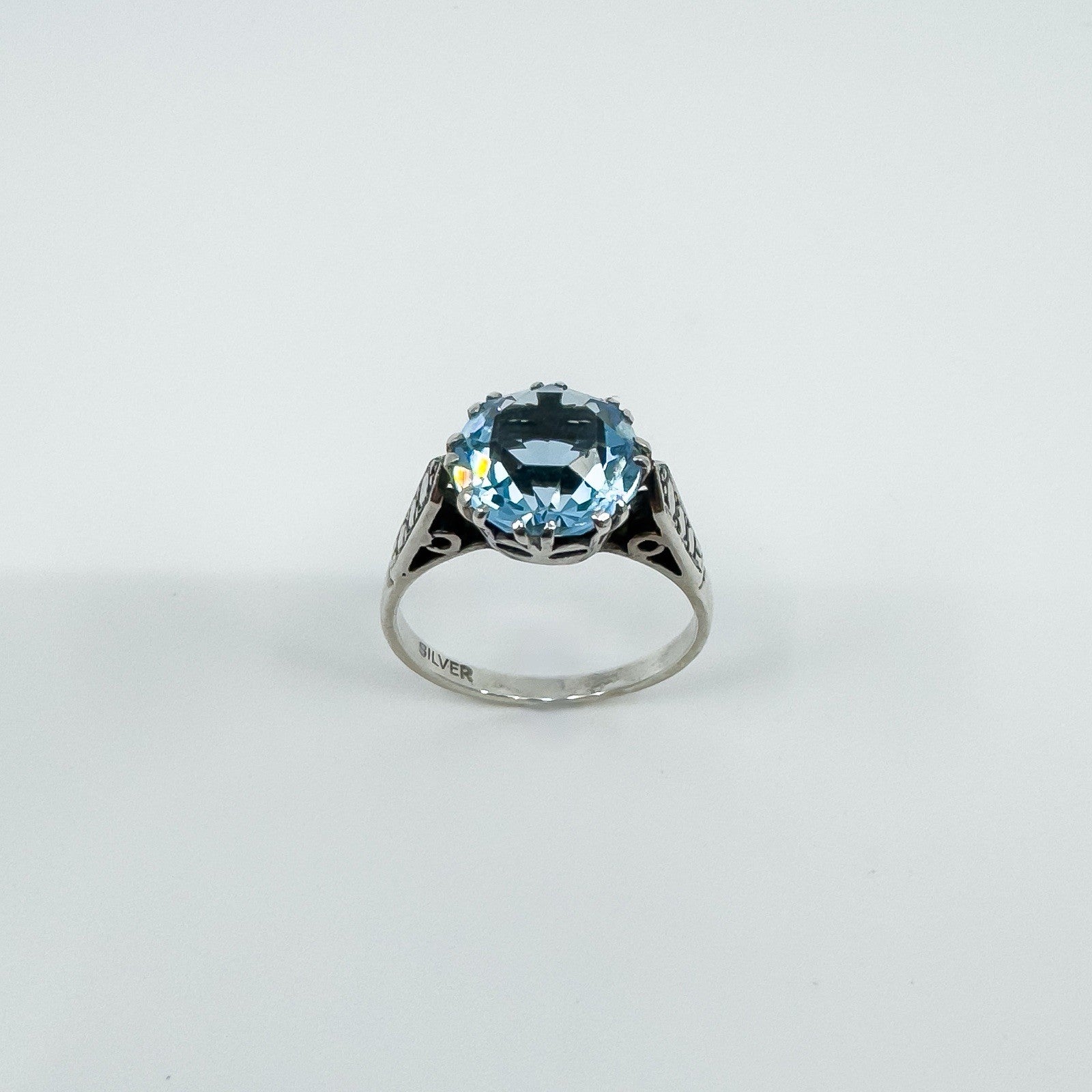• Vintage sterling silver 3.60ct blue topaz solitaire ring • Large blue topaz in high double gallery with 8 double claws • Estimated blue topaz weight approx. 3.60ct • Stamped SILVER • Head of ring measures approx. 10.6 mm • Depth of ring approx. 8 mm (high setting) • Band width on underside approx. 1.9 mm • Ring weight approx. 3 g • Ring size N 1/2 (UK)