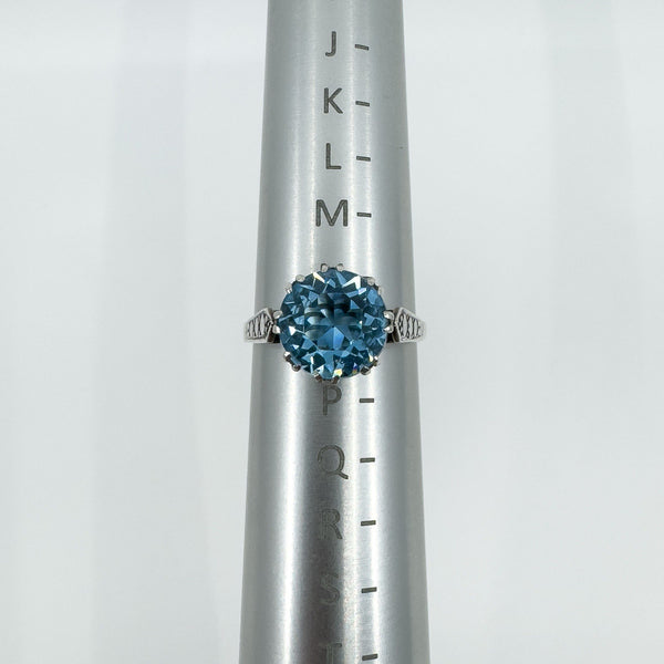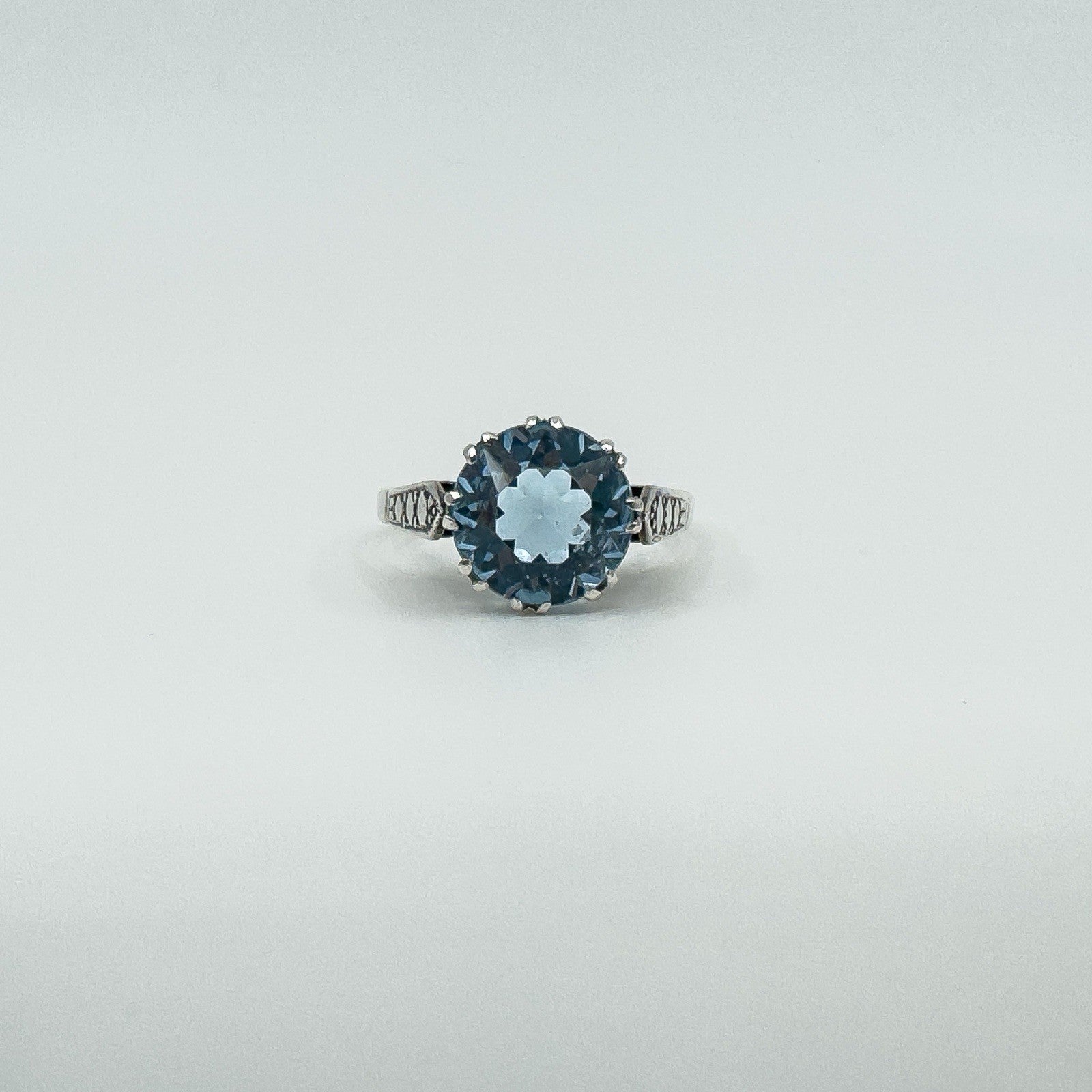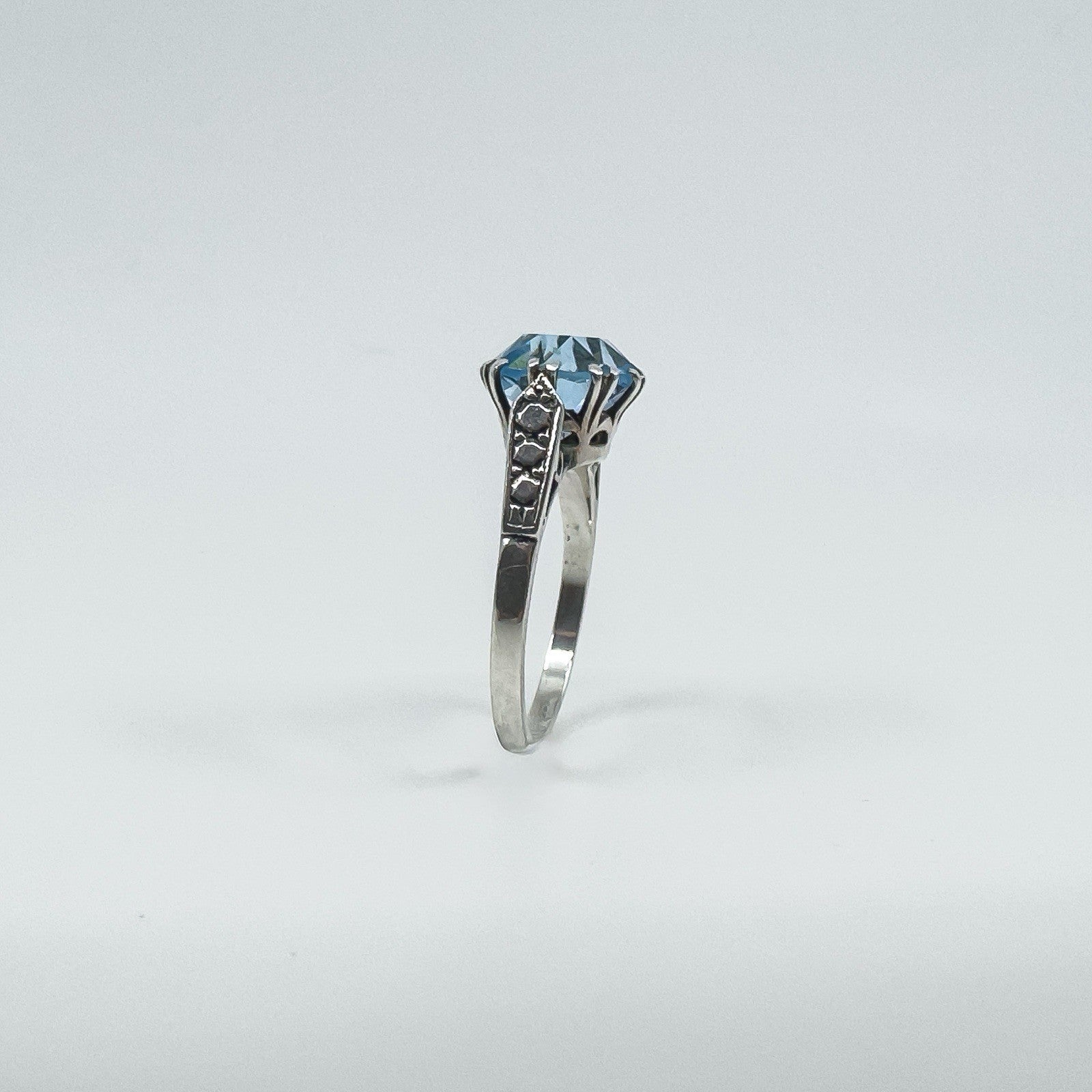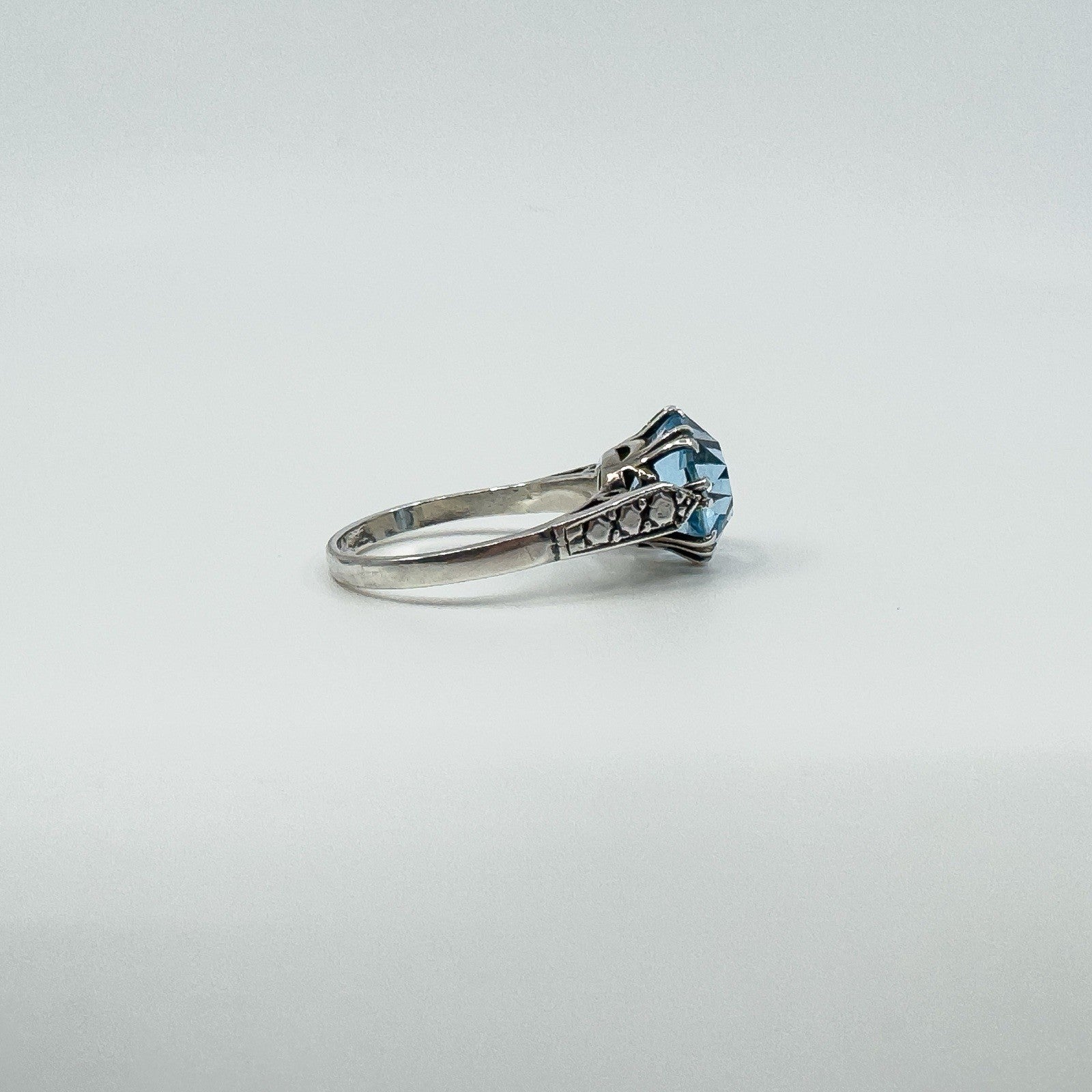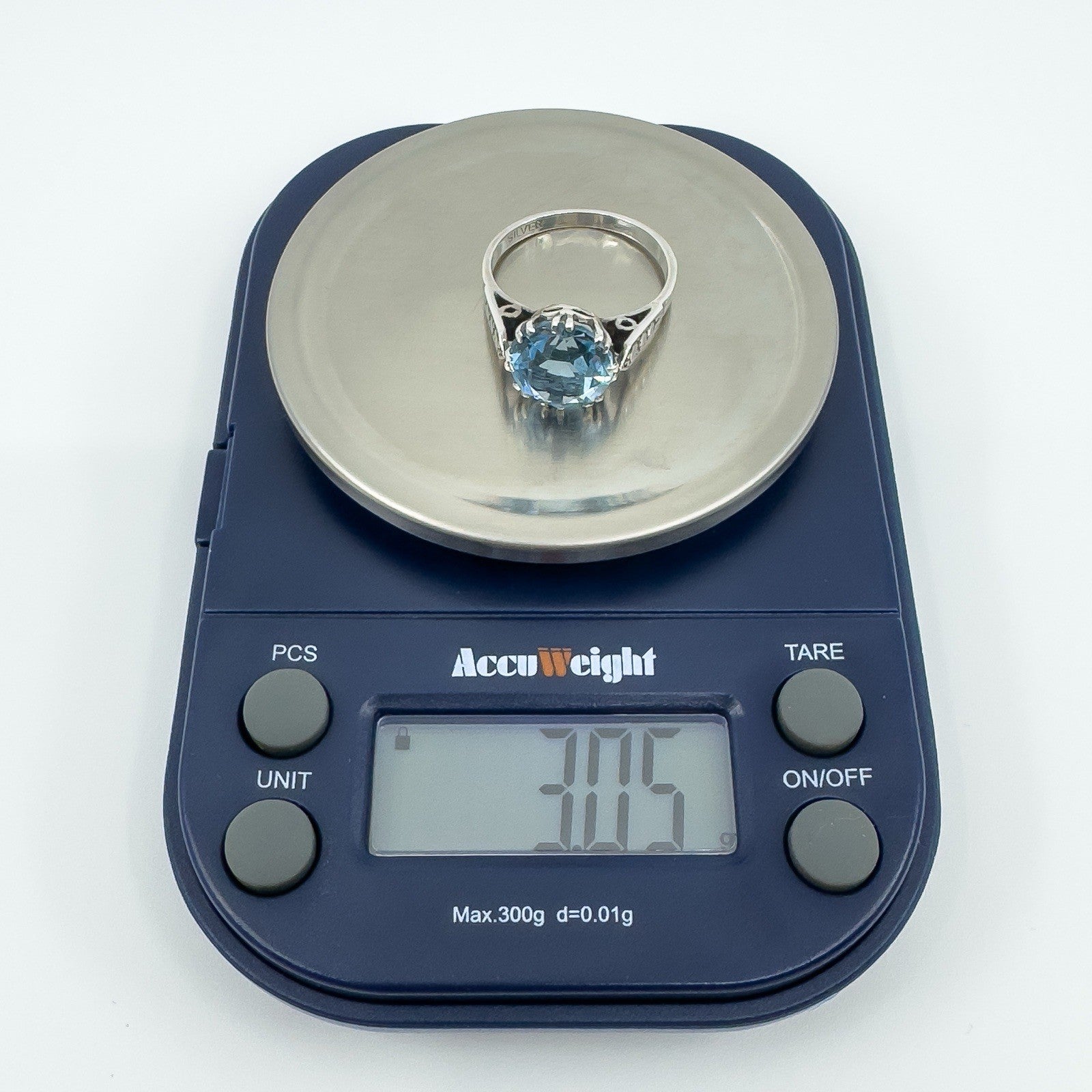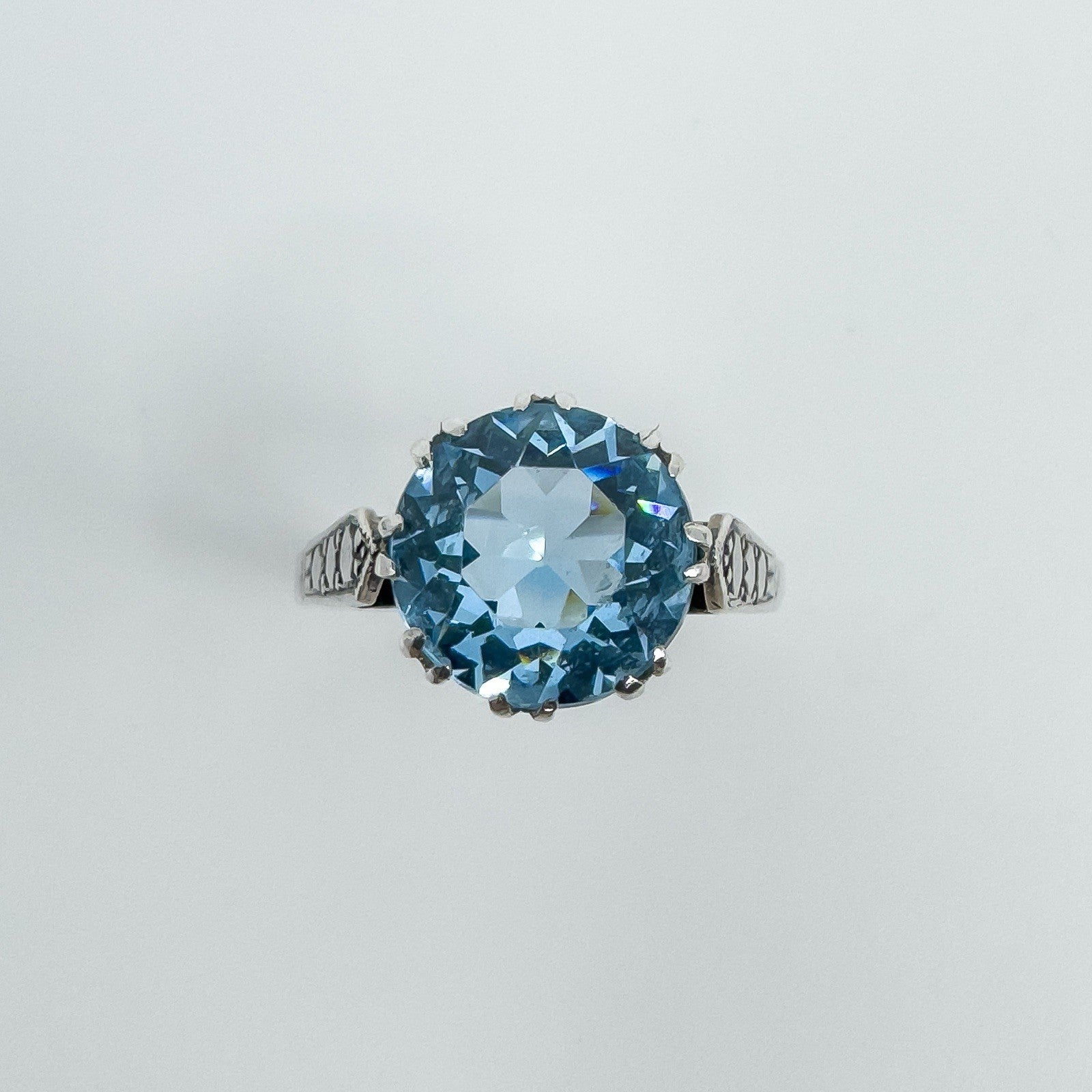 • Vintage sterling silver 3.60ct blue topaz solitaire ring • Large blue topaz in high double gallery with 8 double claws • Estimated blue topaz weight approx. 3.60ct • Stamped SILVER • Head of ring measures approx. 10.6 mm • Depth of ring approx. 8 mm (high setting) • Band width on underside approx. 1.9 mm • Ring weight approx. 3 g • Ring size N 1/2 (UK)